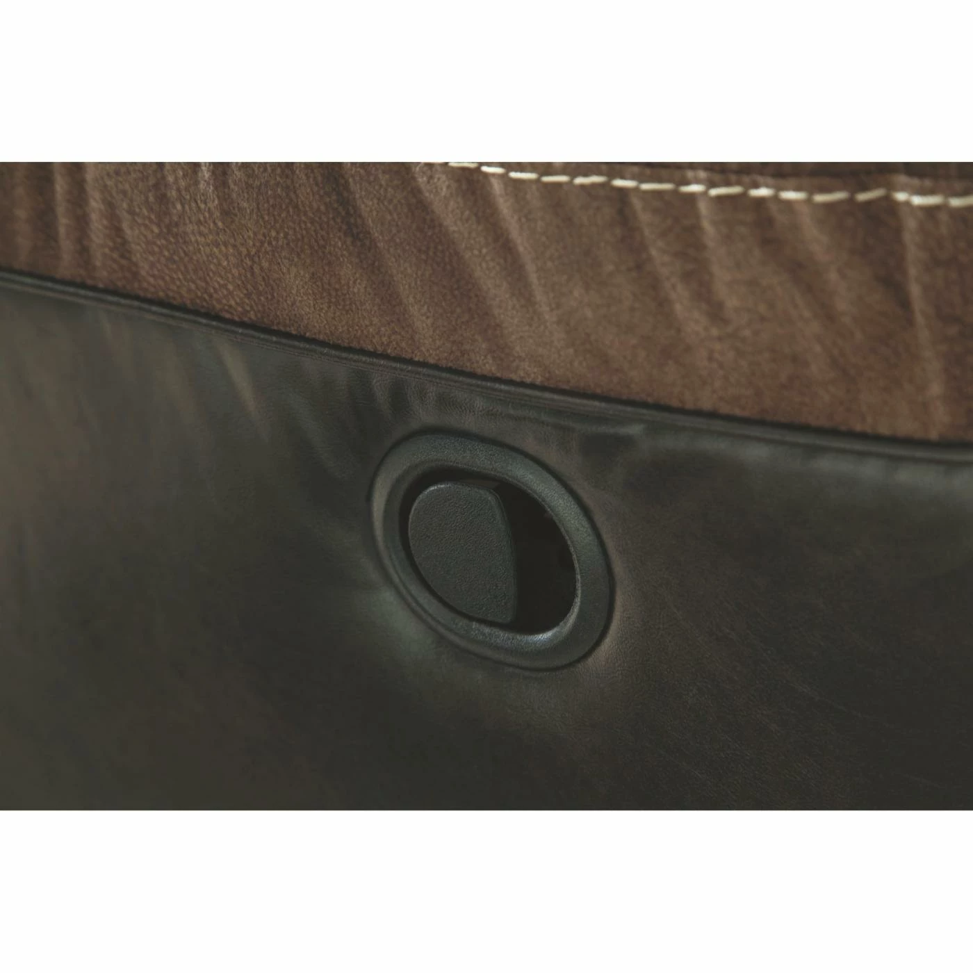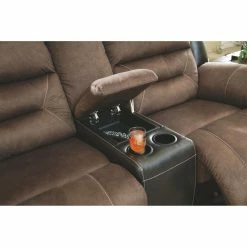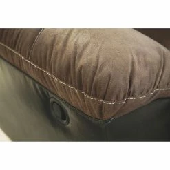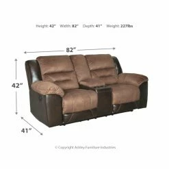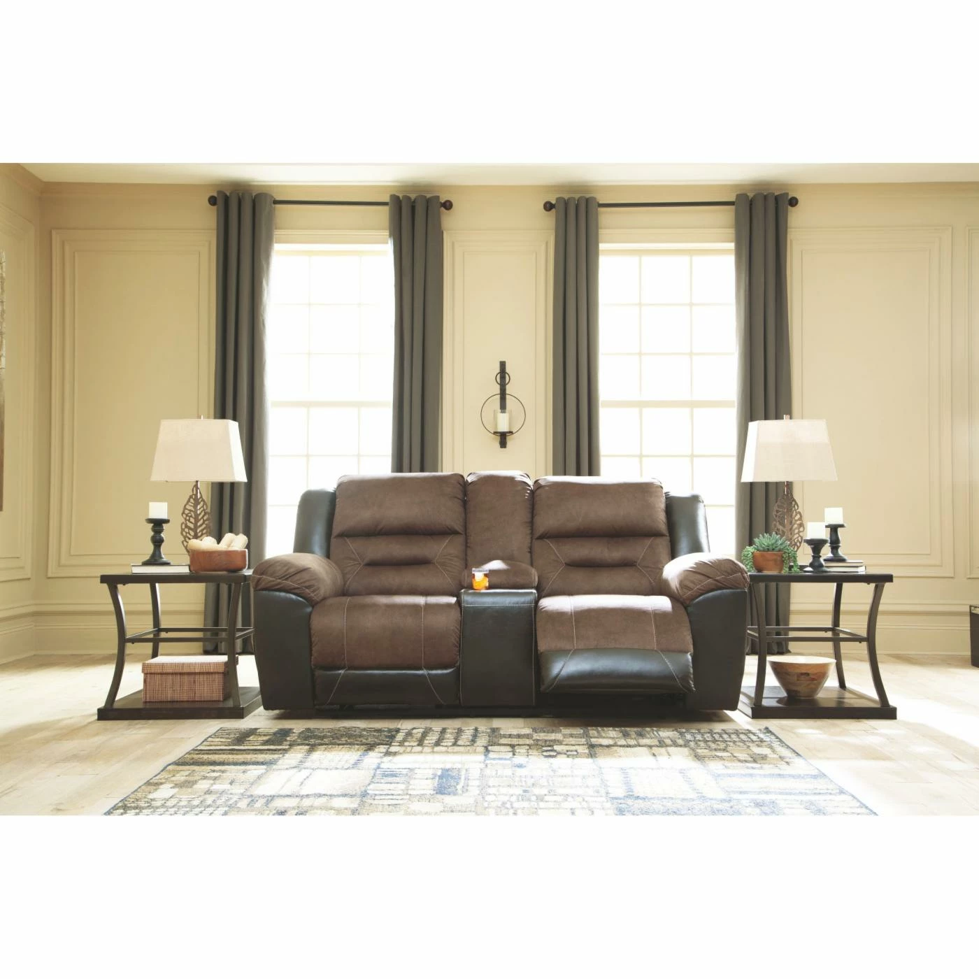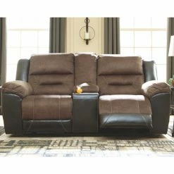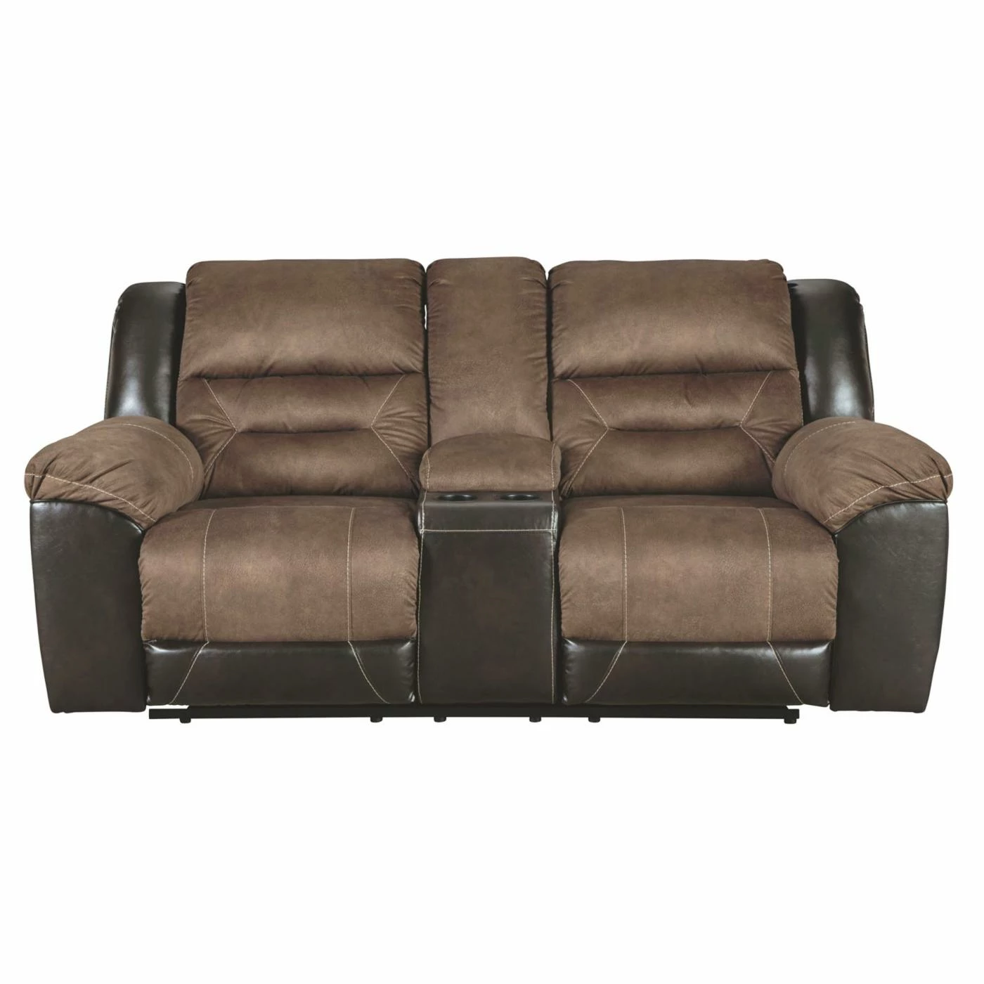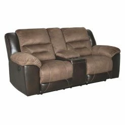 The Signature Design by Ashley Earhart Double Reclining Loveseat with Console makes it easy for you and your spouse to relax together. This reclining loveseat has two seats connected by a lift-top storage console and two cupholders – one for each of you. The chair combines a soft suede-like feel on the seats and arms with the bold look of faux leather on the edges. The suede-like upholstery on the arms, cushions, and inside back is made from 95% polyester and 5% polyurethane. The upholstery on the rest of the chair’s exterior is made from polyester, polyurethane, and PVC. A pull tab on each side makes reclining easy.