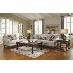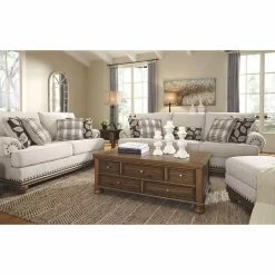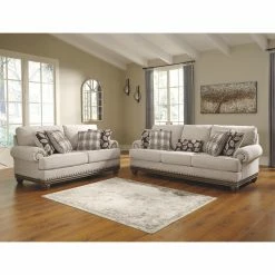 Patterned after vintage furnishings, the Signature Design by Ashley Harleson Loveseat adds a timeless touch to seating areas. The rolled arms and exposed wood trim are accented by oversize nailheads in a design inspired by antique designs. Herringbone-woven polyester upholstery gives the sofa a luxurious textural effect and is applied over high-resiliency foam cushioning for comfort. Elegant, turned wood bun feet support the strong corner-blocked wood frame.