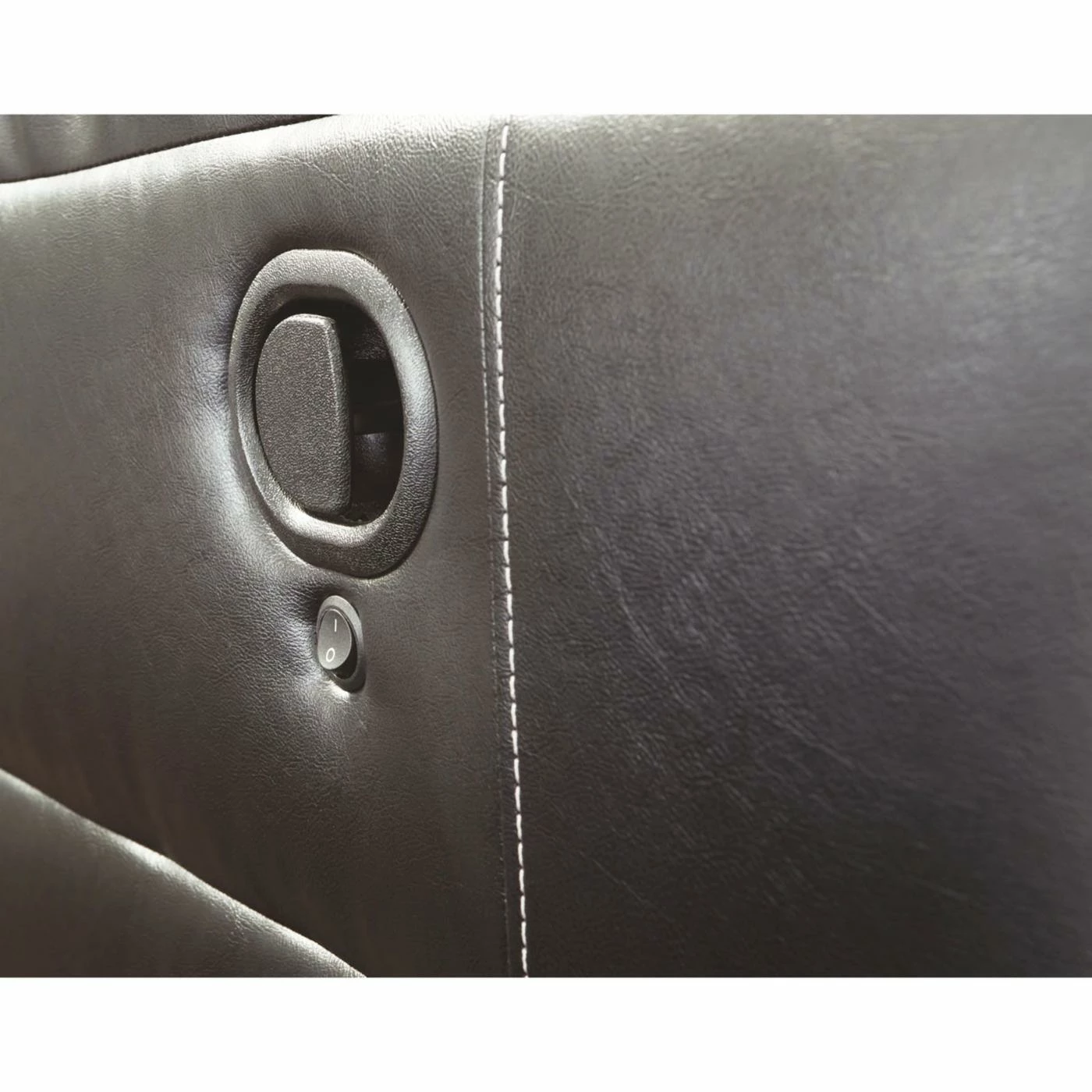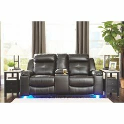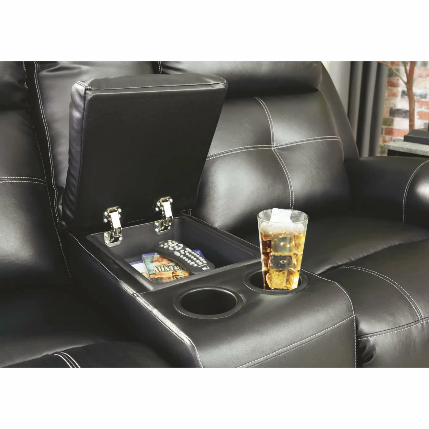 A lift-top storage console between the two seats reveals a hidden storage area for holding remote controls, movies, and charging cords. There are also two cupholders to give you easy access to your favorite beverage while you relax in front of the television or with guests.
