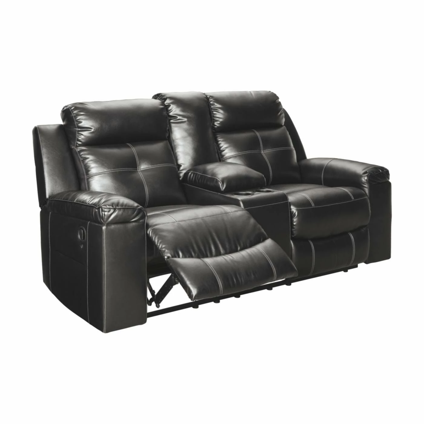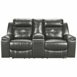 Stress is no match for the Signature Design by Ashley Kempten Double Reclining Loveseat with Console‘s thoughtful design and generous padding. This loveseat includes the attention to detail and durability you expect from your Signature Design by Ashley furniture. The piece begins with a corner-blocked frame and metal-reinforced seats to stay strong well into the future. Next, high-resiliency foam cushions wrapped in poly fiber are added to ensure you’re always surrounded by plush comfort.