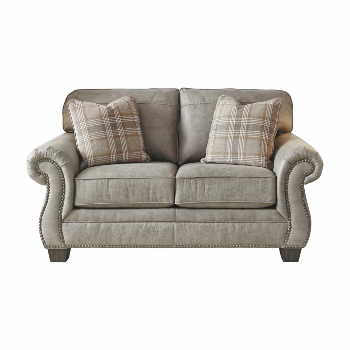 The Signature Design by Ashley Olsberg Loveseat is a luxurious loveseat wrapped in a suede-like steel gray upholstery composed of polyester and polyurethane for easy care and wear. Tailored details include window pane stitching on the attached back cushions and charming nailhead trim along the base and front of the rolled arms. Exposed tapered feet complement the upholstery with a dark faux wood finish. This exquisite loveseat is constructed on a corner-block wood frame and features pocketed coils in the seat cushions. Two included accent pillows feature a brown plaid design that coordinates with the flowing lines of the loveseat.