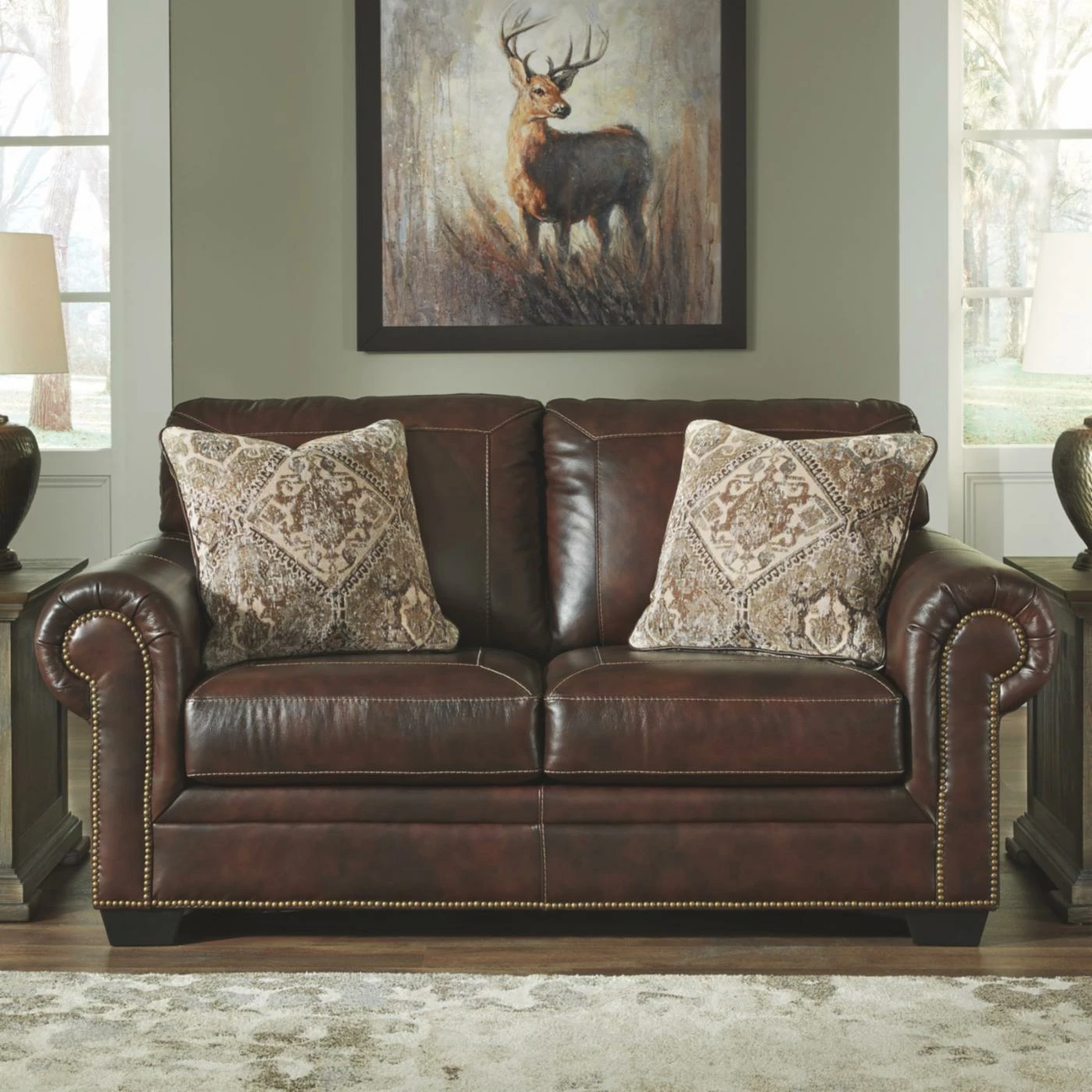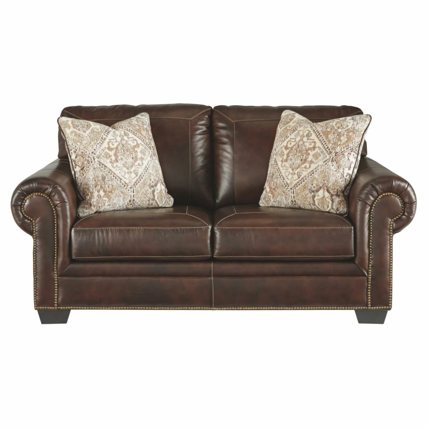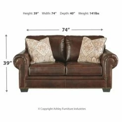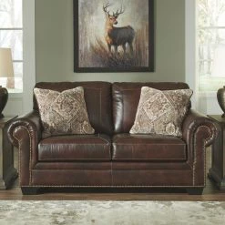 Enjoy the welcoming comfort and traditional style of the Signature Design by Ashley Roleson Loveseat. This two-person loveseat features straight stitched accents and classic nailhead trim details. A pair of accent colors bring a soft touch to the faux leather construction of this loveseat.