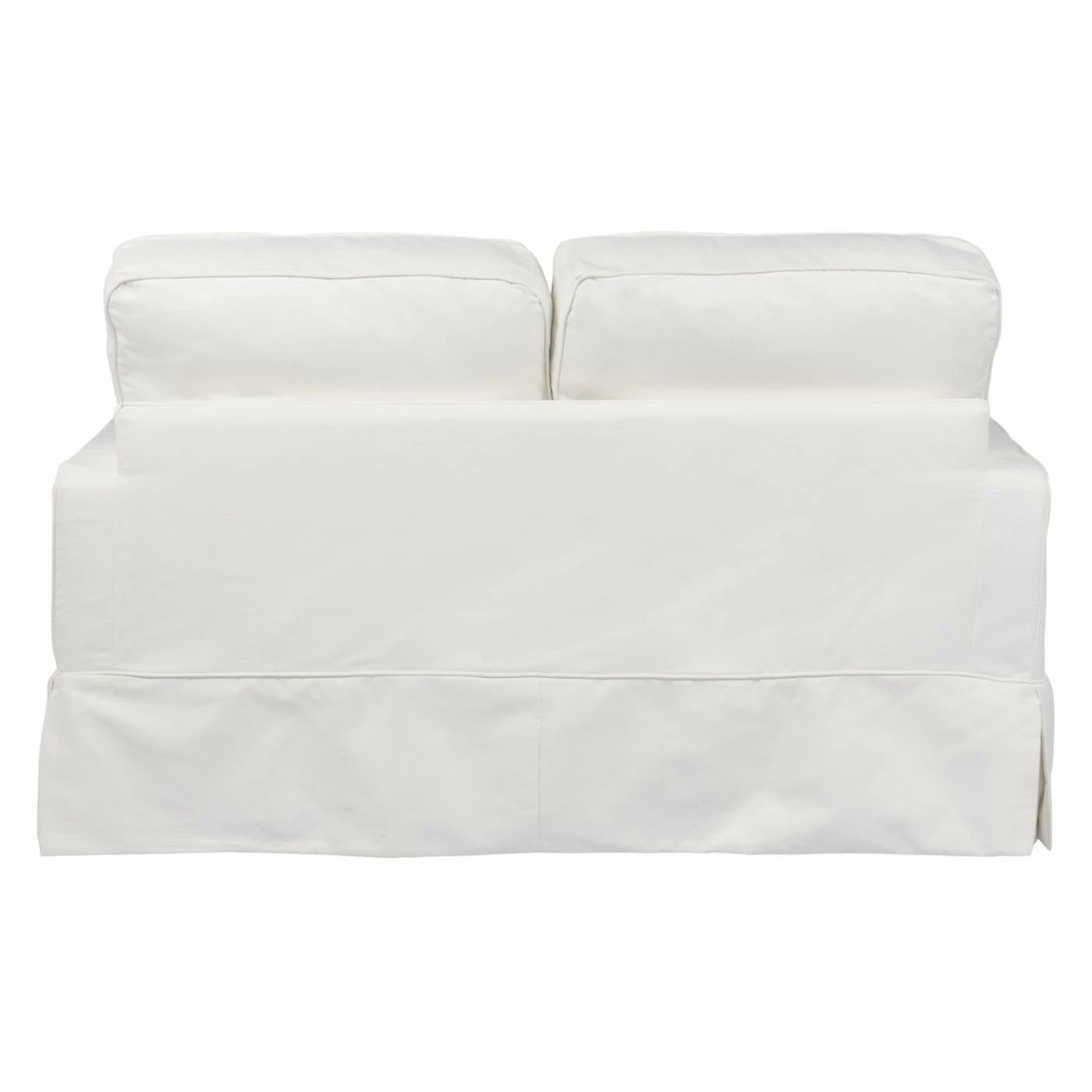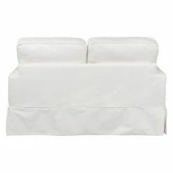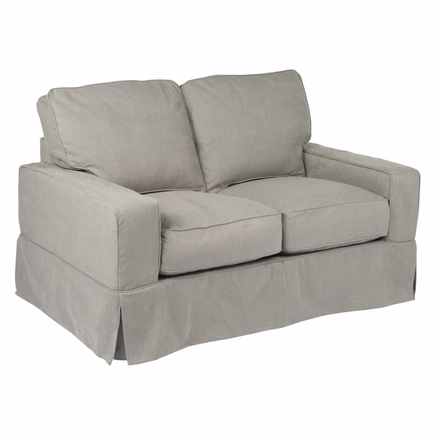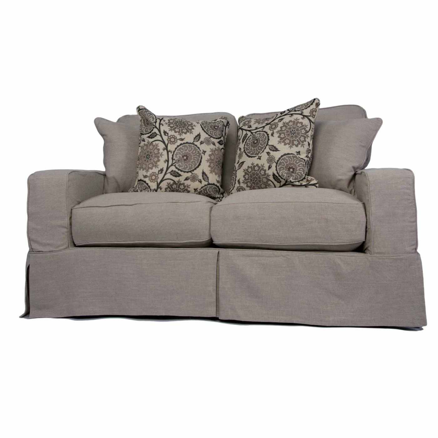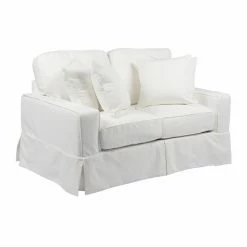 Add a casual vibe and livable comfort to your home with the Sunset Trading Americana Slipcovered Loveseat. The laid back slipcover design and kick pleated skirt creates a crisp, preppy style. Generous arms and welted, box style cushions create a classic silhouette. Polyester blend upholstery comes in a range of color options. This loveseat includes four dashing accent pillows that add style and softness. Two pillows have a solid color and the other two come in a coordinating pattern.