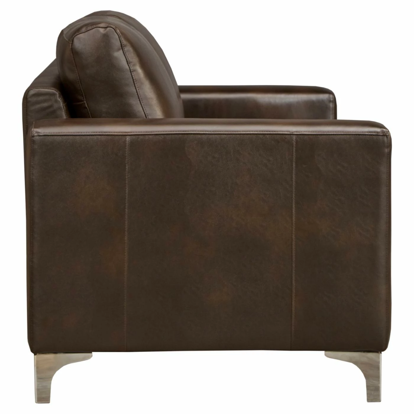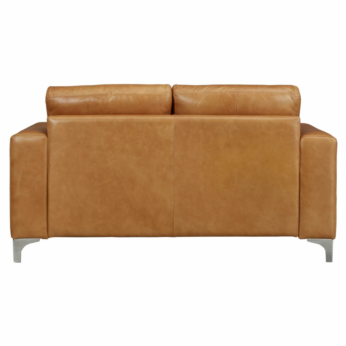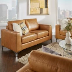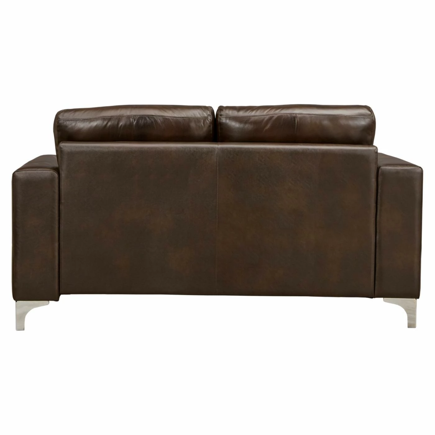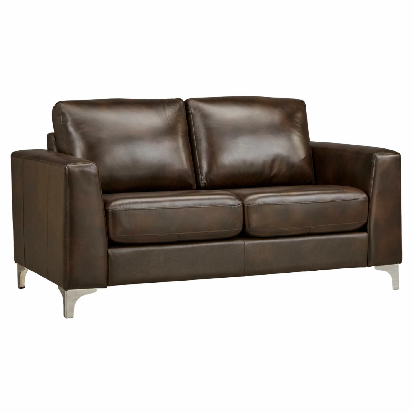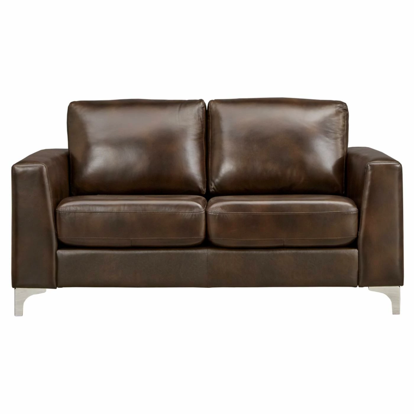 The simple contours of the Weston Home Bronston Aniline Leather Loveseat will provide an opulent, contemporary finish to any sophisticated space. This sofa shows off a European-inspired design with wide, flat arms, and a long, low shape. Deep seating is complemented with thick seat and back cushions filled with polyurethane foam. The supple touch of aniline leather covers every inch of this loveseat. The cushions stay in place with Velcro tabs. Chromed metal feet add a sleek touch of glam to the design. Please choose from available color options.