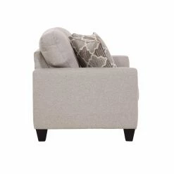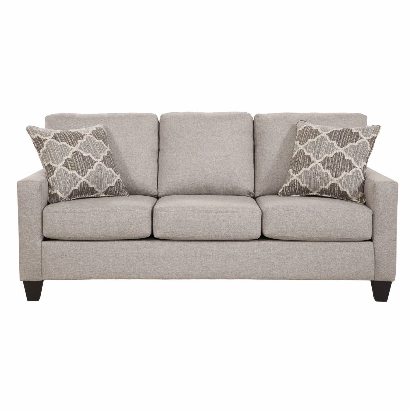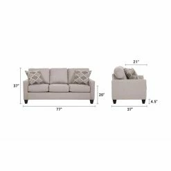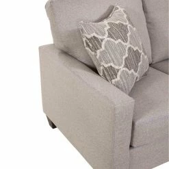 This sofa is an urban loft track arm sofa that is apartment sized. The smaller foot print will fit into any floor plan. The sofa is in a great neutral and natural linen color woven fabric with two Moroccan tile motif pillows in shades of gray and brown. This sofa utilizes Revolution Performance fabrics. The back pillows are attached and the seat cushions are non-reversible. This allows everything to stay in place. Clean crisp lines for a modern appeal. This sofa can seat three comfortably and comes with two accent pillows.