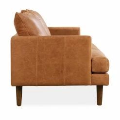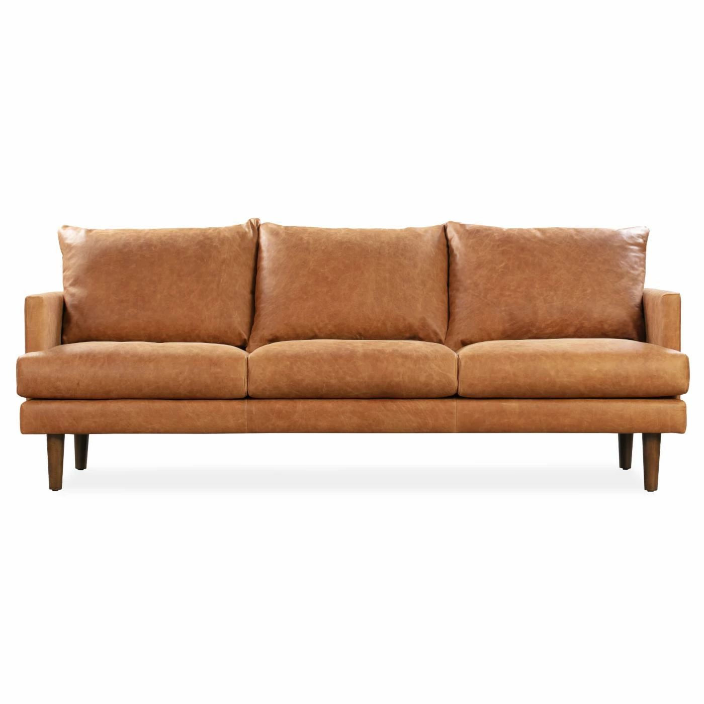 Introducing a signature piece that makes a seriously stylish impact. Our Poly & Bark Girona Leather Sofa is crafted with full-aniline dyed Italian tanned leather upholstery that’s buttery soft and brimming with authentic character as a result of natural hide markings, and it only gets better with time as scuffs become part of its vintage patina. Its durable corner blocked wood frame with reinforced joinery is all kiln-dried to deter warping. Robust high-density foam cushions are topped in feather down for extra comfortable seating. Strong Pirelli webbing offers the ultimate support and its peg-profile legs in a walnut finish help to ensure this versatile sofa adds luxurious allure to your living room for ages to come.