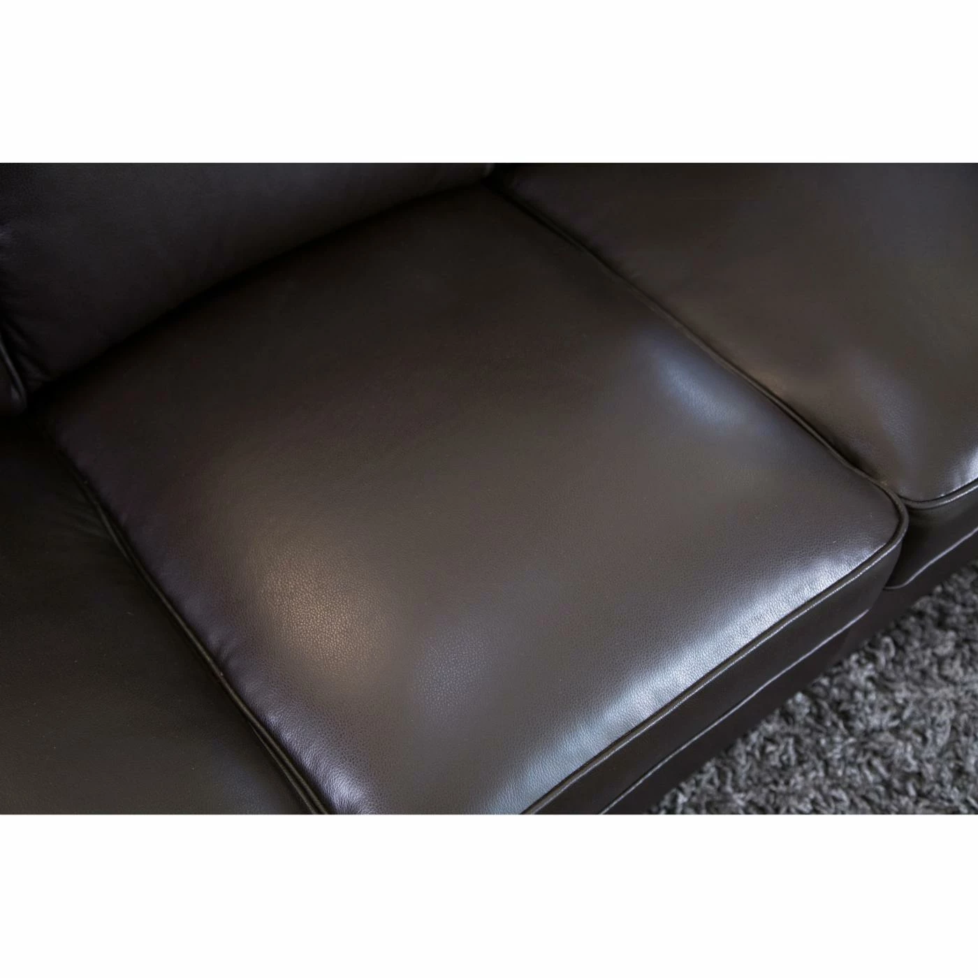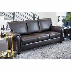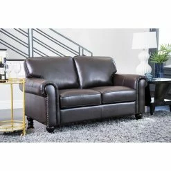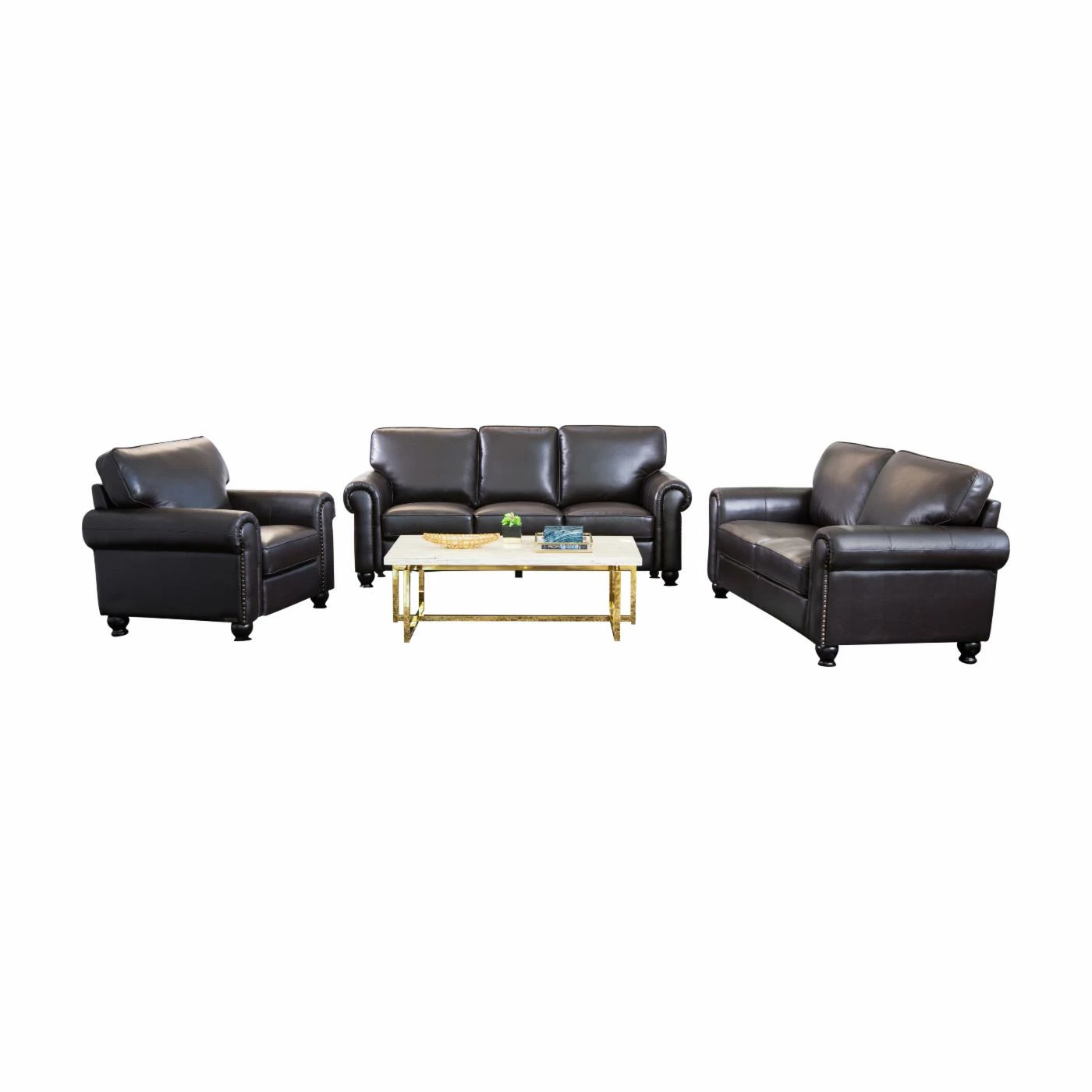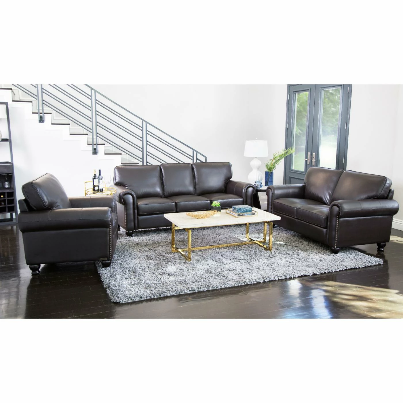 Create a sophisticated living room with the Abbyson Bellagio 3 Piece Sofa Set. This set includes a sofa, loveseat, and arm chair. Each piece has a kiln-dried hardwood frame and high-density foam cushions. Upholstered in dark brown, faux leather, this set adds a luxe feeling to any room. English rolled arms, hand-stitched details, and brass nailhead trim add visual interest and give the set an elegant look. You can comfortably seat up to six people with this set. With its supple leather and classic silhouettes, this three-piece set is a wonderful addition to any home.