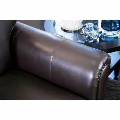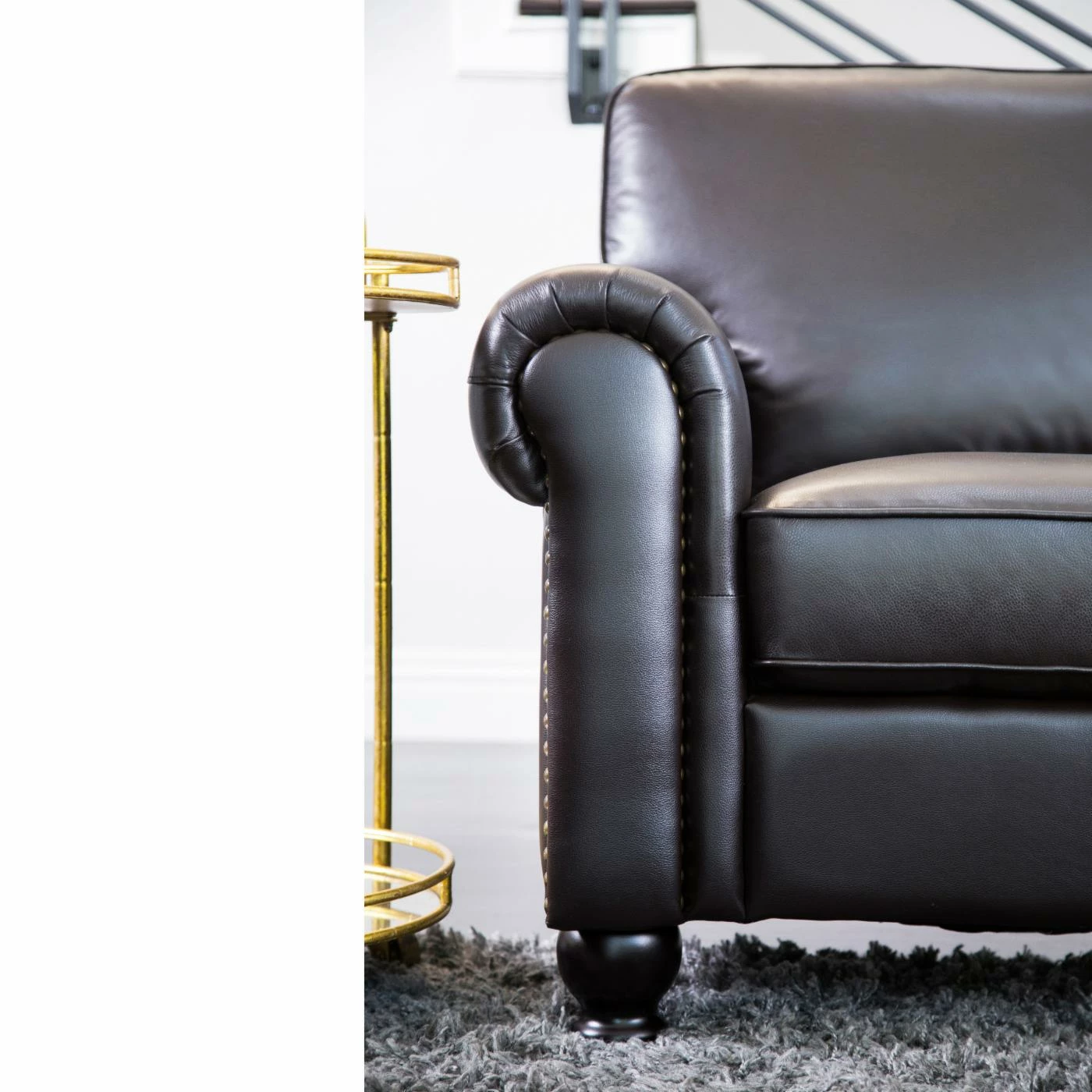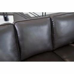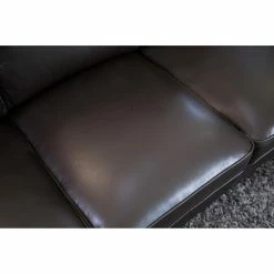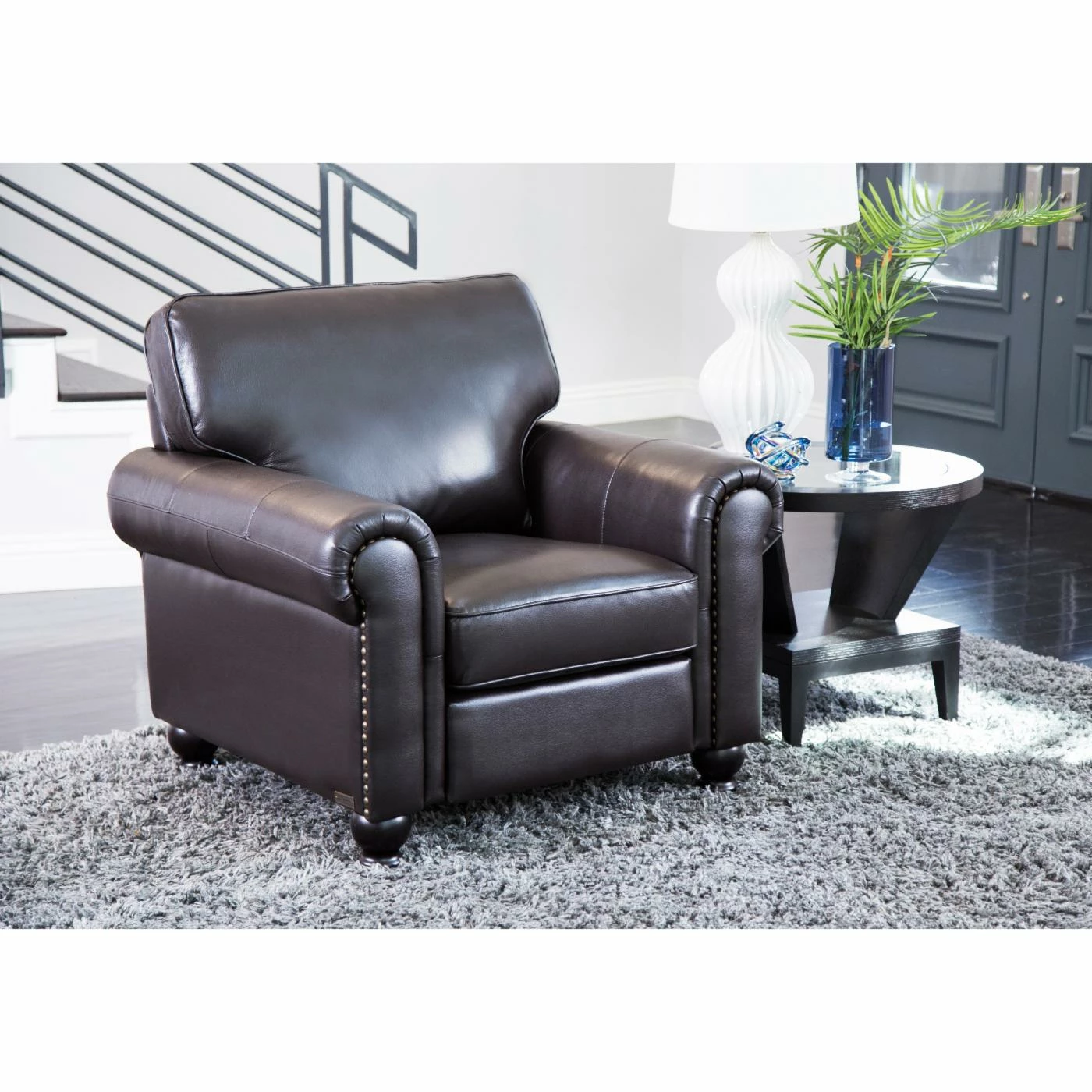 Create a sophisticated living room with the Abbyson Bellagio 3 Piece Sofa Set. This set includes a sofa, loveseat, and arm chair. Each piece has a kiln-dried hardwood frame and high-density foam cushions. Upholstered in dark brown, faux leather, this set adds a luxe feeling to any room. English rolled arms, hand-stitched details, and brass nailhead trim add visual interest and give the set an elegant look. You can comfortably seat up to six people with this set. With its supple leather and classic silhouettes, this three-piece set is a wonderful addition to any home.