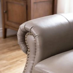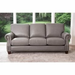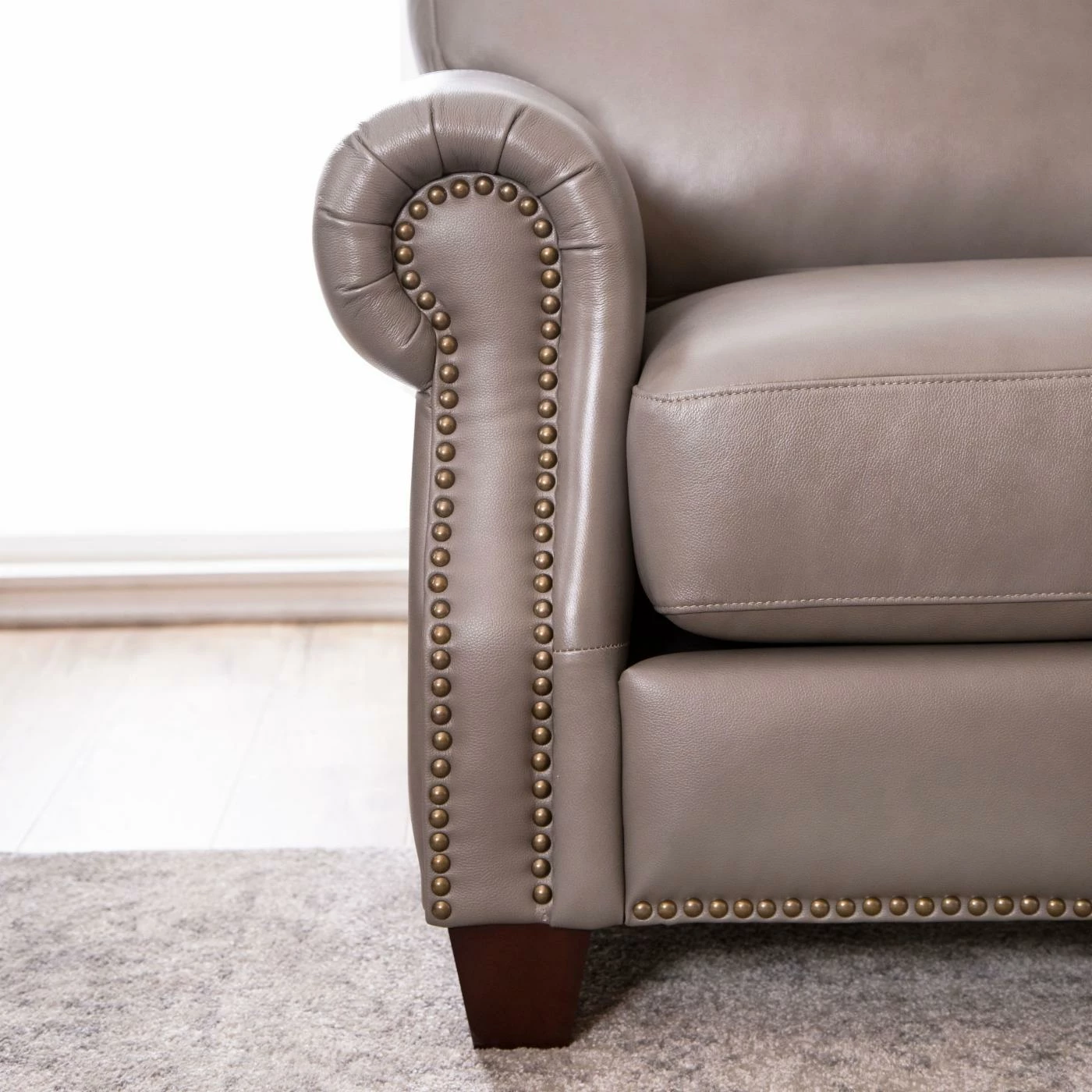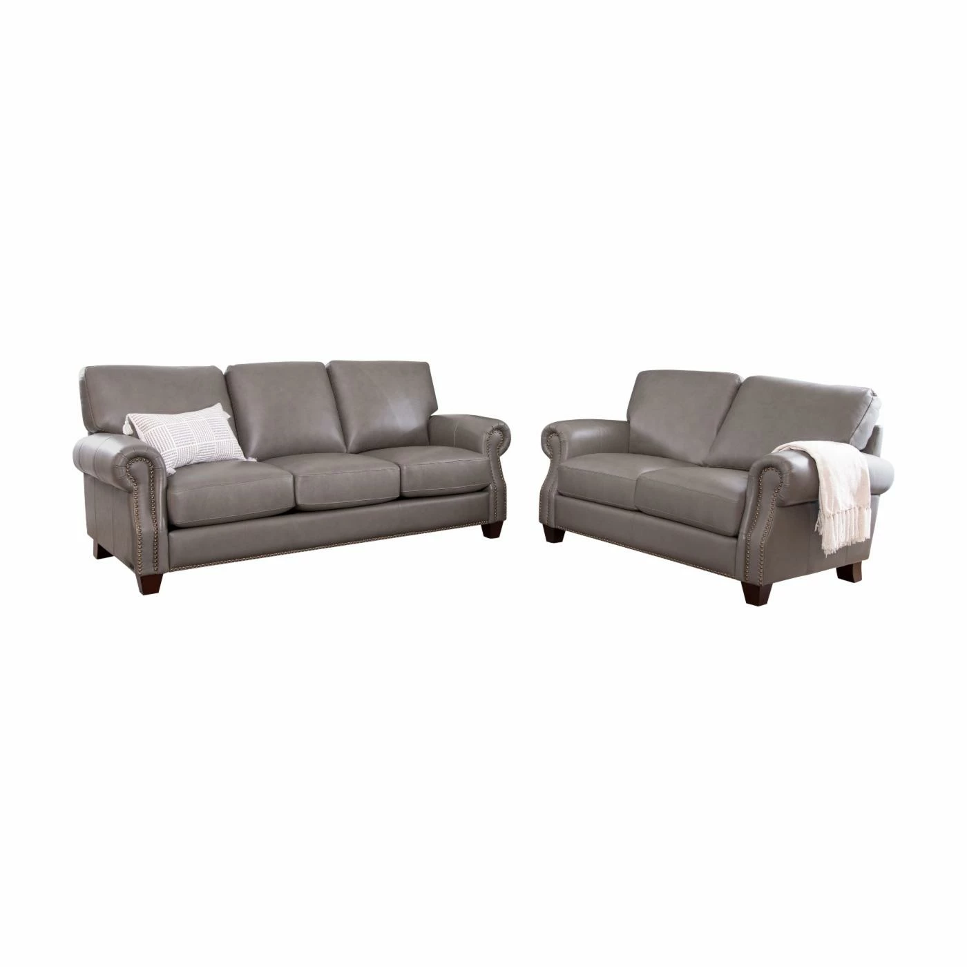 Create a stylish living room or family room with the Abbyson Landon 2 Piece Sofa and Loveseat Set. Each piece is upholstered in gray, top-grain leather. Hand-stitched details and English rolled arms add visual interest to the sofa and the loveseat. Brass nailhead trim lines the arms and bottom edge of each piece. With its neutral color scheme and classic design, the Abbyson Landon 2 Piece Sofa and Loveseat Set goes with a variety of home dΓ©cor styles.