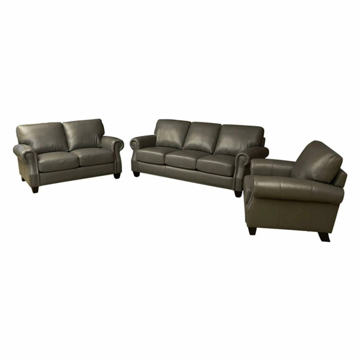 Bring luxury and unsurpassed comfort into your home with the Abbyson Lister Grey Leather Sofa Set. Top grain leather upholstery in gray goes with any dΓ©cor and transforms your living room into the perfect place for entertaining and spending time with family. Each piece has a durable, kiln-dried wood frame and high-resiliency 2.0-density foam cushioning wrapped in a Dacron fill to create a plush, supportive place to relax that’ll withstand the rigors of everyday use. Blending the best of modern and classic design, this set can be used in any setting. The decorative stud work on each piece brings the entire look together, giving you a living room set you’ll love.
