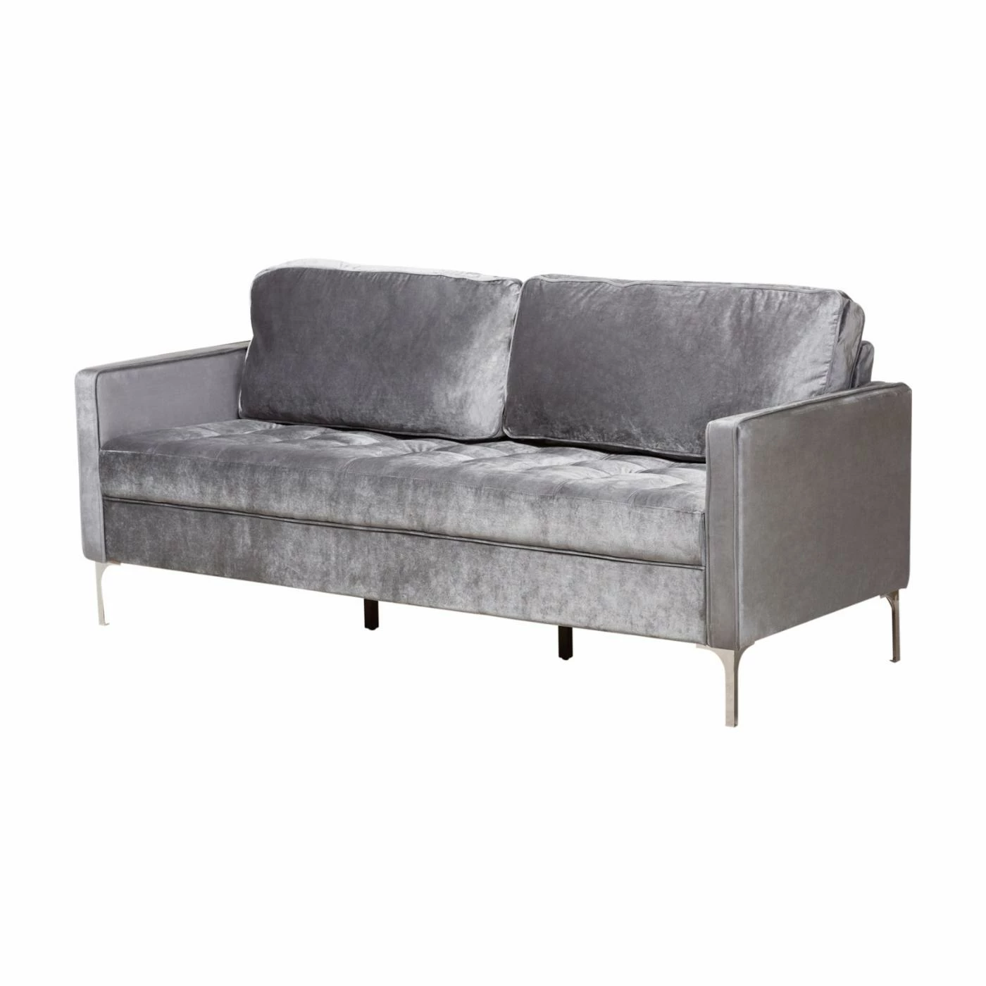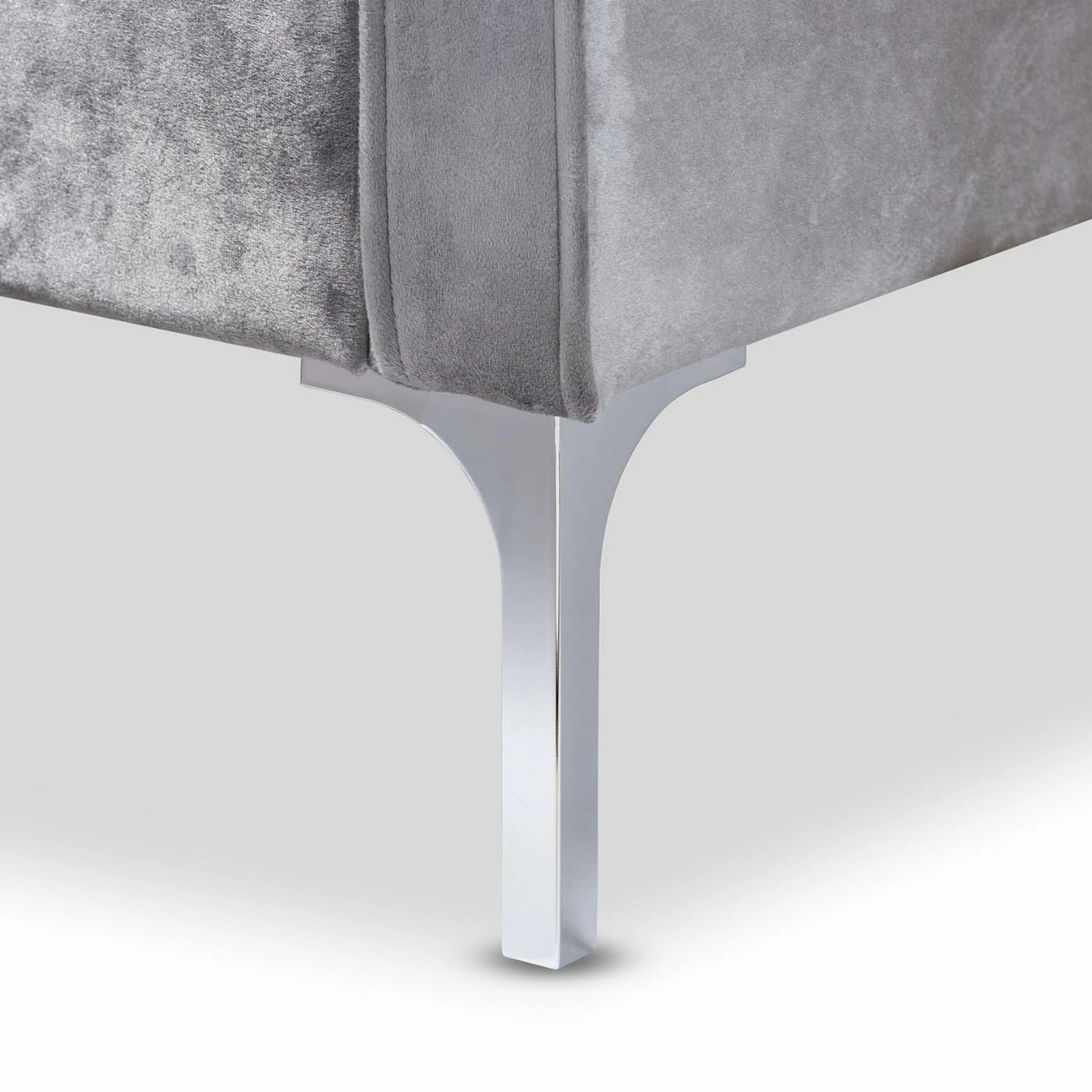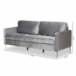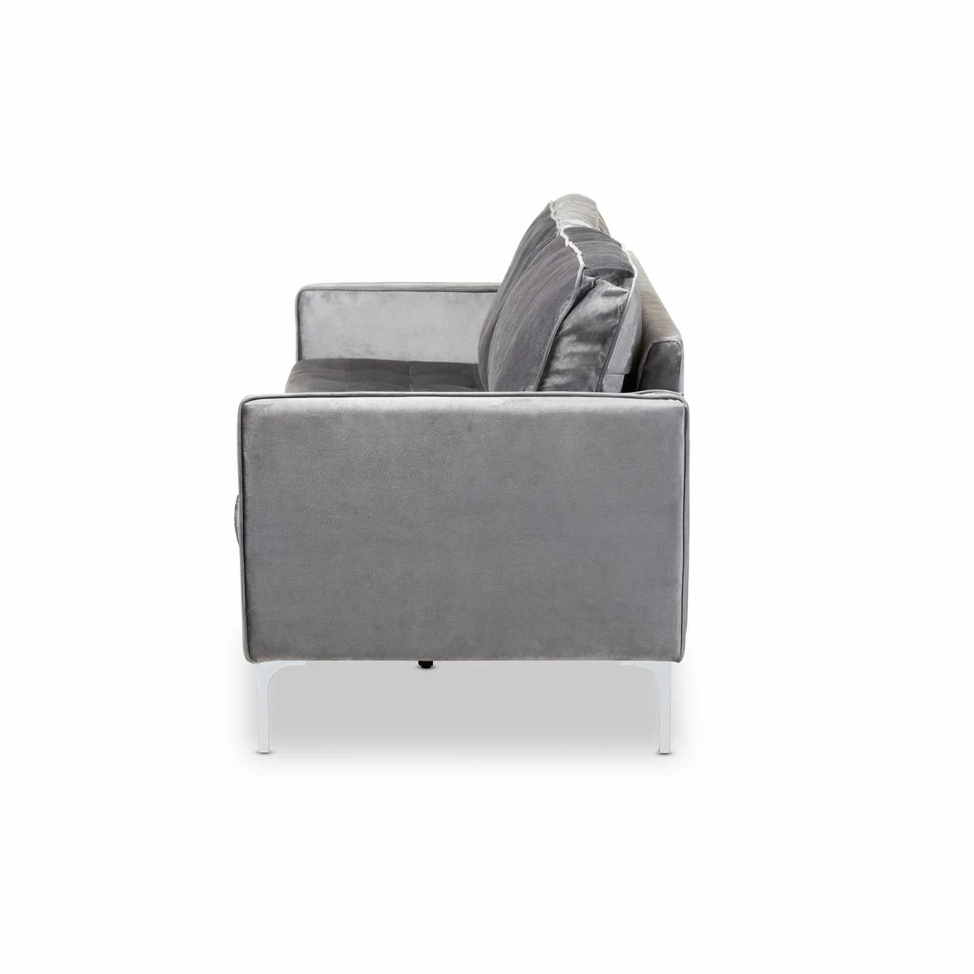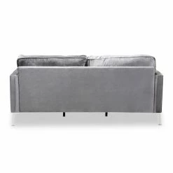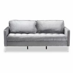 Sleek velvet gives the Baxton Studio Clara Gray Velvet Sofa a classic vintage feel with a touch of modern flair. Crafted from metal, the legs are finished in a bright chrome color to complement the gray upholstery. This sofa is crafted from engineered wood and rubberwood for durability, and padded with foam for a plush texture that retains its comfortable shape.
