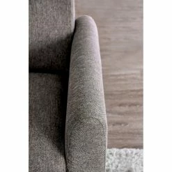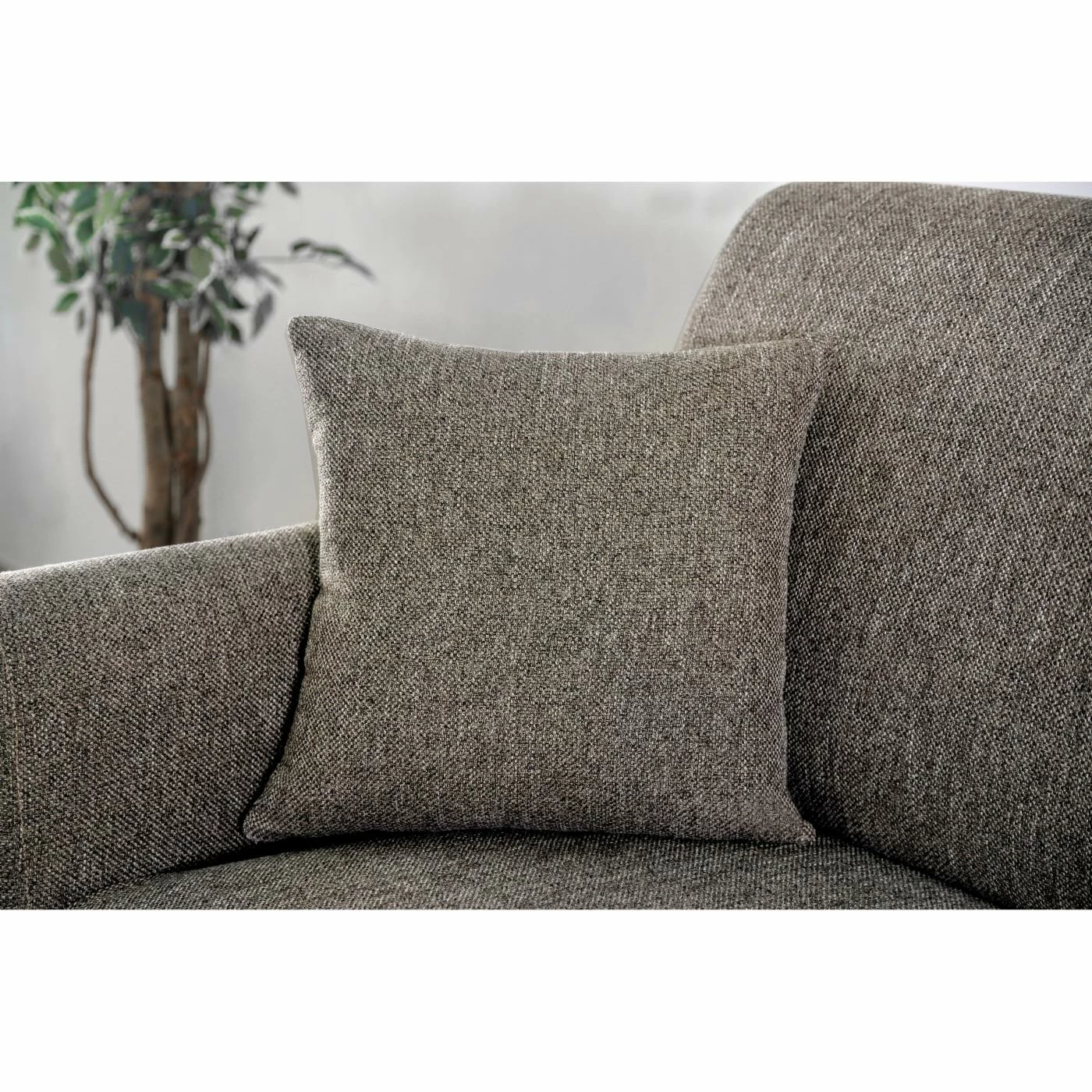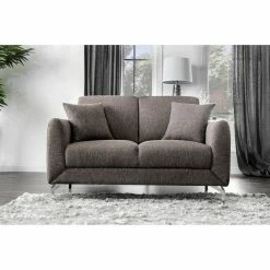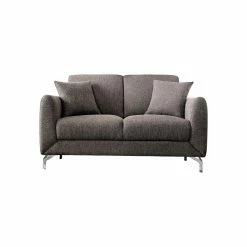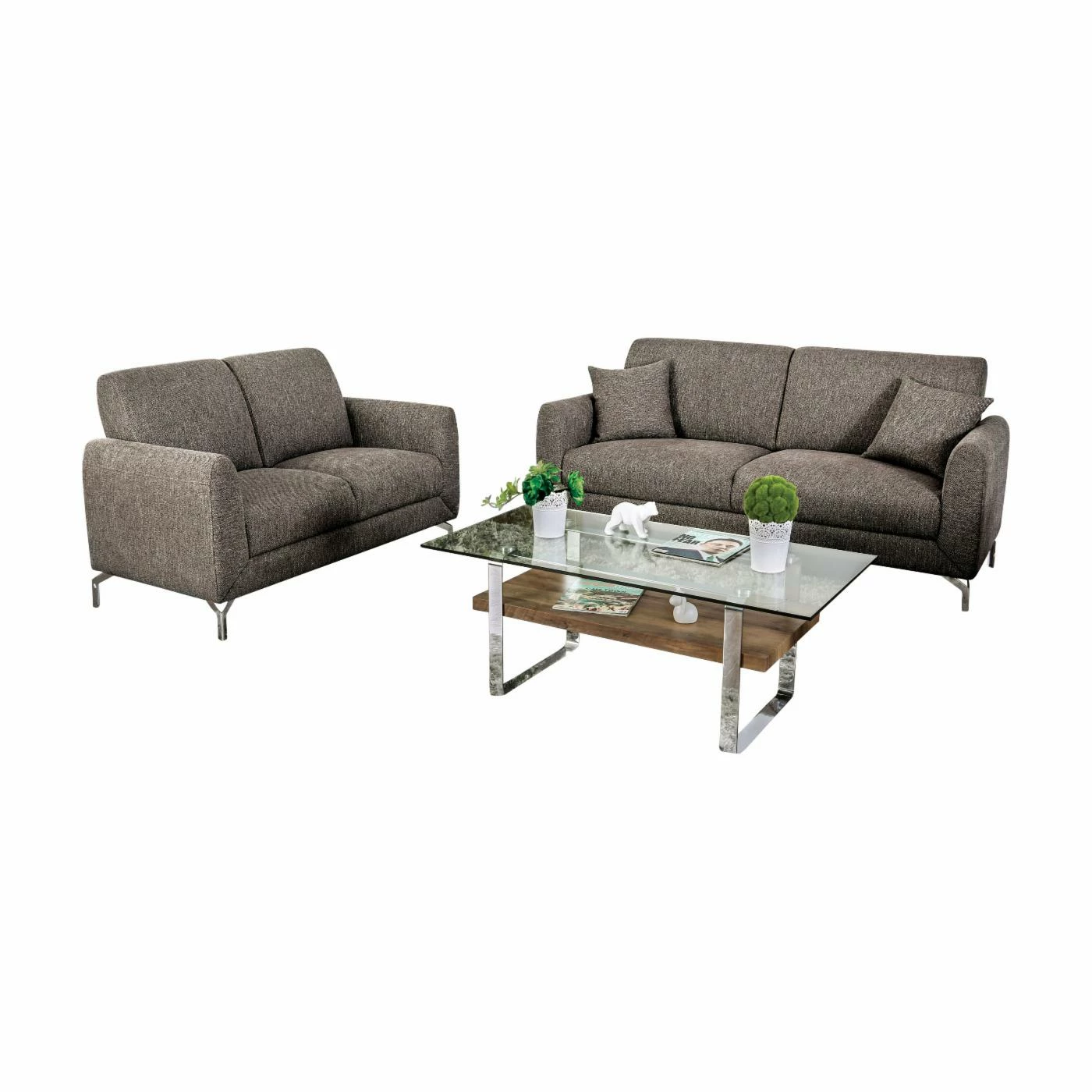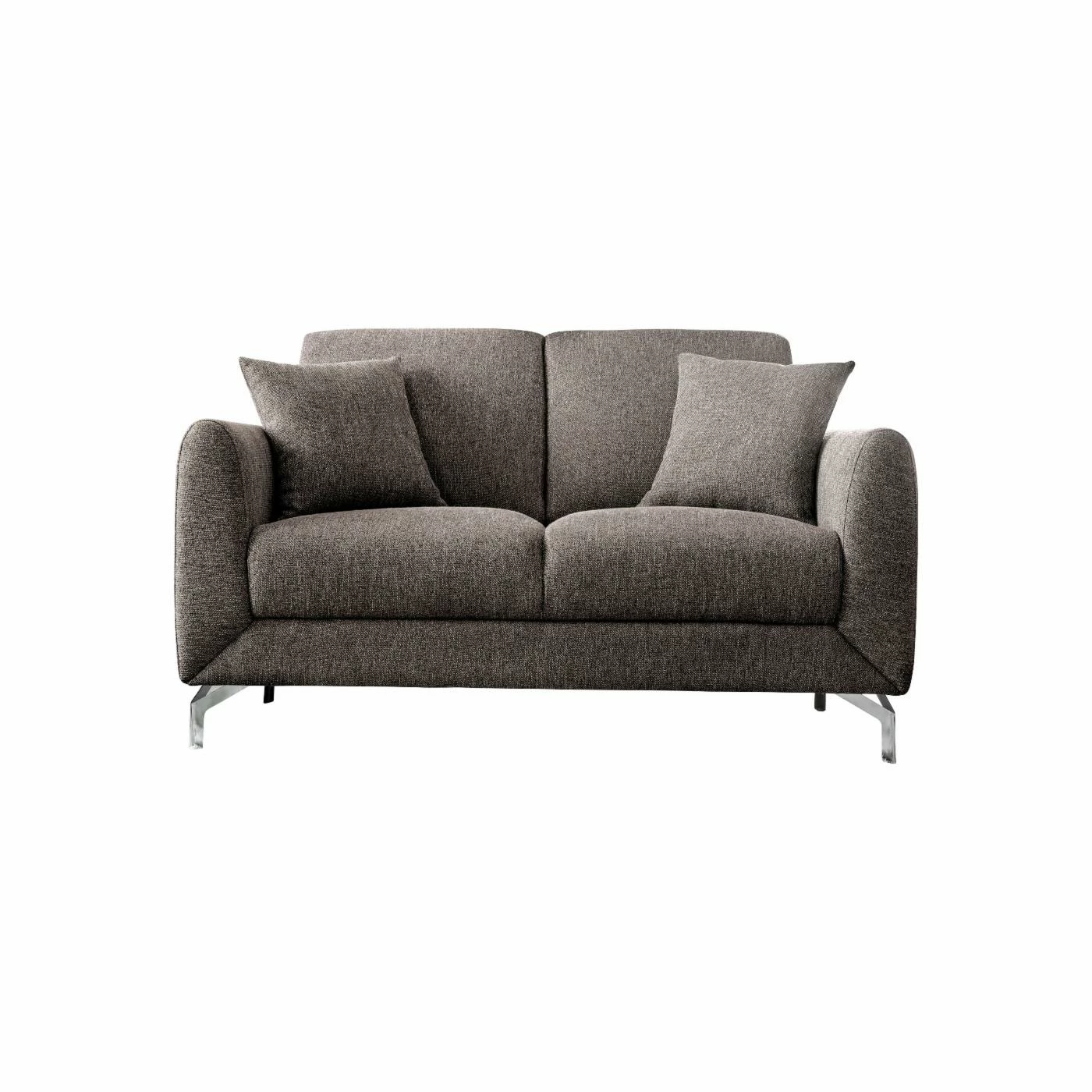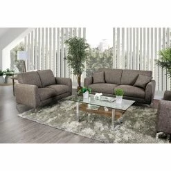 Smarten up your living room with the Furniture of America Calla 2 Piece Sofa Set. Contemporary style points include rounded arms, a tailored look, and brown linen-like upholstery fabric that matches any dΓ©cor. This set includes a roomy sofa, two-seater loveseat, and matching accent pillows for both.