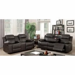 The Furniture of America Milton 3 Piece Reclining Sofa Set is going to fill out your living room or help you create the home theater of your dreams. This set includes a recliner, sofa, and loveseat – all sharing the same high-end design. The breathable leatherette upholstery lets you enjoy a leather-like texture that stays cool no matter how long you relax. High-density foam gives shape to the padded headrest, pillow-top arms, and segmented back cushions. A hardwood frame gives structure to each piece while a metal reclining frame with manual mechanism makes it easy to put your feet up as you lean back. The loveseat includes a fold-down console that offers a pair of cupholders with a bit of covered storage that’s perfect for books, remotes, or gaming controllers.
