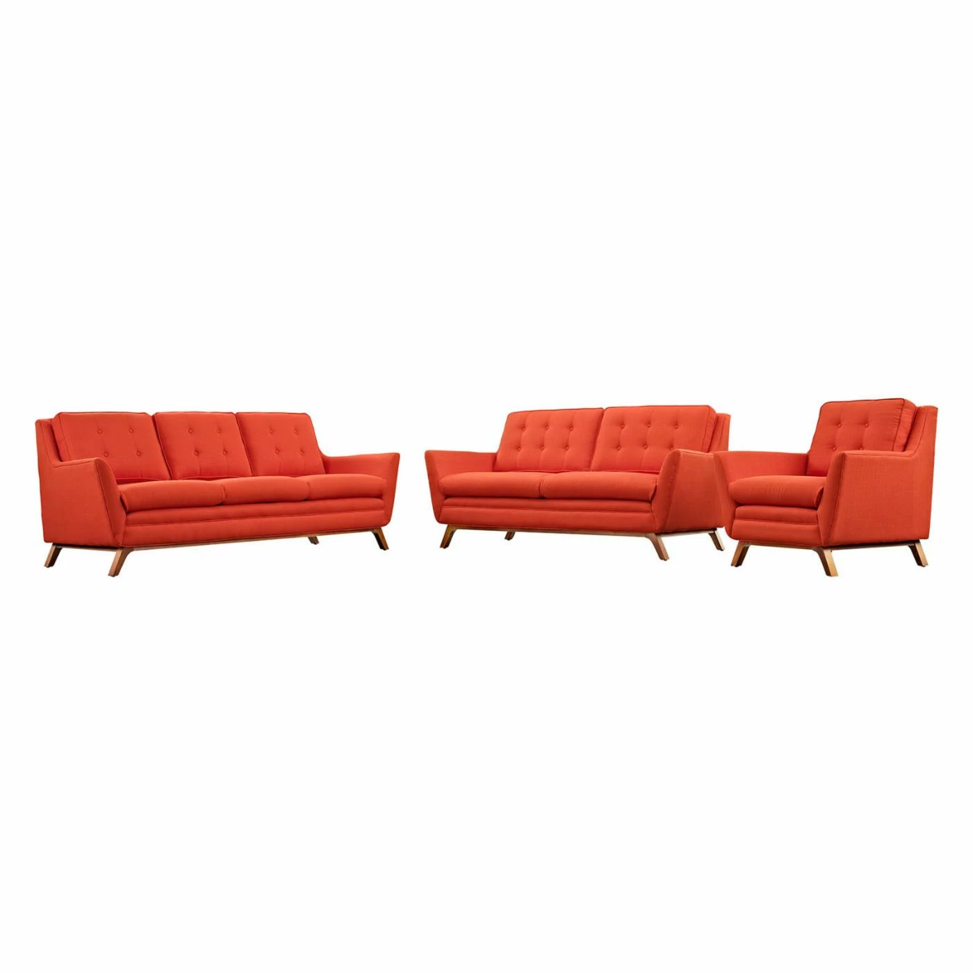 Inject a burst of energy into your living area with the wonderfully fetching Modway Beguile 3 Piece Upholstered Fabric Living Room Sofa Set. This three-piece set comes complete with a sofa, loveseat, and armchair. It features robust solid beech wood bases, plush seating cushions, and tufted-back cushions. This chic set is upholstered in soft and durable polyester fabric. It comes in your choice of available colors to set the tone for your living room.