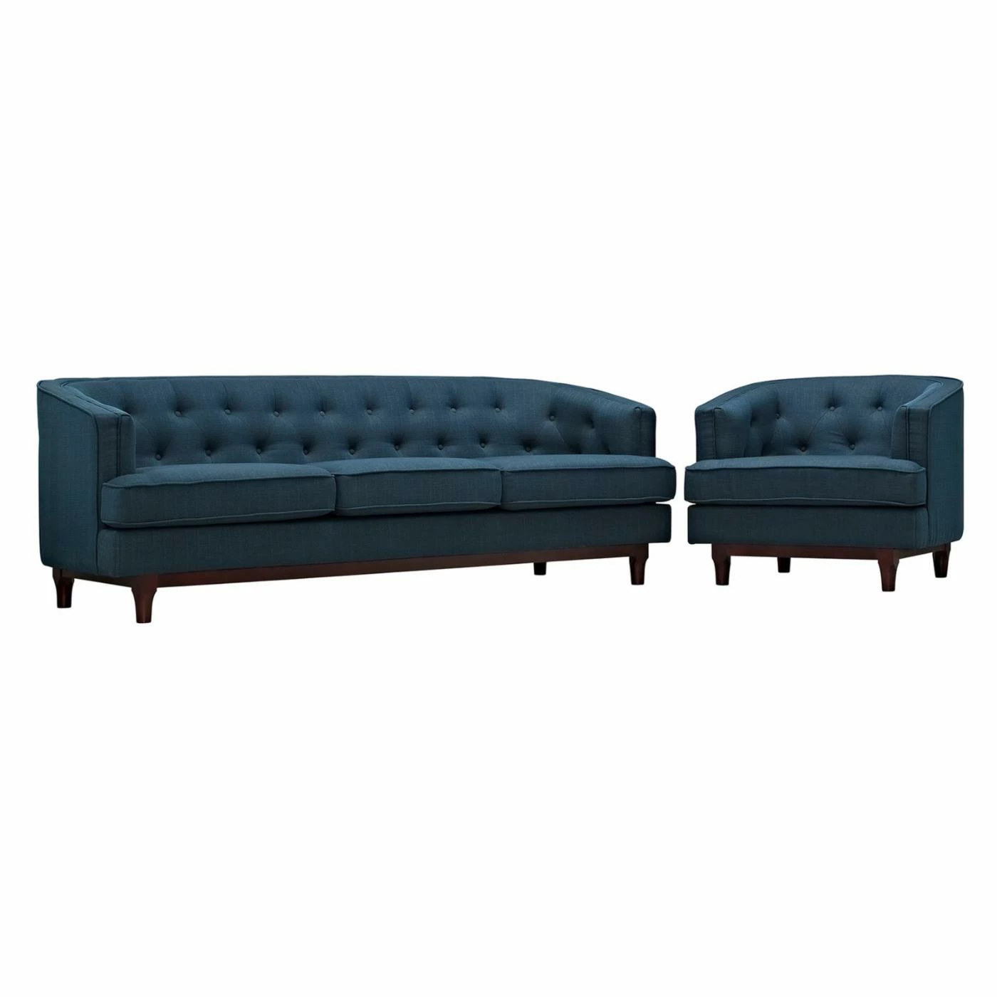 Outfit your living space with the Modway Coast 2 Piece Living Room Sofa Set. This elegant set includes a sofa and armchair, each outfitted with dense foam cushioning and removable seat covers for easy cleaning. Each piece is upholstered in soft and durable polyester fabric with deep button tufting and fine piping trim. The espresso-stained legs are capped with non-marking foot glides to protect your floor.