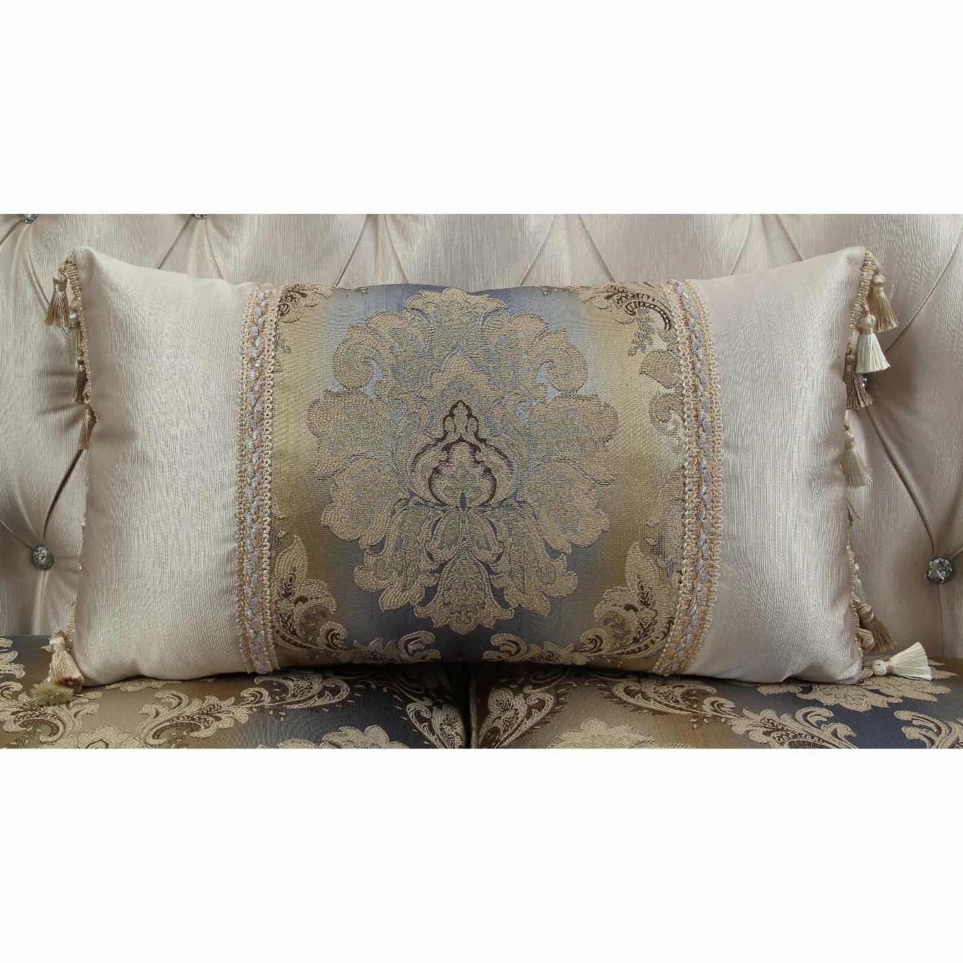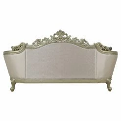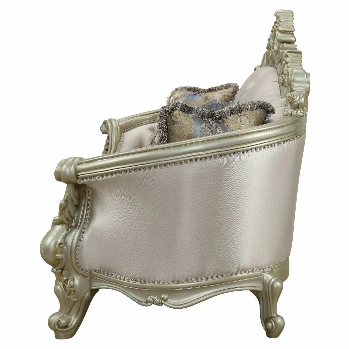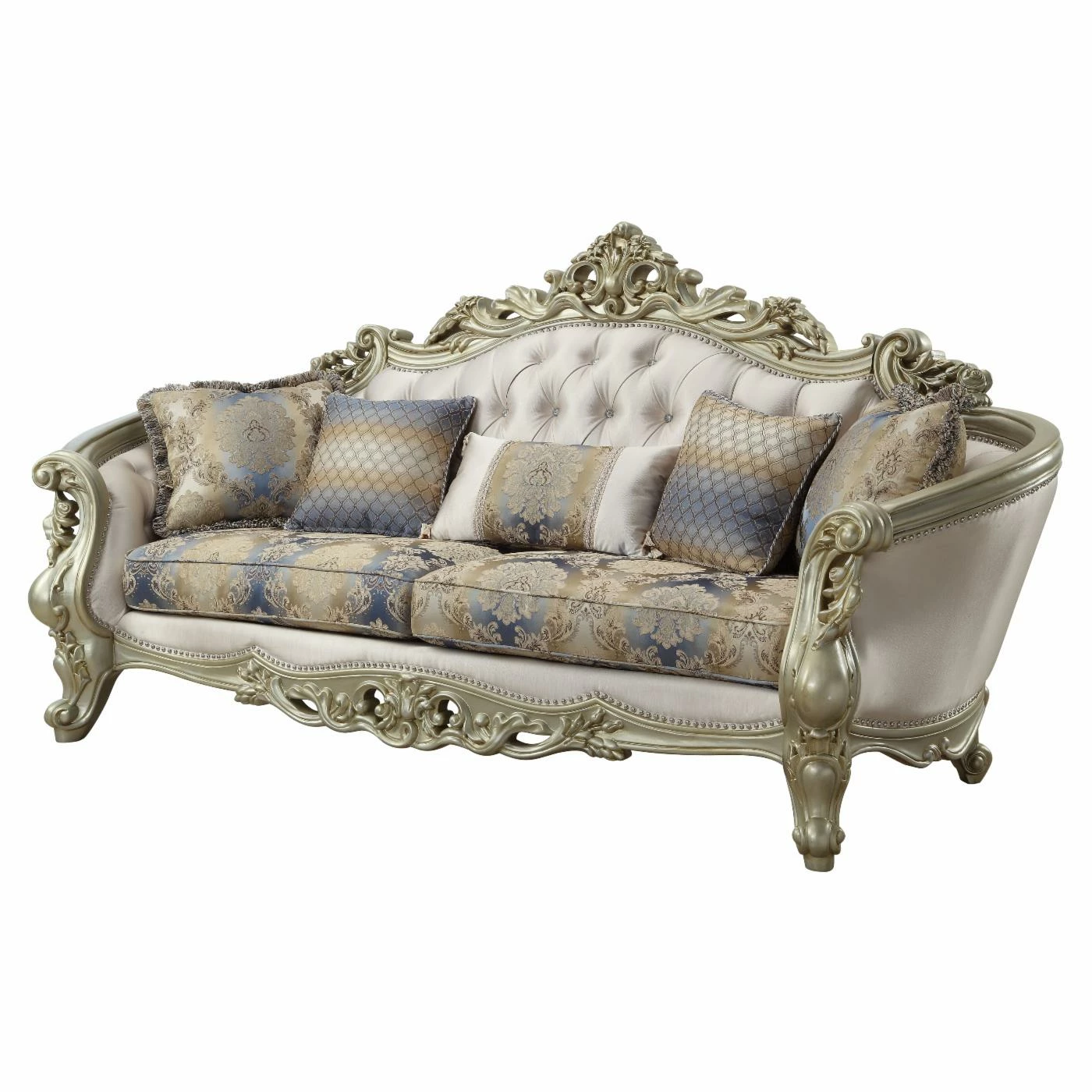 Invite baroque style into your living space with the Acme Furniture Gorsedd Sofa With 5 Pillows. This regal sofa is graced by an elaborately carved framework drenched in an antique champagne finish. Designer details include a carved backrest, arms, and Queen Anne legs plus crystal button tufts and nail head trim. For a contemporary twist, this sofa is dressed in solid cream colored fabric with coordinating blue and beige damask seat cushions and accent pillows to match. Look for other pieces in the Gorsedd collection for a cohesively majestic living room.