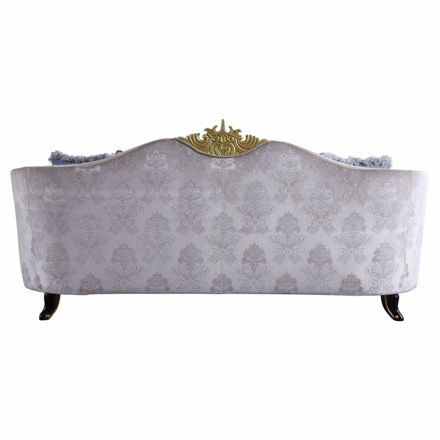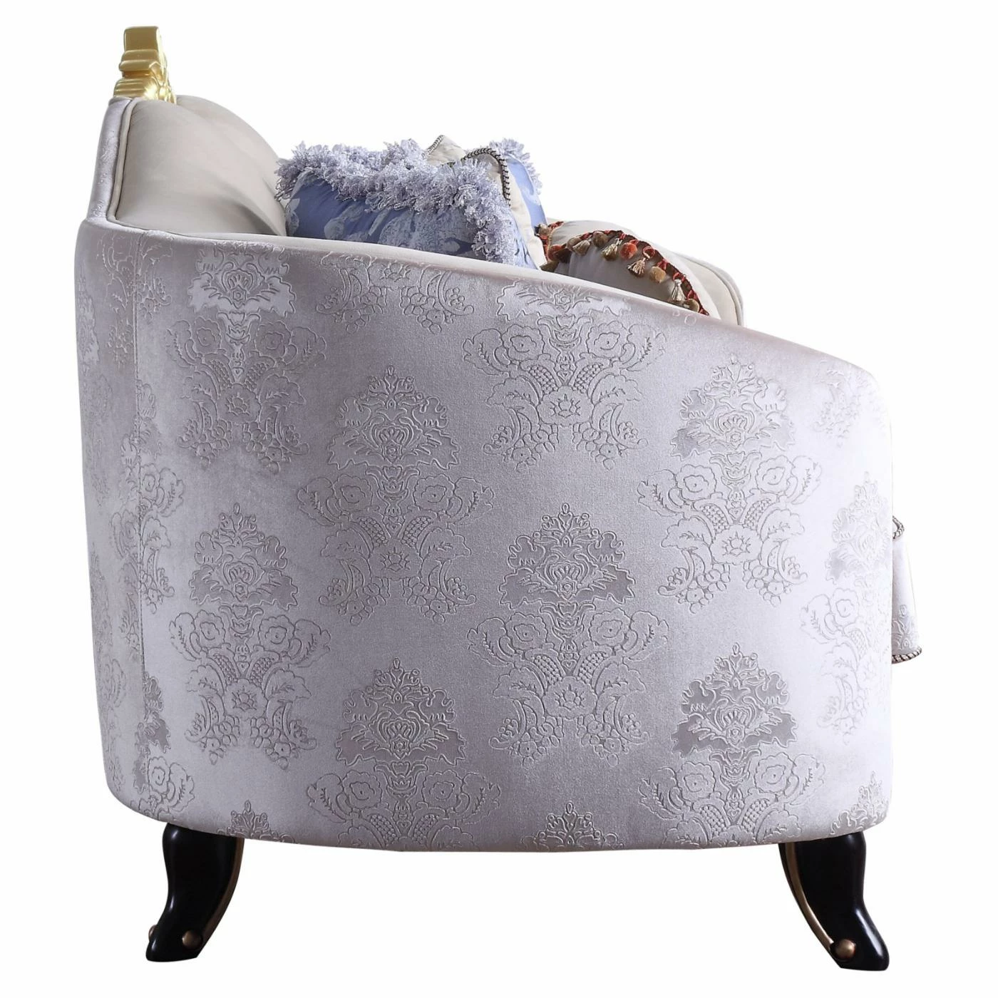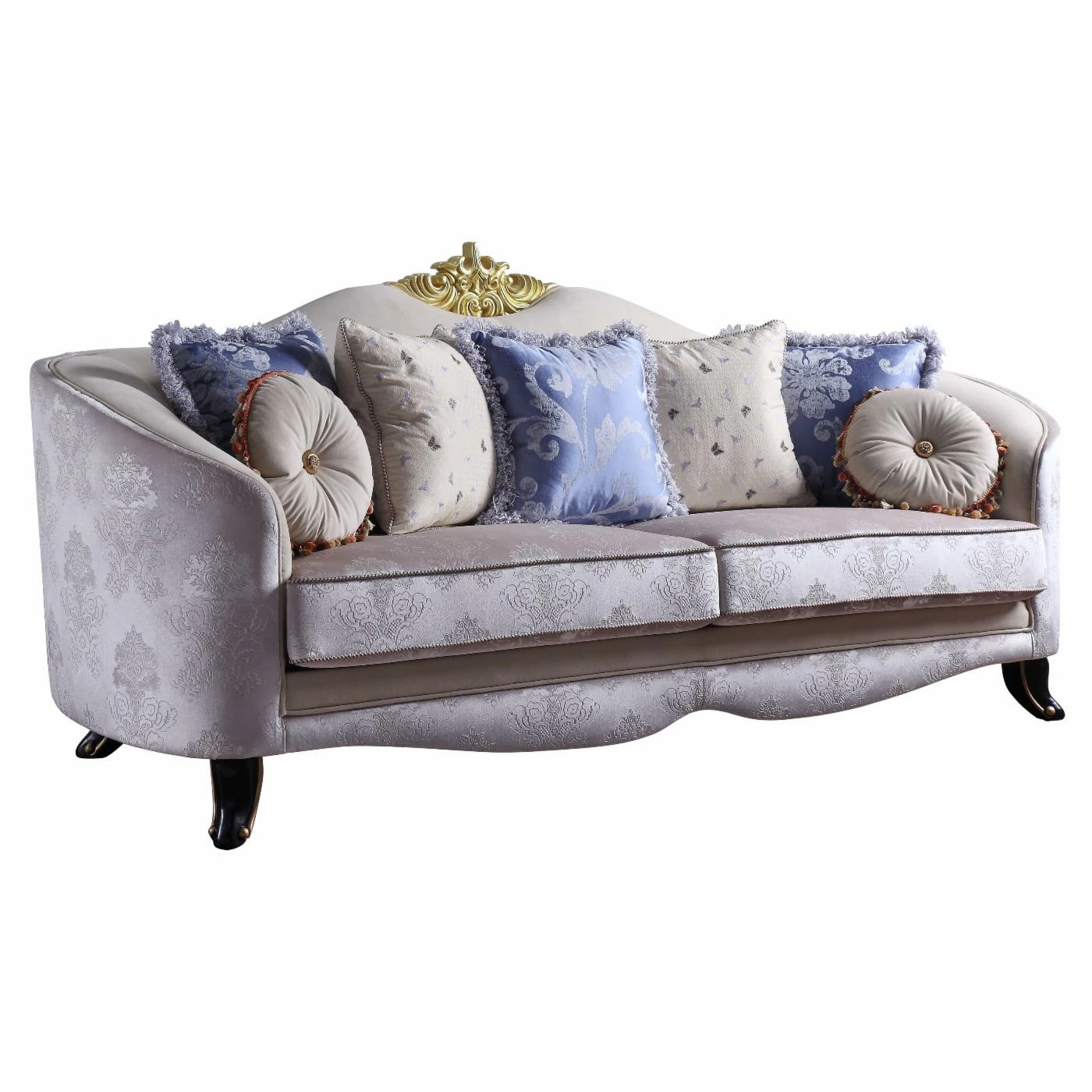 The Acme Furniture Sheridan Sofa with 7 Pillows brings a glorious European parlor style to make your living room or day room feel a little more posh. Sturdy wood constructs the frame, perched on black-finished cabriole feet. The curved armrests, arched back, and seat cushions are padded with foam. Creamy white fabric upholsters the sofa, accented with an embroidered medallion design. A molded crown medallions piece sits at the peak of the back, finished in gold. A total of seven different throw pillows are included