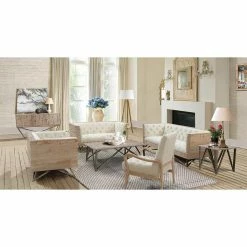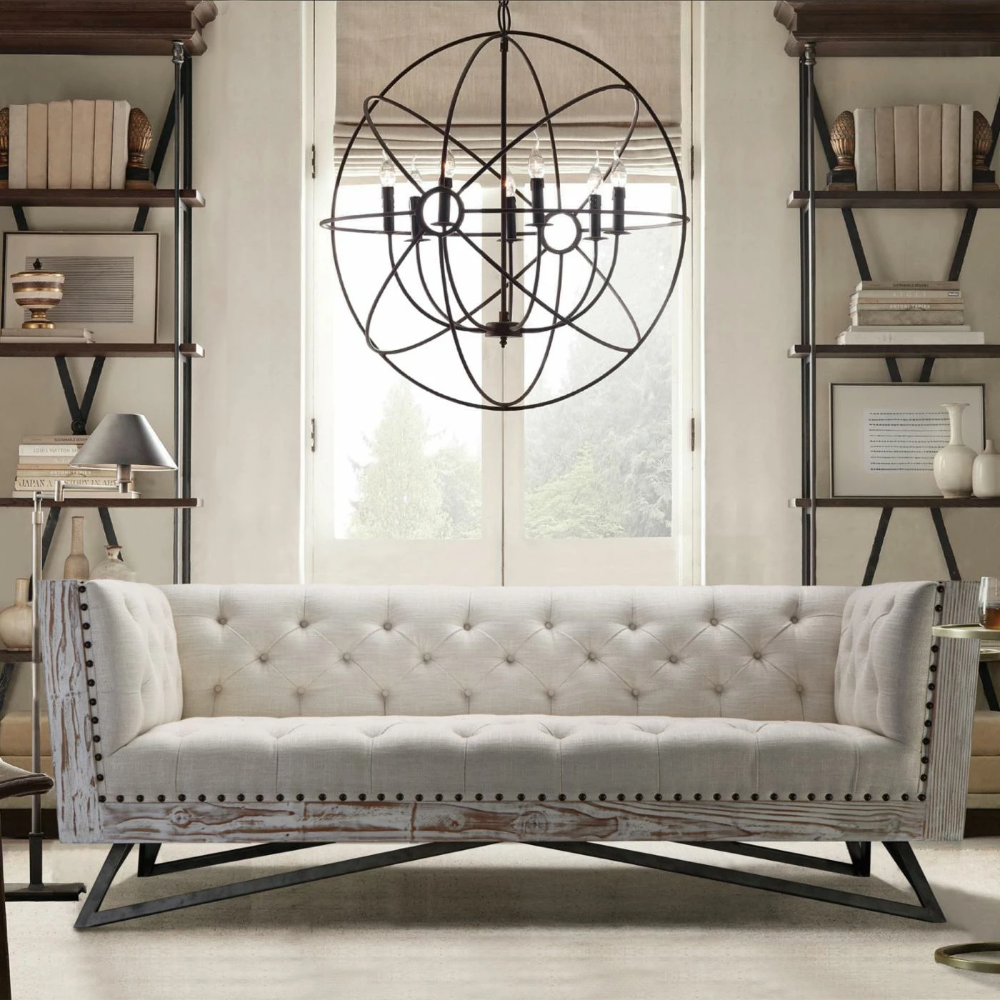 The Armen Living Regis Fabric Sofa is sure to be the central focus of your modern organic living space. This stunning yet comfortably casual sofa is scaled large, making it perfect for open, modern room designs. It features a gloriously neutral color palette and blend of rich textures. Pine wood on the sides and front comes in a thoroughly distressed finish and is accented by large nail heads. Thick cushioning on the arms, back, and seat are upholstered in a cream faux linen fabric. Deep button tufts and a dramatically angled frame in gunmetal gray make this sofa complete.