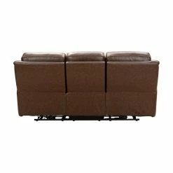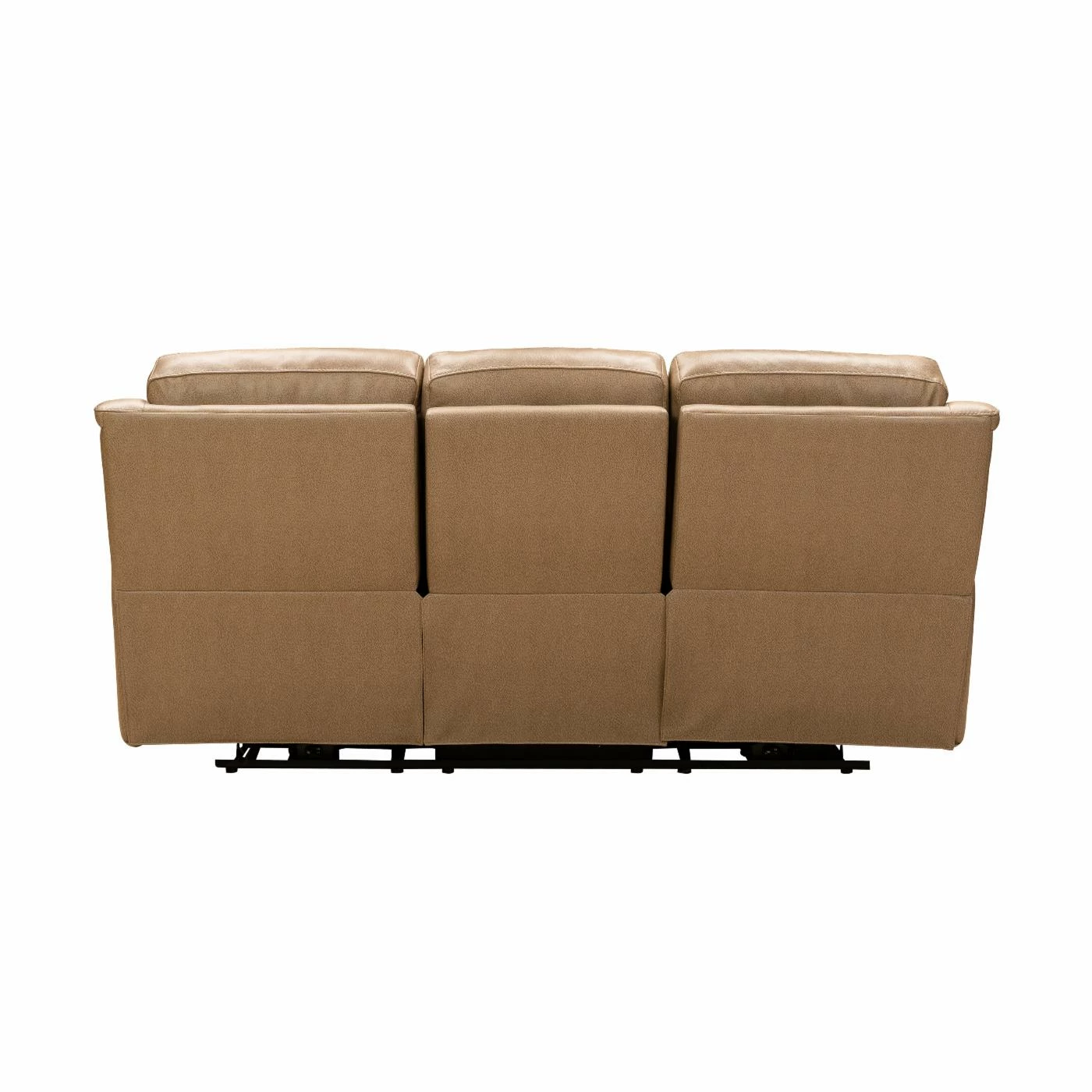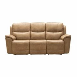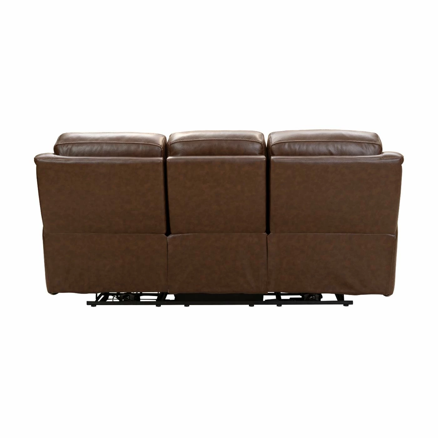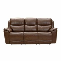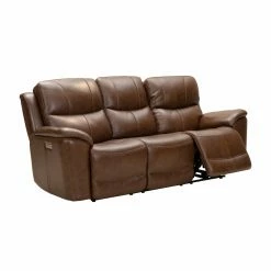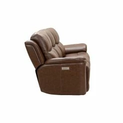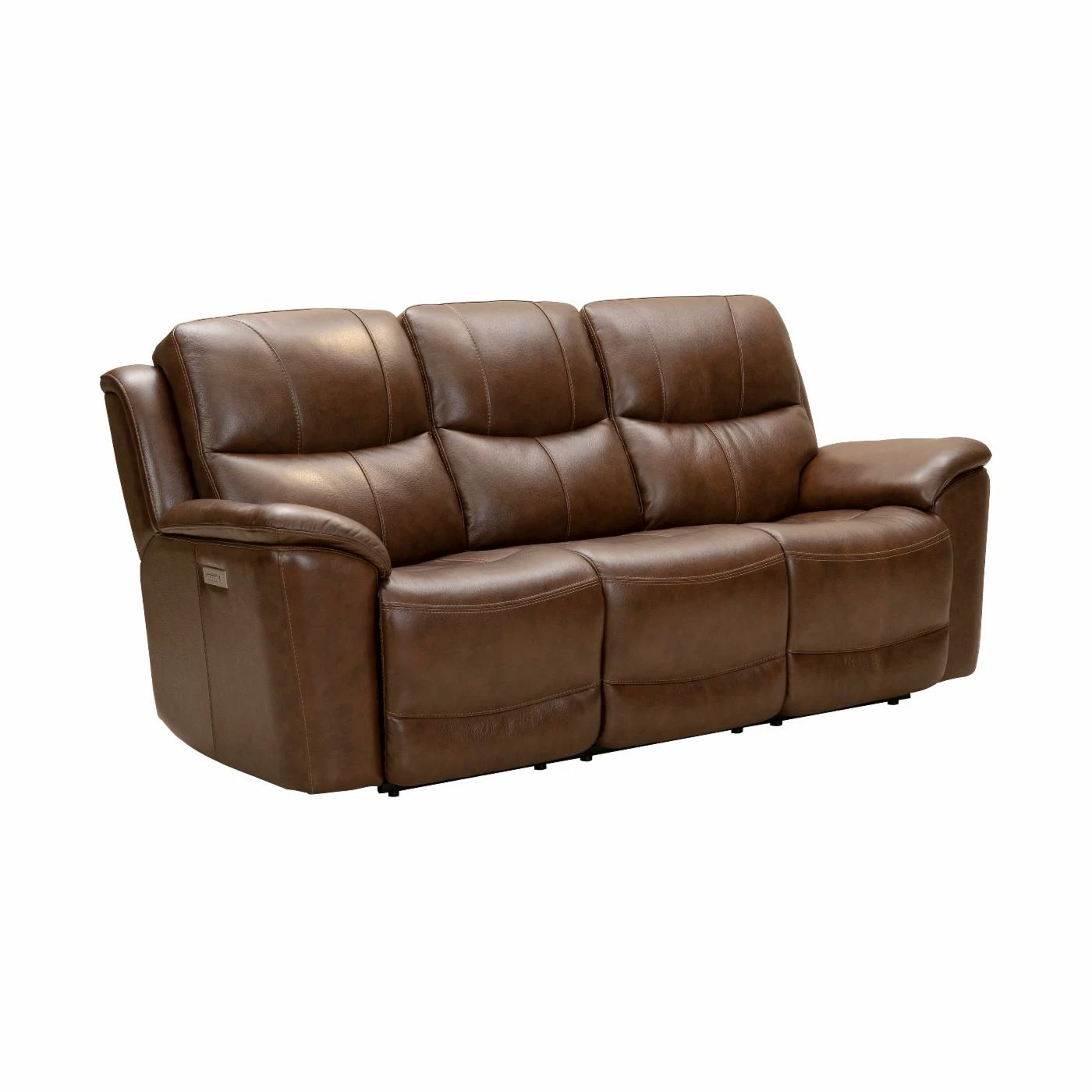 Relax in the modern pubback styling of the Barcalounger Kaden Leather Power Reclining Sofa. This sofa features oversized boxed styled pad over chaise seating with pocketed coils, slim line wedged pillow arms, and power recline with power lumbar and power head rests. Decorative stitching accents the back and chaise fronts.