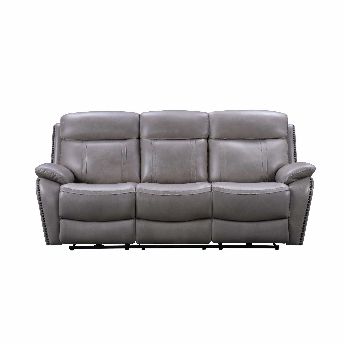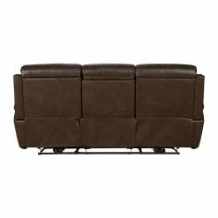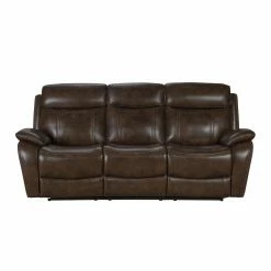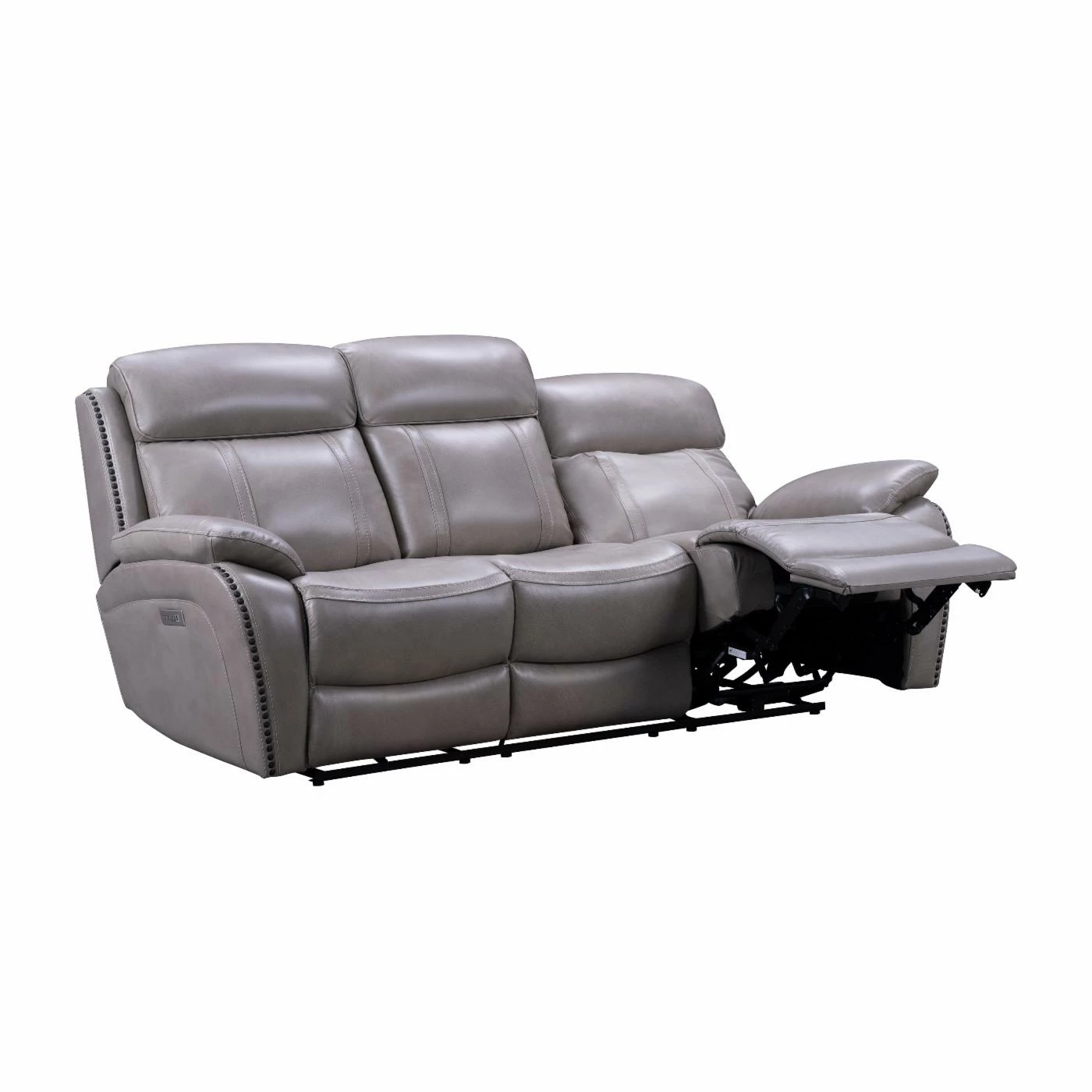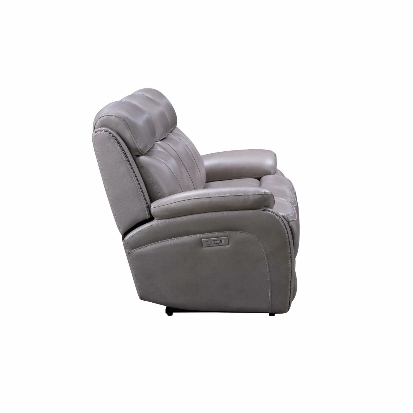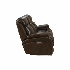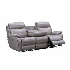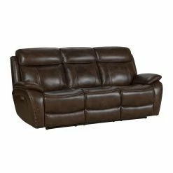 Add the casual transitional look of the Barcalounger Sandover Leather Power Reclining Sofa. This sofa has a power recline, power headrest and power lumbar support. It also features pad over chaise bucket seating with pocketed coil springs for seat comfort and hidden drop down center table with 2 cup holders. The arms are ?ared track pillow style accented with nail head trim. The power buttons have USB ports to keep your devices charged.