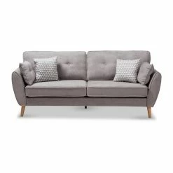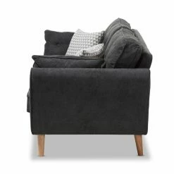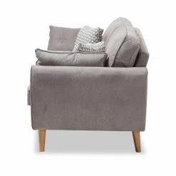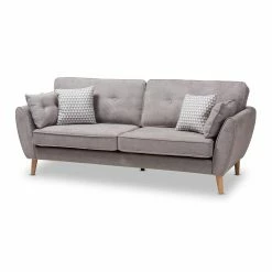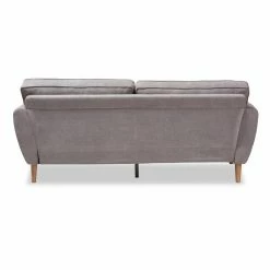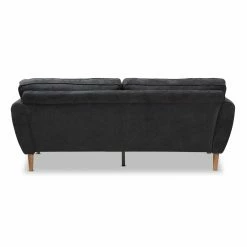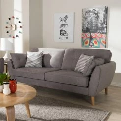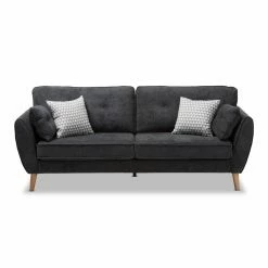 Give your living room a welcome change of pace with the Baxton Studio Miranda Mid-Century Modern Fabric Upholstered Sofa. This expansive sofa has a minimalist, mid-century appeal with splayed legs and angled armrests. The frame is constructed from thick wood and wrapped in dense foam. The thick cushions feature welted seams with button-tufting on the backrest. Top-quality fabric upholsters the sofa. Choose your ideal color options from the available.