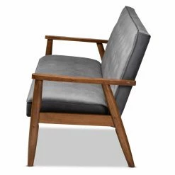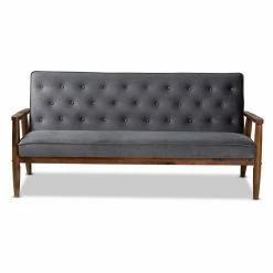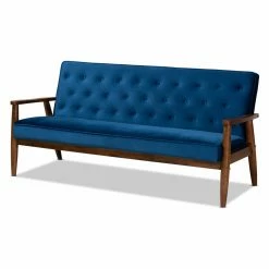 Bring sleek, sophisticated style to your living room or family room with the Baxton Studio Sorrento Velvet Tufted Sofa. This mid-century modern sofa has a wood frame in a warm, walnut finish. The angled legs add to the sofa’s silhouette. The plush, padded foam seats are upholstered in velvet polyester with button tufting. Choose from available fabric colors to find the Baxton Studio Sorrento Velvet Tufted Sofa that works best for your home.