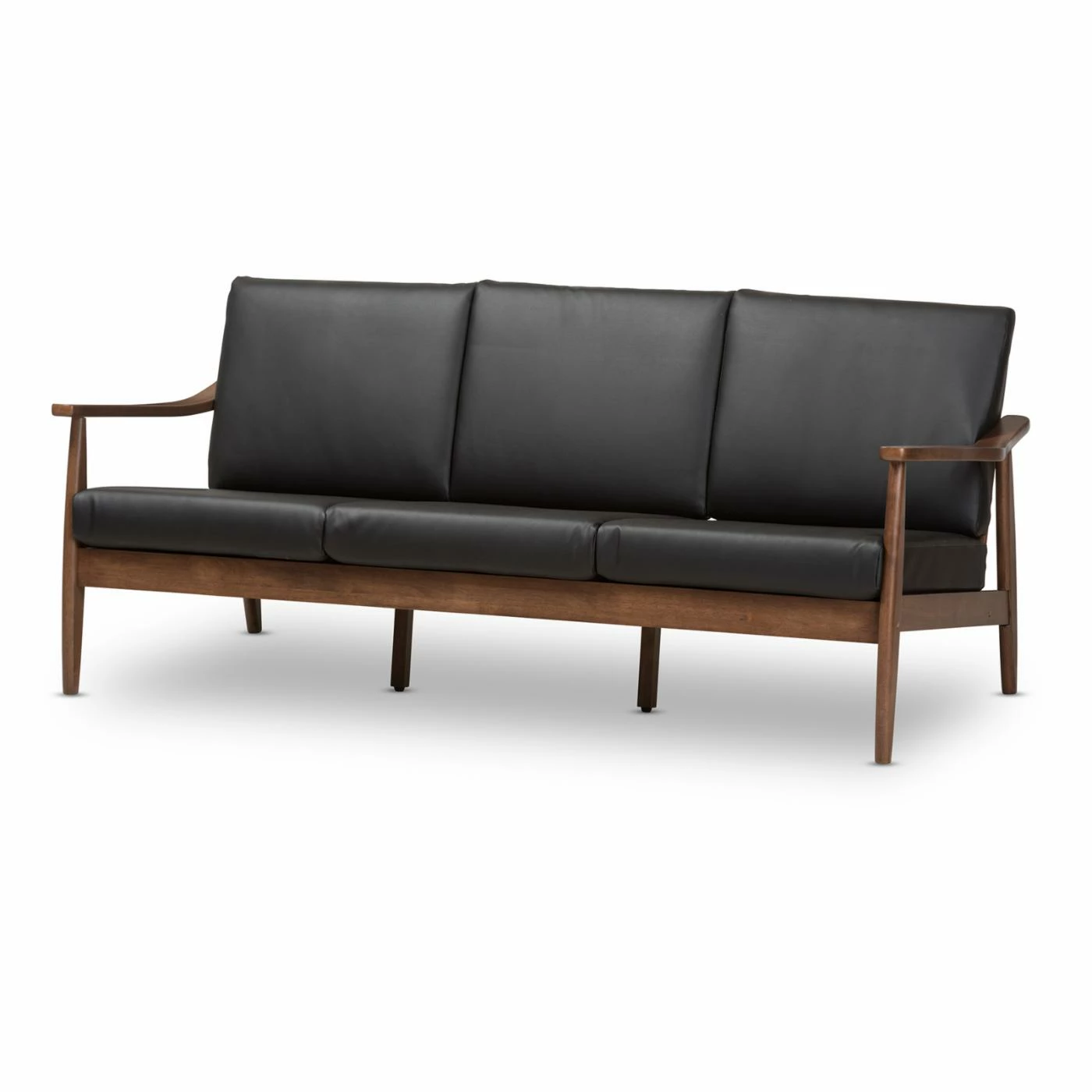 Build your new living room design around a striking centerpiece with the Baxton Studio Venza Walnut Wood Black Faux Leather 3 Seater Sofa. This sofa easily seats three people at once, featuring a wide seat and back cushion for each user. The cushions are all padded with fine foam and upholstered in black faux leather. Forming the frame is solid rubberwood, topped by a dark brown walnut finish. Angled armrests and tapered legs lend a mid-century flair to the design.