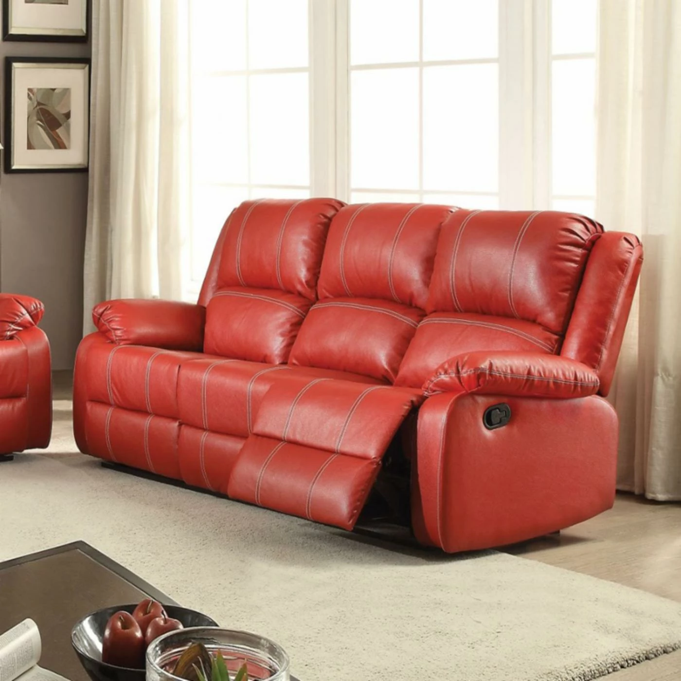 Elevate your seating area and your feet with the Benzara Splendid Reclining Sofa. The plushly cushioned sofa makes a bold, elegant statement with its top-stitched red polyurethane faux leather upholstery. Smooth-motion power mechanisms make it easy to recline the seats.