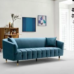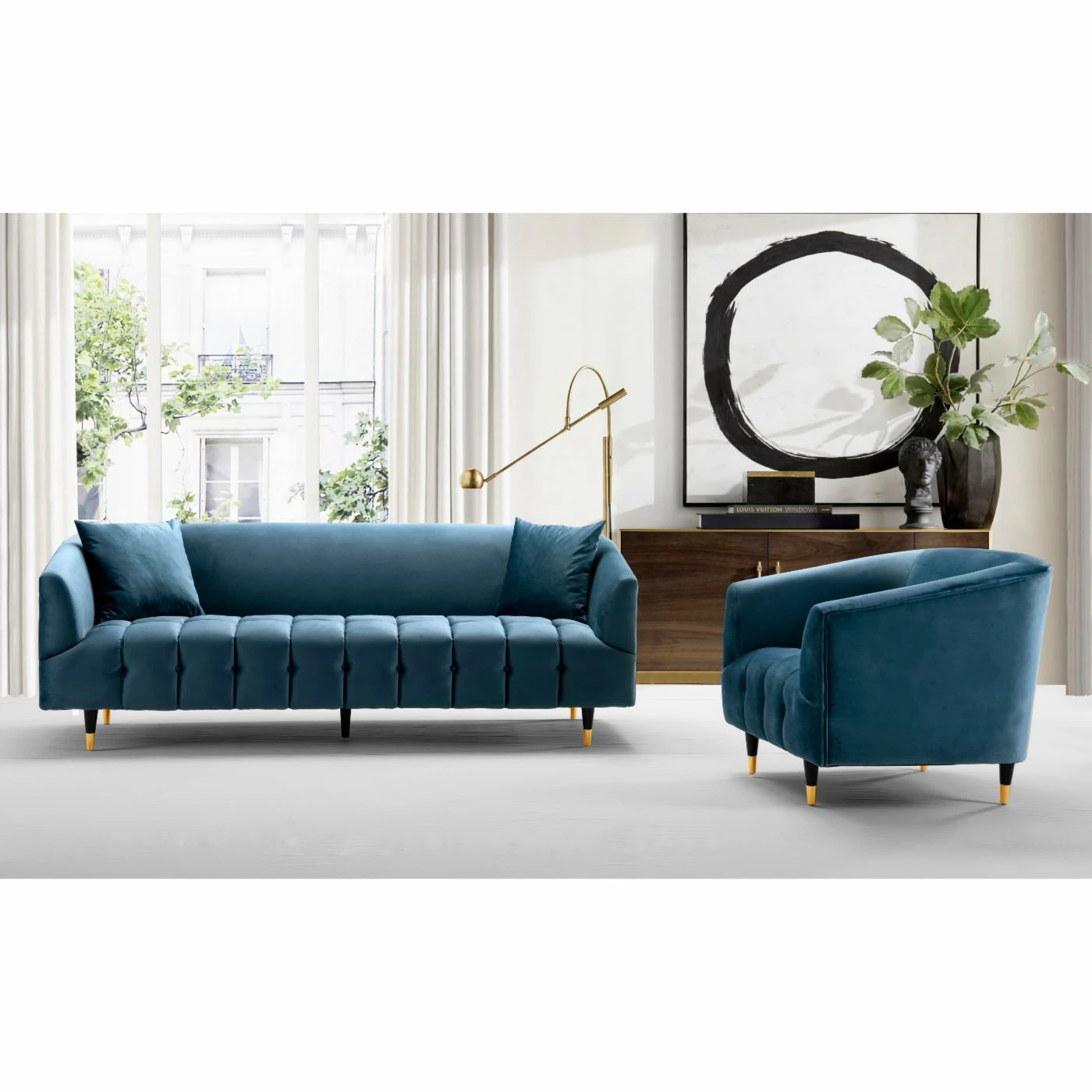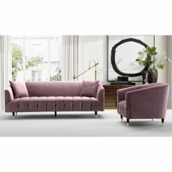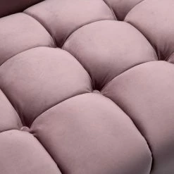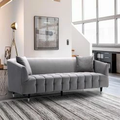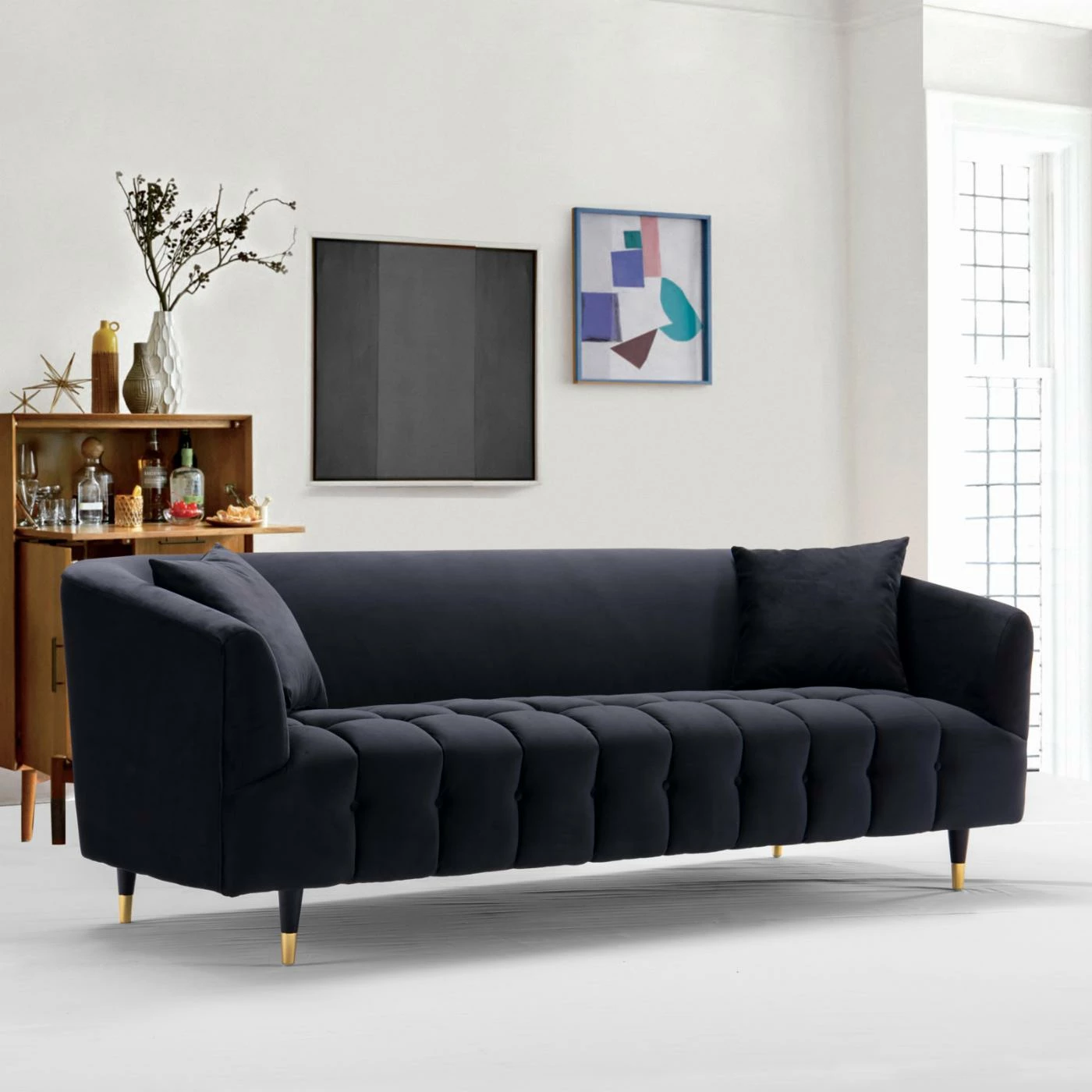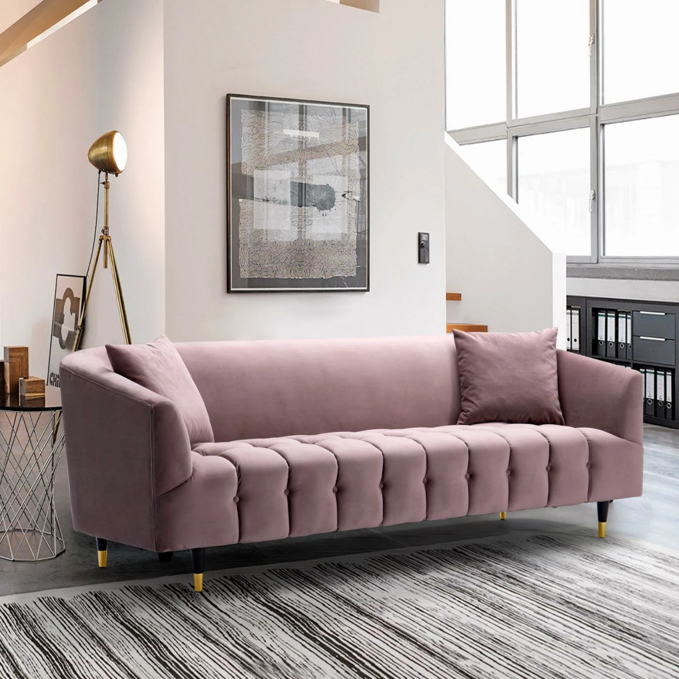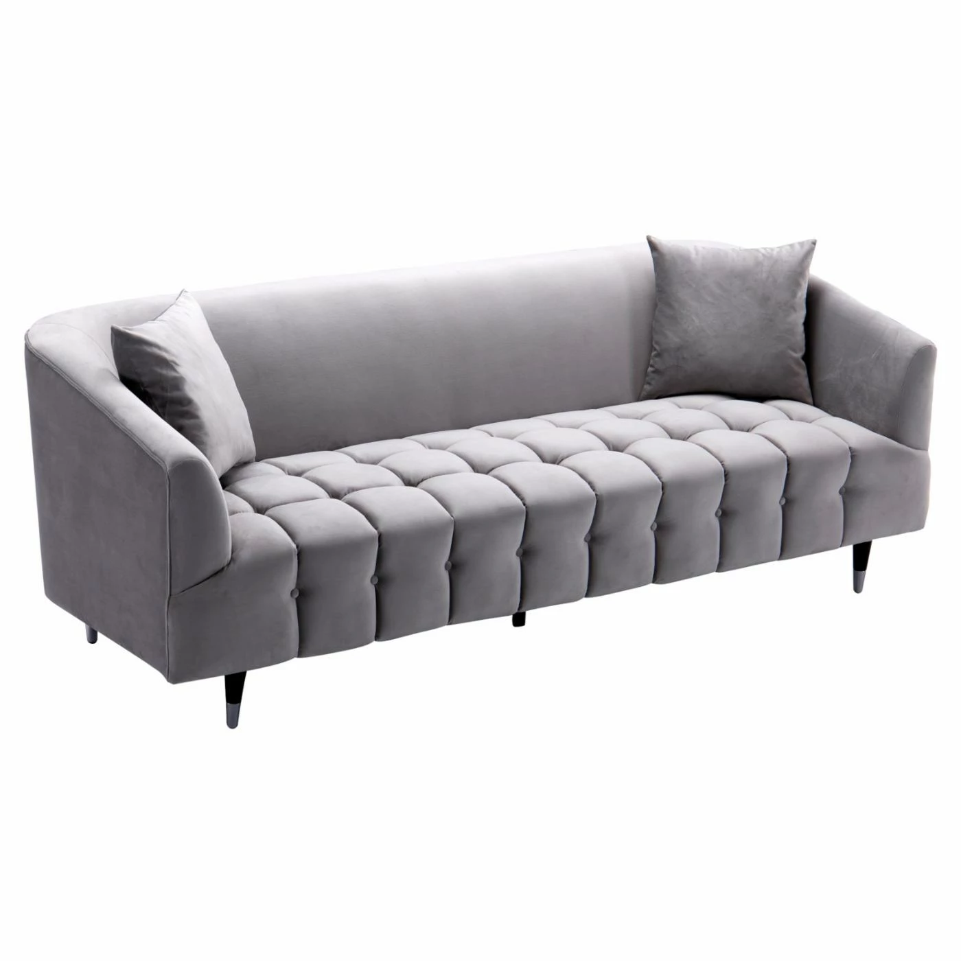 Invigorate your living room with a magnificent modern centerpiece thanks to the Chic Home Ella Sofa. The wood frame sits on round, tapered peg legs with metal foot caps. The bench seat, flared armrests, and straight back come padded with high-density foam for lasting, springy comfort. Velvet fabric upholsters the sofa, featuring a square tufted design on the seat with deep lines and buttons. Choose from available fabric colors.