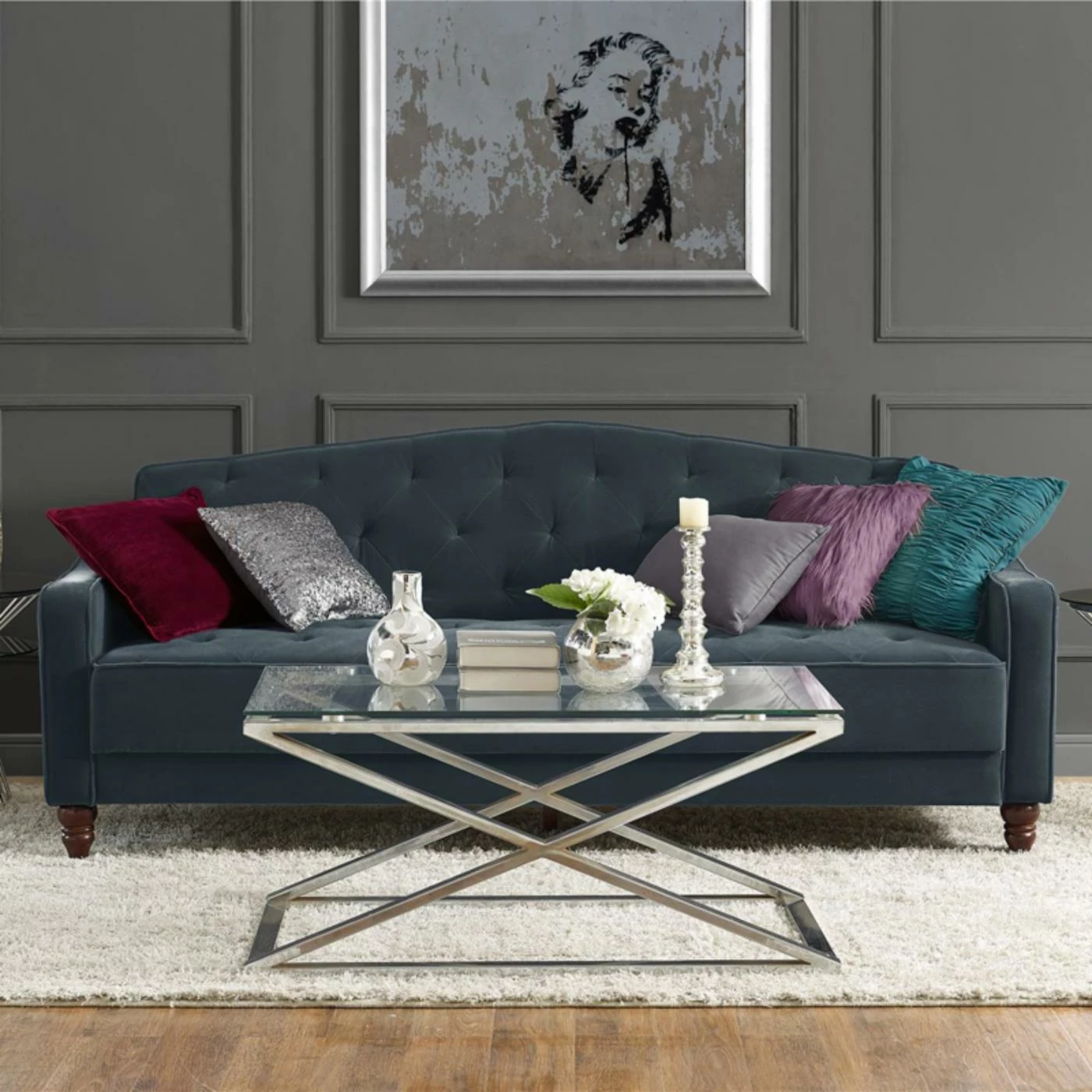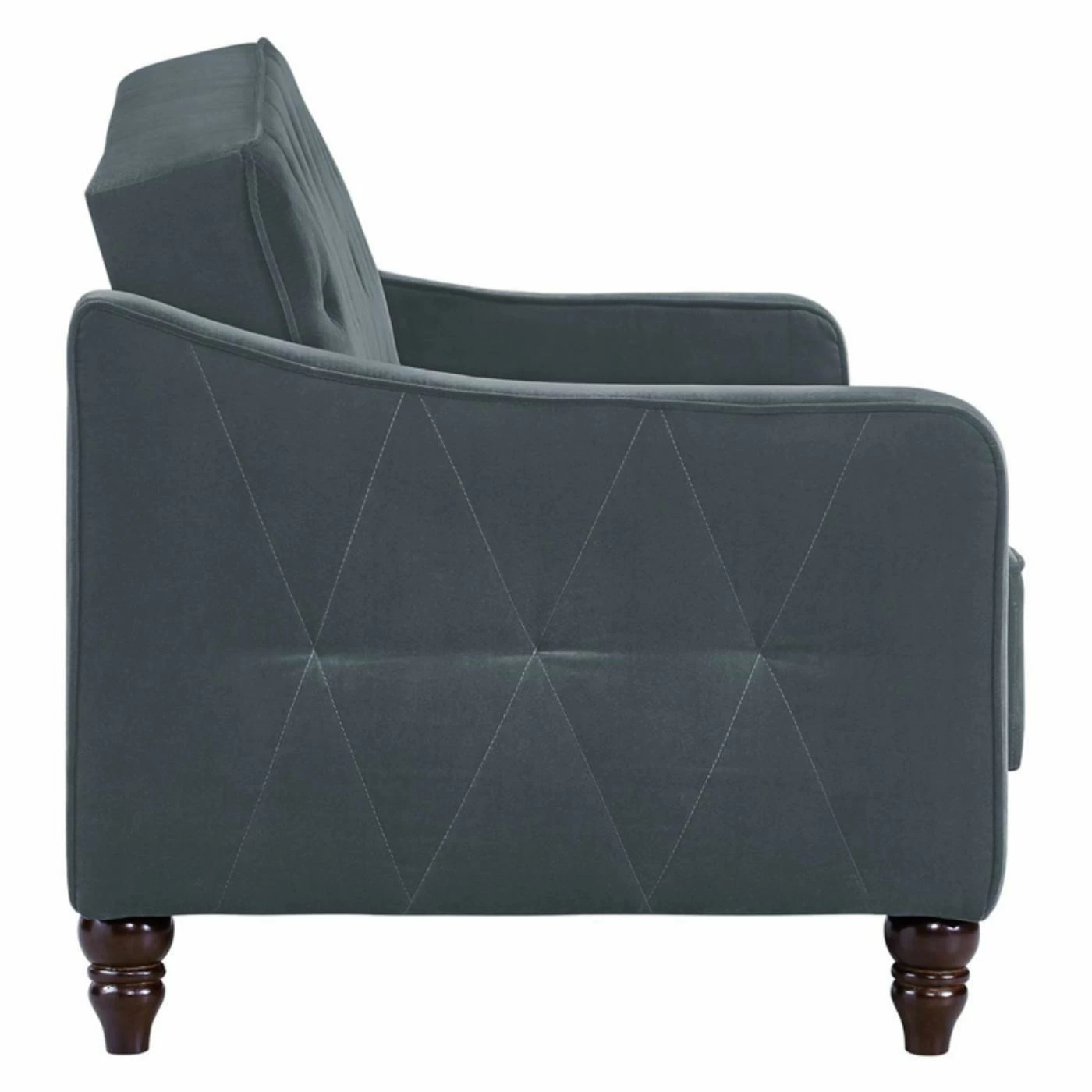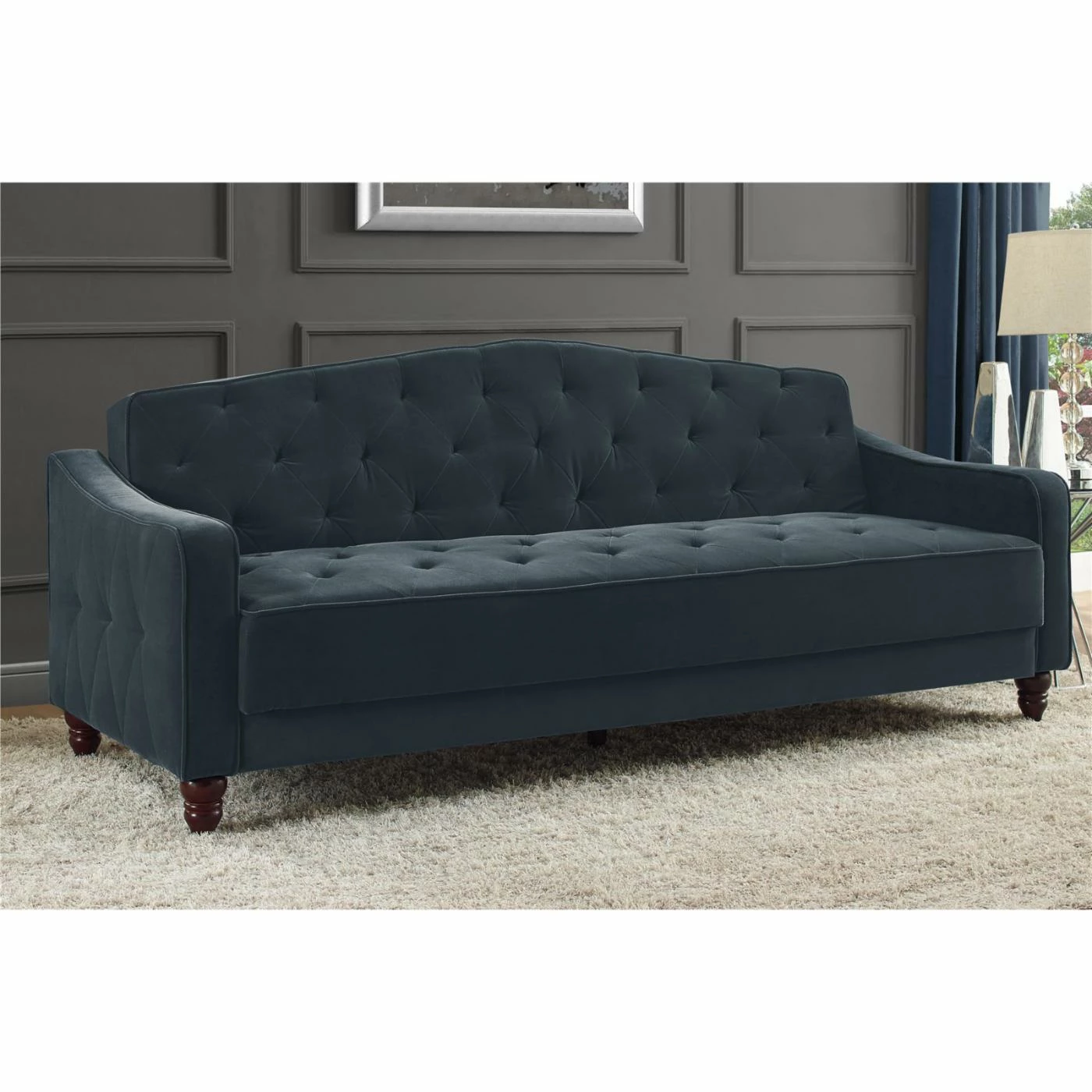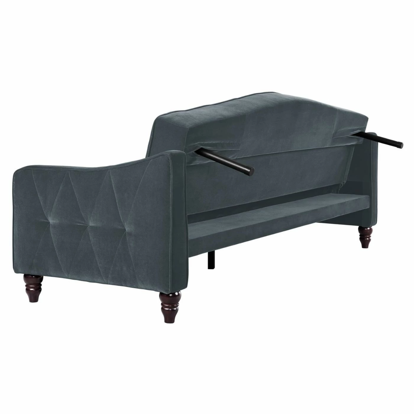 You’d never guess this ultra chic Dorel Home Novogratz Vintage Tufted Sofa Sleeper IIΒ becomes a comfy bed for overnight guests. This sofa sleeper features plush cushions and velvety soft velour upholstery in your choice of available colors. The back piece of the sofa sleeper adjusts for a lounging position and lays flat for sleeping. Designer details include diamond tufting on the sides, deep button tufting on the seat and back, and covered cord trim. Turned and tapered wood legs complete the look of this upscale sofa sleeper.