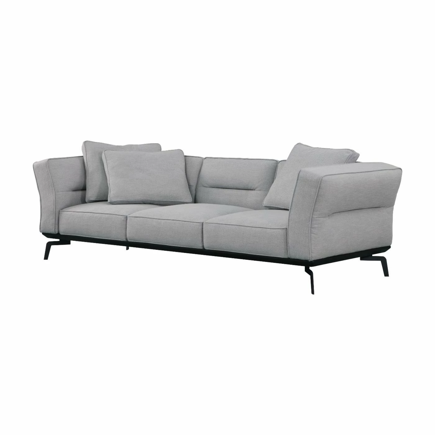 The Furniture.Agency Merino Contemporary Sofa blends sharp lines and strong colors for a contemporary living room centerpiece that’s not easily overlooked or forgotten. This sofa features a curved backrest and armrest with angled metal feet for a sleek profile. Its frame is rendered from wood with high-density foam stuffing the cushions. Light gray fabric upholsters the sofa, trimmed with welted seams. The backrest and side cushions feature a horizontal tufted line at the apex of the curve.