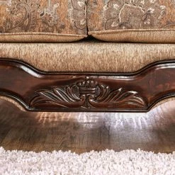 The Furniture of America Adonnis Traditional Style Printed Fabric Sofa will have you relaxing like royalty. Upholstered in soft brown chenille fabric, this stylish sofa features removable cushions that have a printed finished welt trim. Pleated rolled arms and carved bun feet add to the intricate carved wood panel detail along this sofa. Matching accenting pillows included.