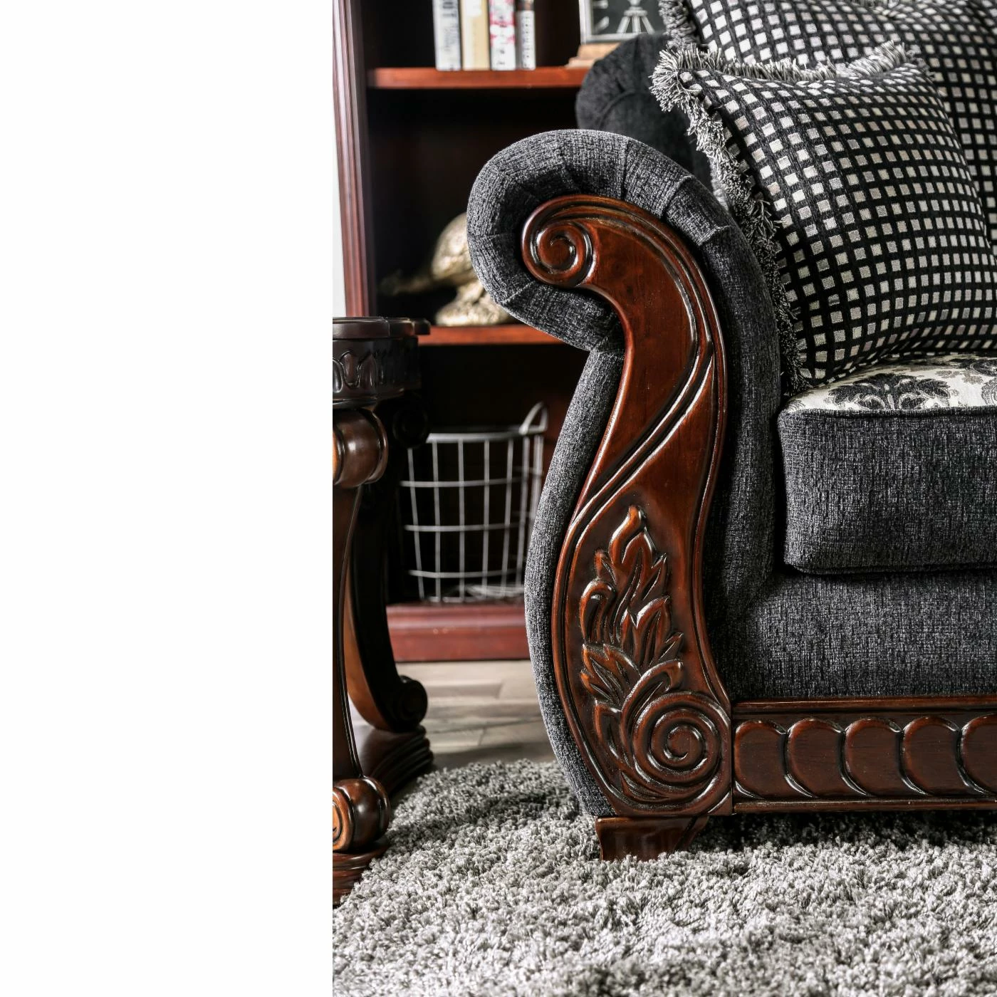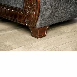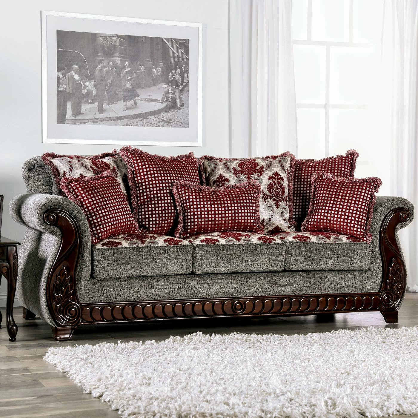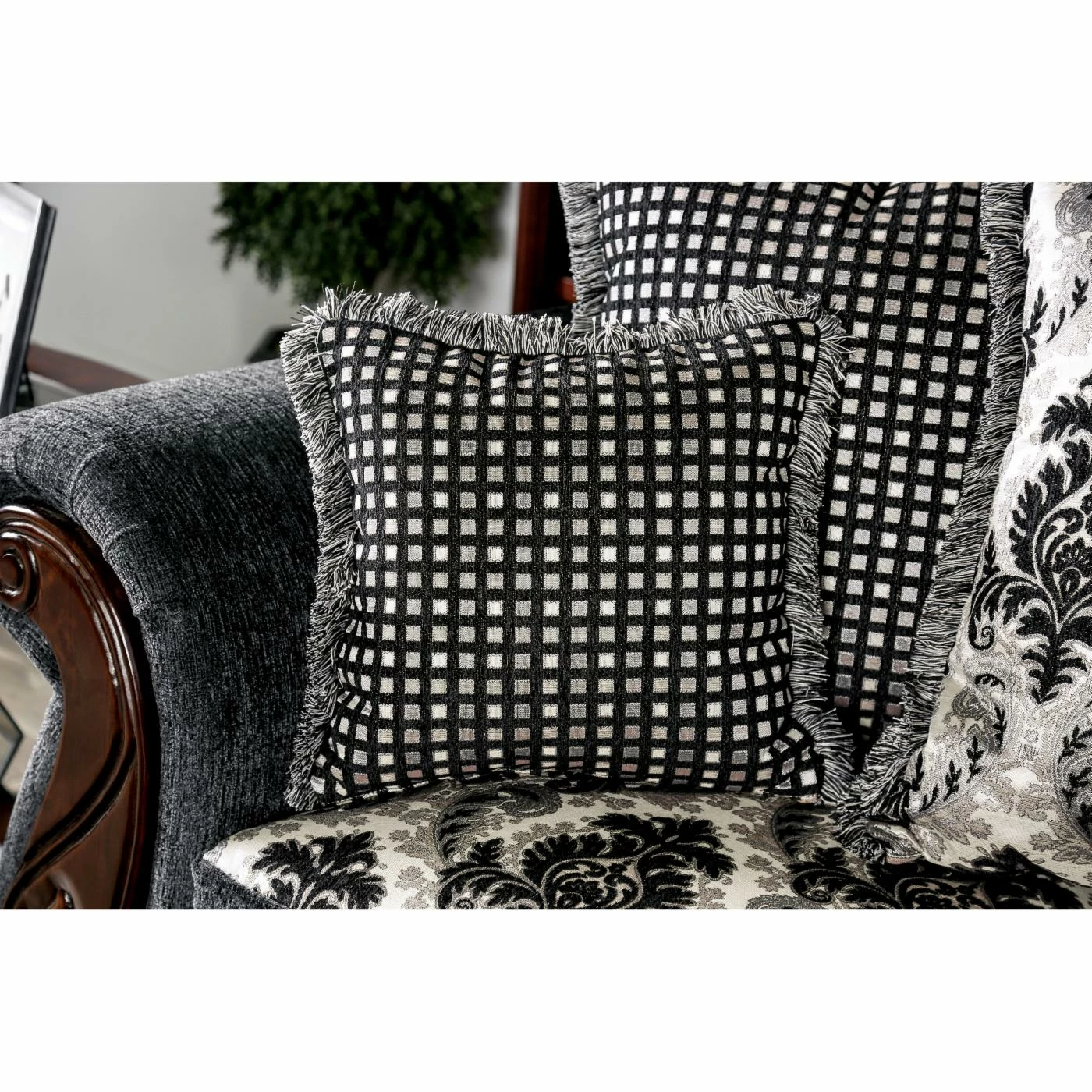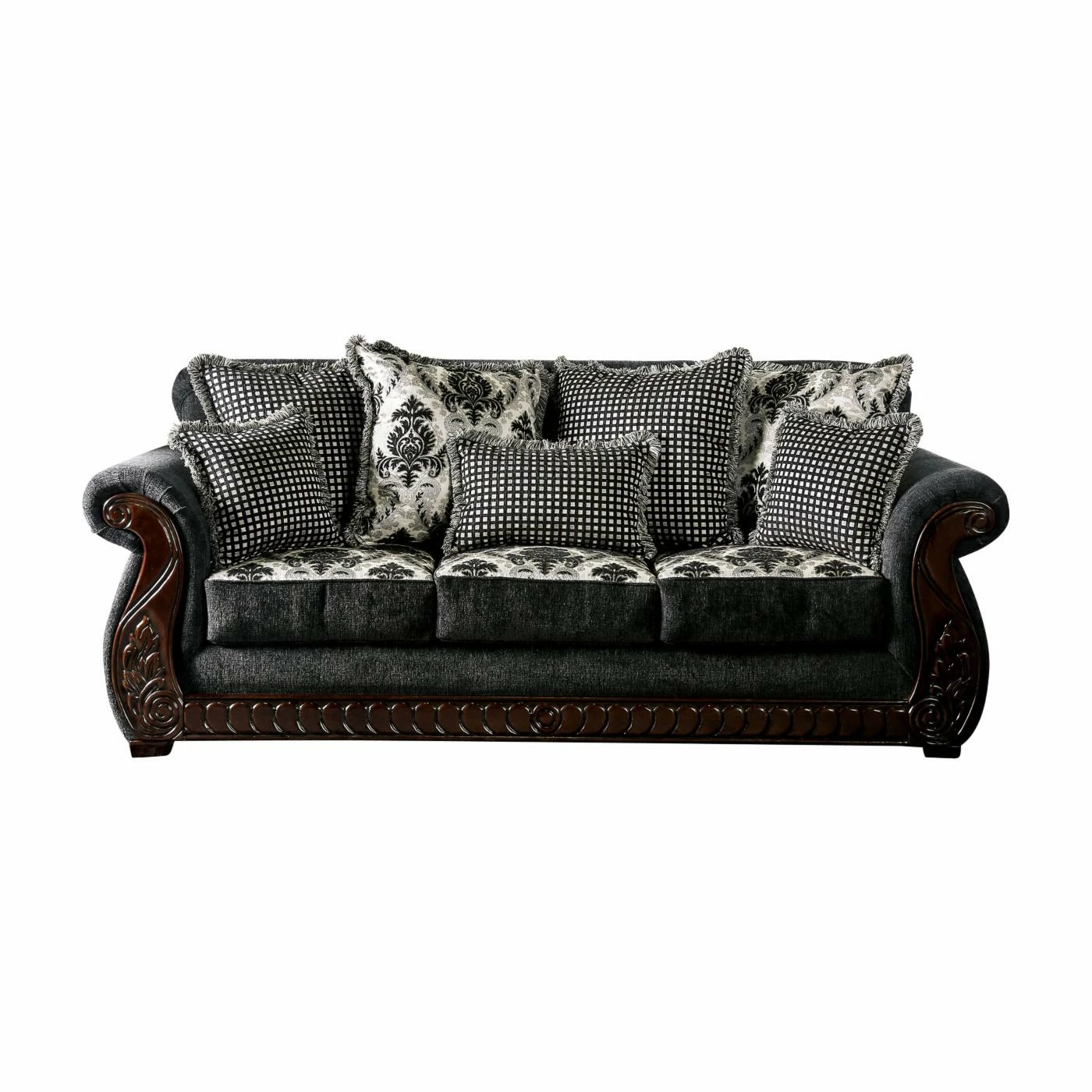 In a mash-up unique to itself, the Furniture of America Andrea Sofa combines modern considerations and traditional opulence. Carved scrollwork on a wooden front leads to chenille upholstery around a solid wood frame. Designed with your comfort in mind, the sofa features stuffed rolled arms and a button tufted wingback. The seat cushions, in box style, boast floral patterns that bring to mind old world embroidery. Detached pillows complementary to the sofa’s fashion are included. Pair with the Andrea Loveseat for a complete set. For a customized look, choose from available color options.