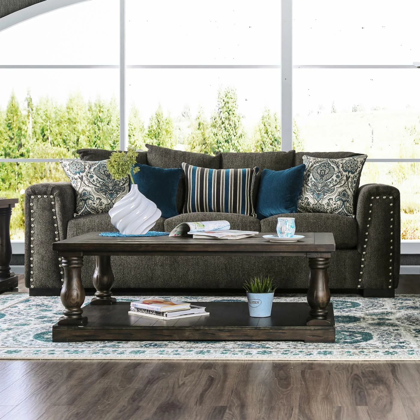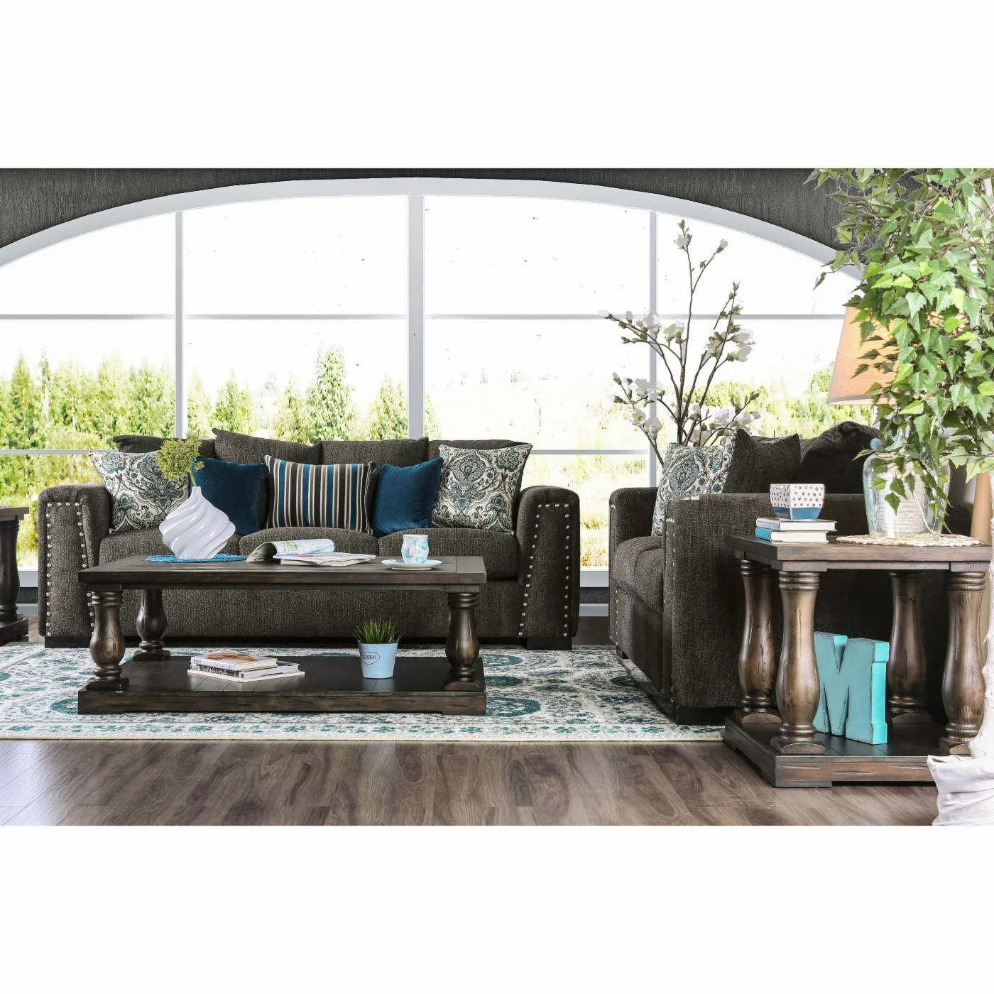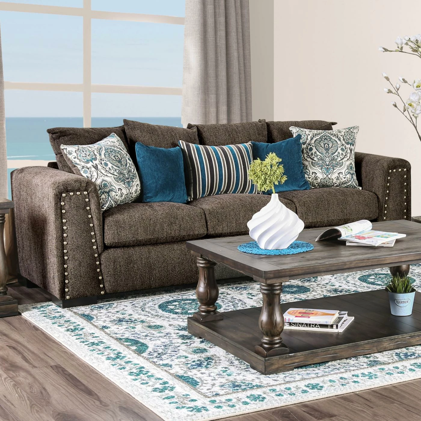 Ready to redesign your living room? The Furniture of America Barrington Brown Chenille Nailhead Sofa is here to help. This sofa has an appealing mid-century look with wedge-shaped armrests and a straight backrest. Block feet and a wooden frame provide stable support for the piece. Both the frame and the cushions are padded with plump, dense foam for lasting comfort. Long-lasting and soft chenille fabric upholsters the sofa, a deep brown in color. The wedge-shaped armrests are trimmed with large polished nailheads.