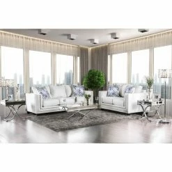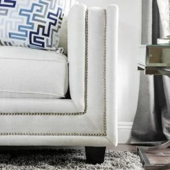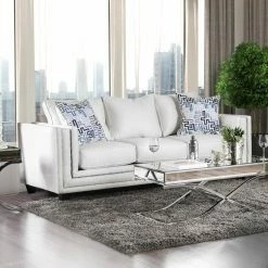 Place the Furniture of America Carlyle Ivory Chenille Nailhead Sofa in your new modern, urban-inspired loft or living room for a striking, clean centerpiece that brings your decor together. This sofa has a wide frame with a straight back and armrests, supported by a wooden frame with black block feet. Soft foam pads the frame, upholstered in an ivory chenille fabric. The face of the sofa has a double-border of polished silver nailheads.