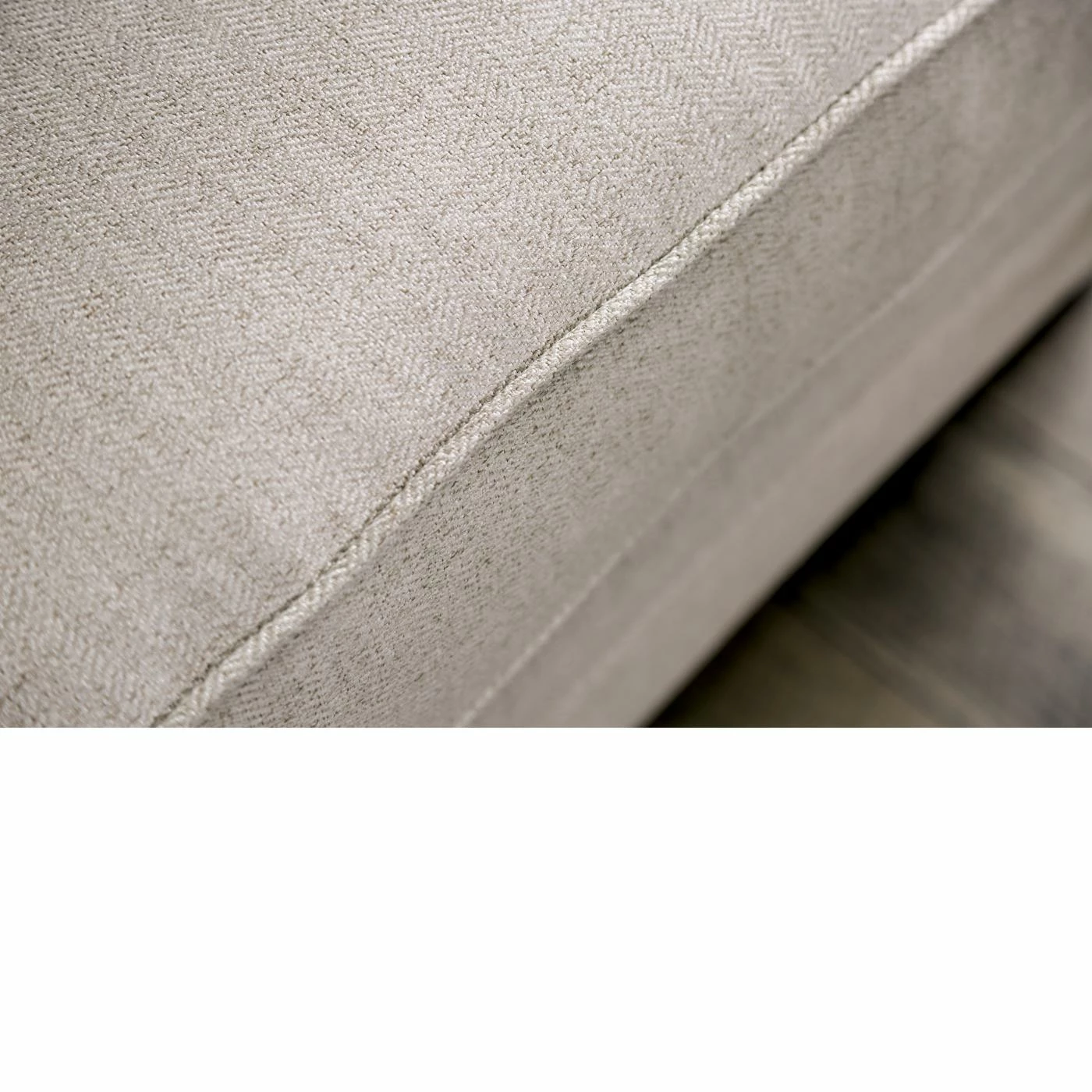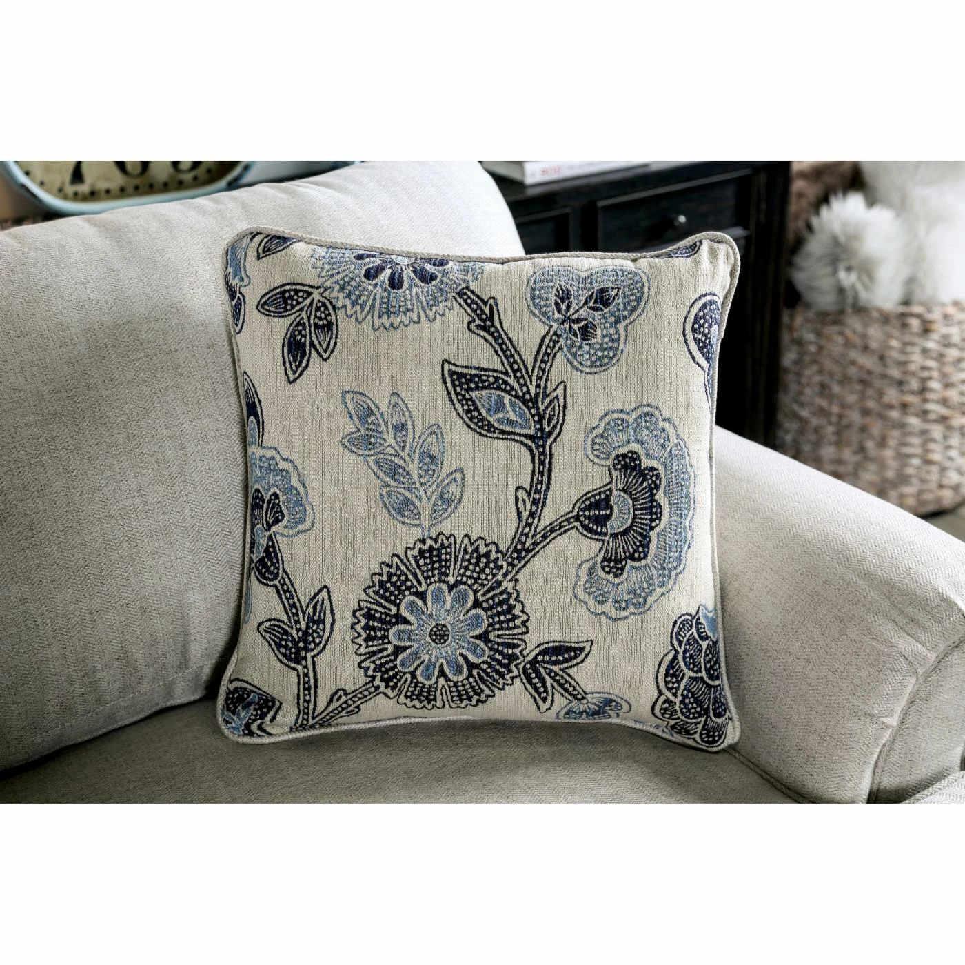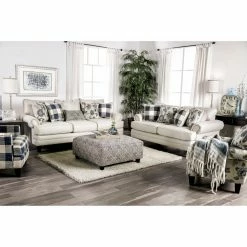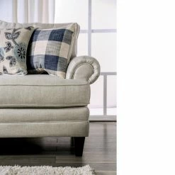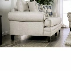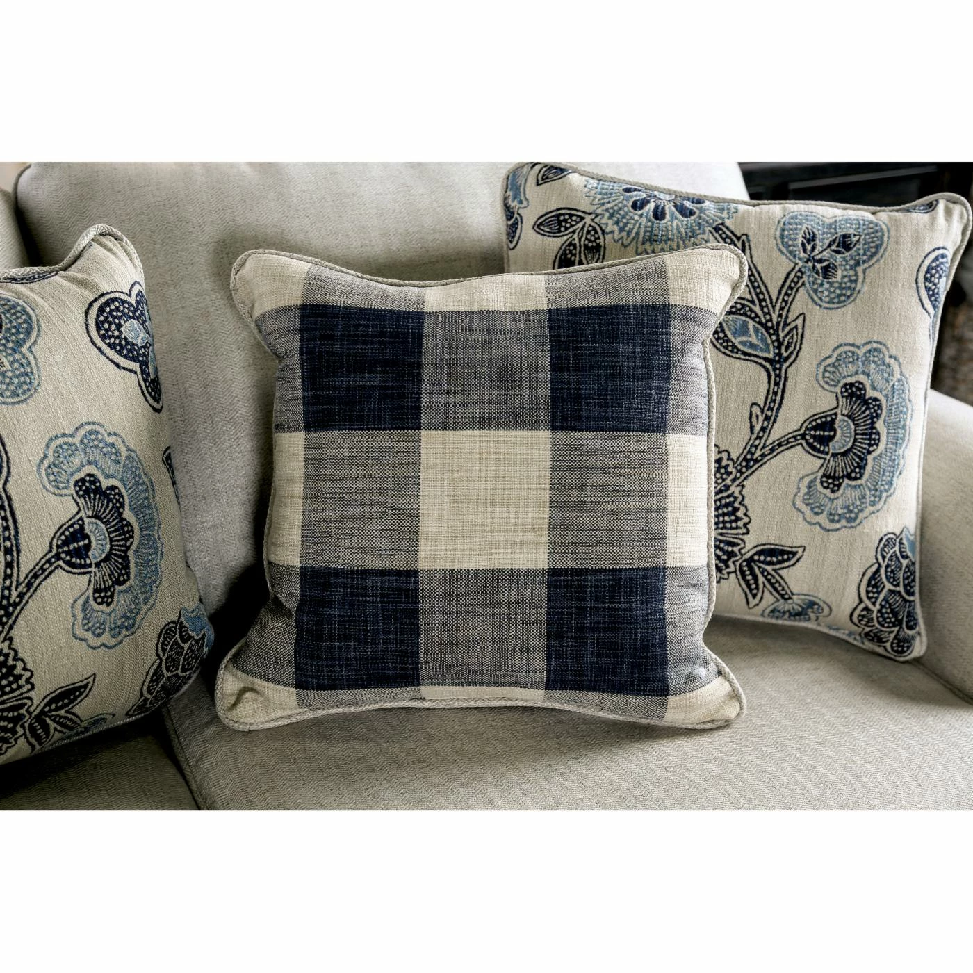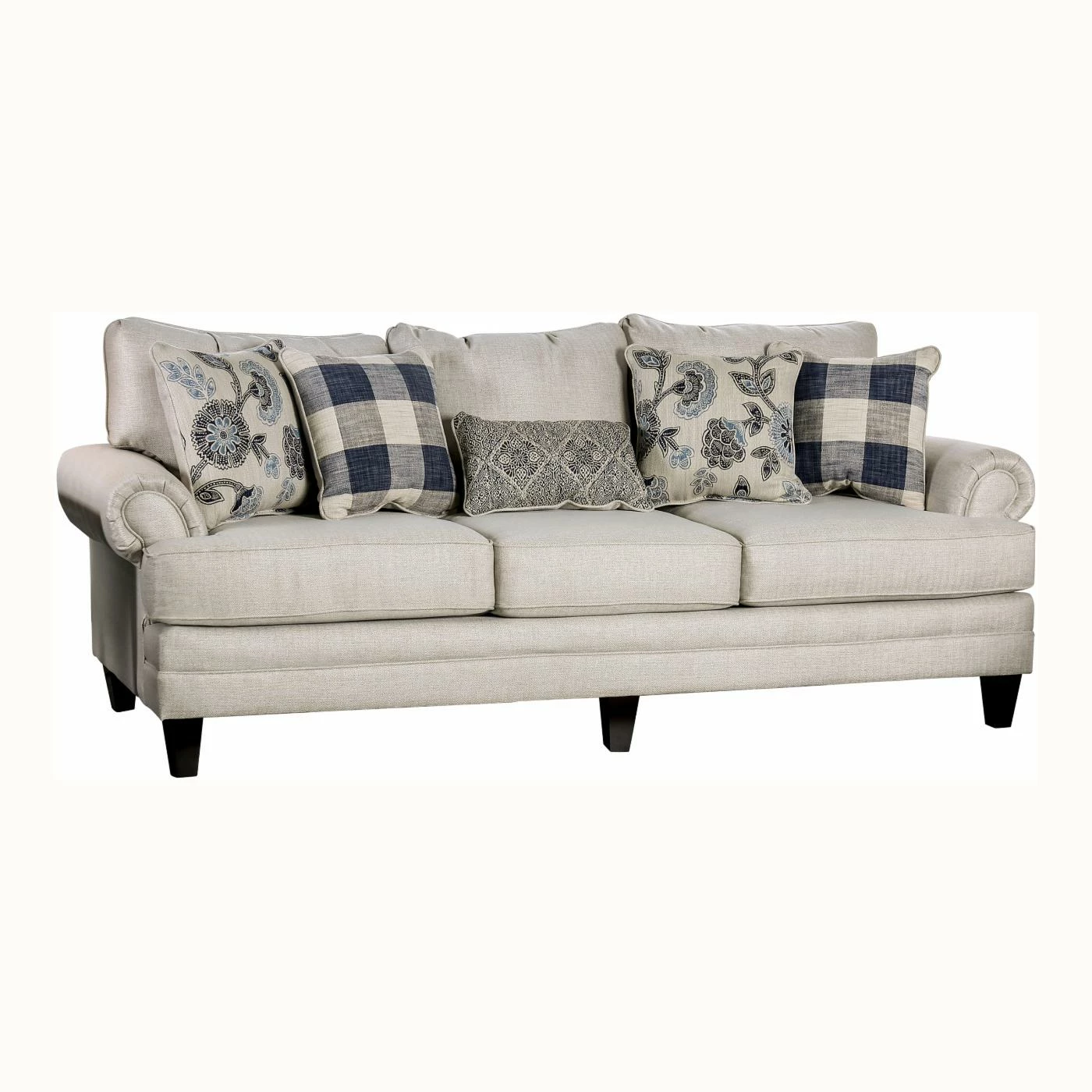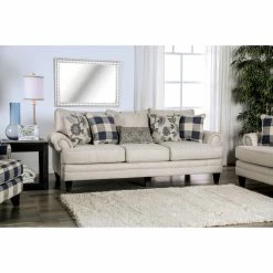 Snuggle up with a book or a loved one on the Furniture of America Deveraux T-Cushion Sofa. This comfortable couch has three cushions for maximum capacity – movie night just got a whole lot easier. Accent pillows are included in coordinating ivory and blue patterns, as well as a short lumbar pillow in an intricate diamond design. The linen-look upholstery comes in a woven beige color that’s easy to match, and the T-cushions and rolled arms add to the transitional silhouette. A solid wooden frame with wood veneers and comfy foam cushions make this sofa not just nice to look at, but easy to live with.