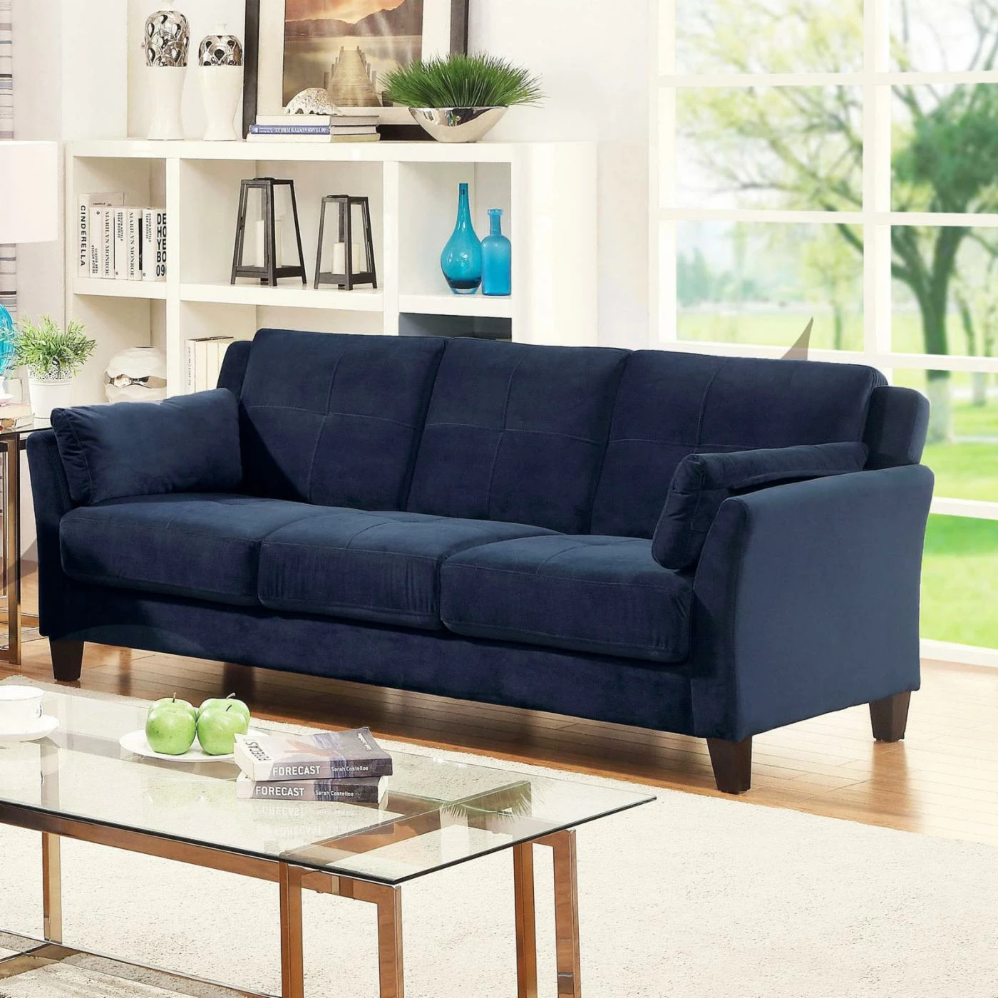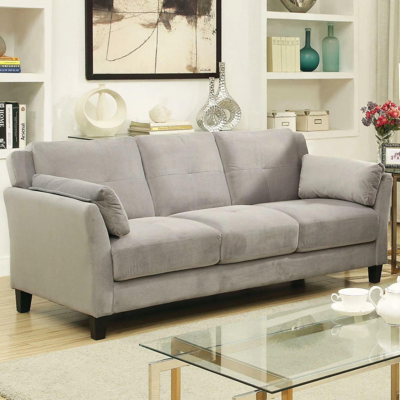 Create a comfortable living room by adding this Furniture of America Galvan Sofa. Its flannelette fabric upholstery is available in the sophisticated color of your choice. Contemporary design features include a tufted seat, slightly angled back cushions, and flared pillow top armrests. Tapered feet enhance the updated look of this sofa.