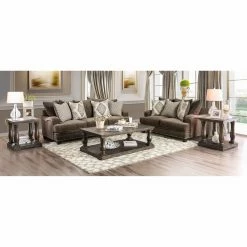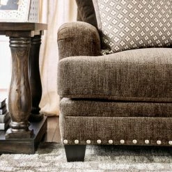 The Furniture of America Mitchell Brown Chenille Nailhead Sofa offers a wonderful upgrade for your living room or lounge design. Its wide frame easily seats up to three people and features curved armrests. The frame is built from wood, supported by dark brown block feet. Dense foam pads the cushions, upholstered with a dark brown chenille fabric. The sofa’s base is trimmed with large polished silver nailheads.