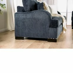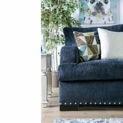 Settle into your new home or apartment with an easygoing allure thanks to the Furniture of America Pembrook T-Cushion Sofa. This wide sofa has casual lines a dark blue tone that matches your contemporary dรฉcor to a tee. Rugged wood constructs the frame, perched on block feet with a black finish. The cushions and frame come stuffed with high-density foam before being upholstered in gorgeous dark blue chenille. Polished silver nailhead studs border the base of the sofa.