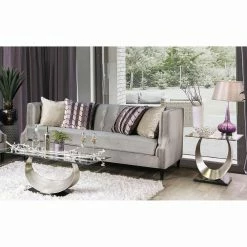 The high arms and glamorous mix of grey microfiber and nailhead trim give the Furniture of America Selena Contemporary Gray Tuxedo Sofa a sweet-yet-sexy style. This contemporary sofa offers deep seating bordered by a tall back and arms. The soft upholstery has a button-tufted, panel-style back and settee-style seat cushions. The hardwood frame is wrapped in layers of high-density foam. Silvery nailhead trim wraps around the shape and adds a touch of texture and drama to the design. Tapered hardwood feet with a black finish raise this piece up from the floor. Assembly required.