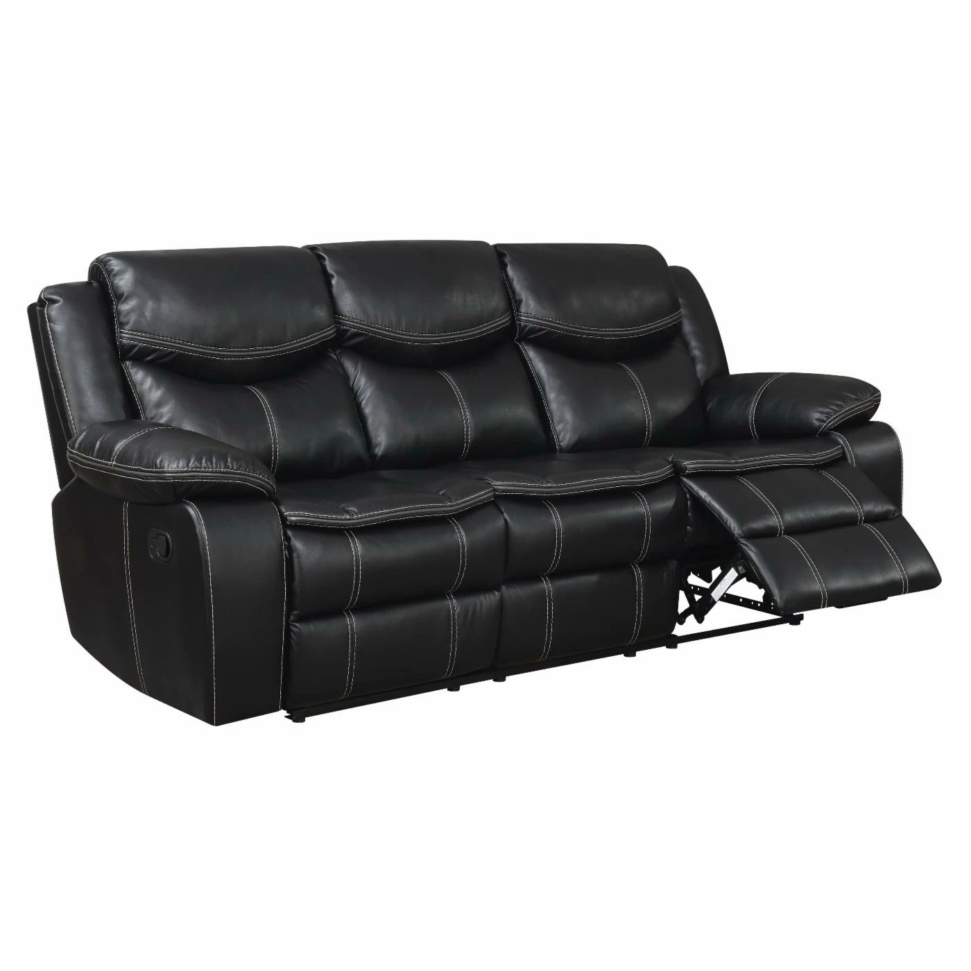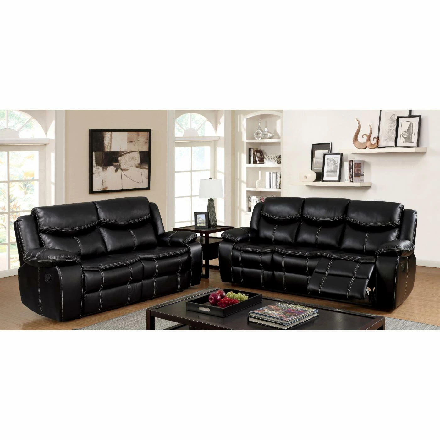 Style and comfort are front and center with the Furniture of America Siekka Transitional Style Leatherette Recliner Sofa. Upholstered in breathable black leatherette, this plush sofa features tufted back and seat cushions and overstuffed pillow armrests. Two built in recliners are easily accessible with levers on each side. Contrasting double stitched detailing completes the look of this piece.