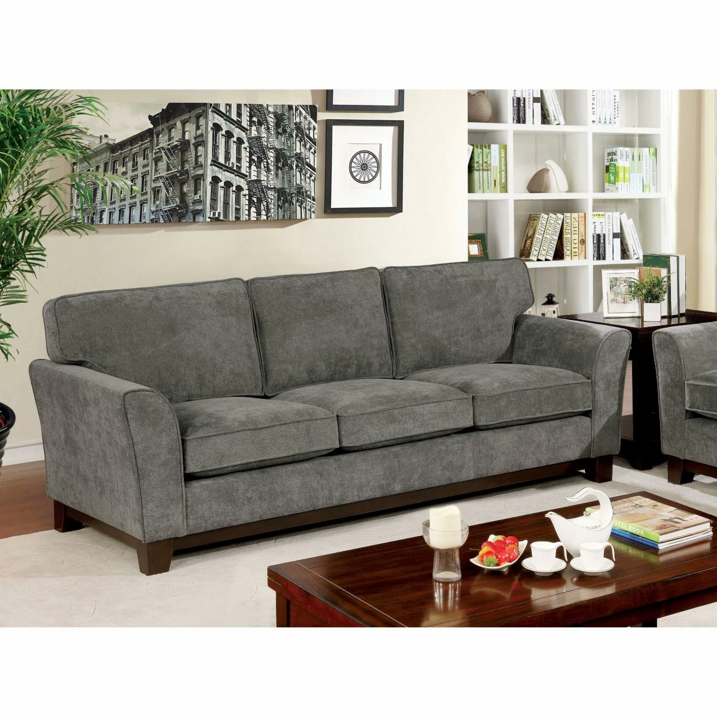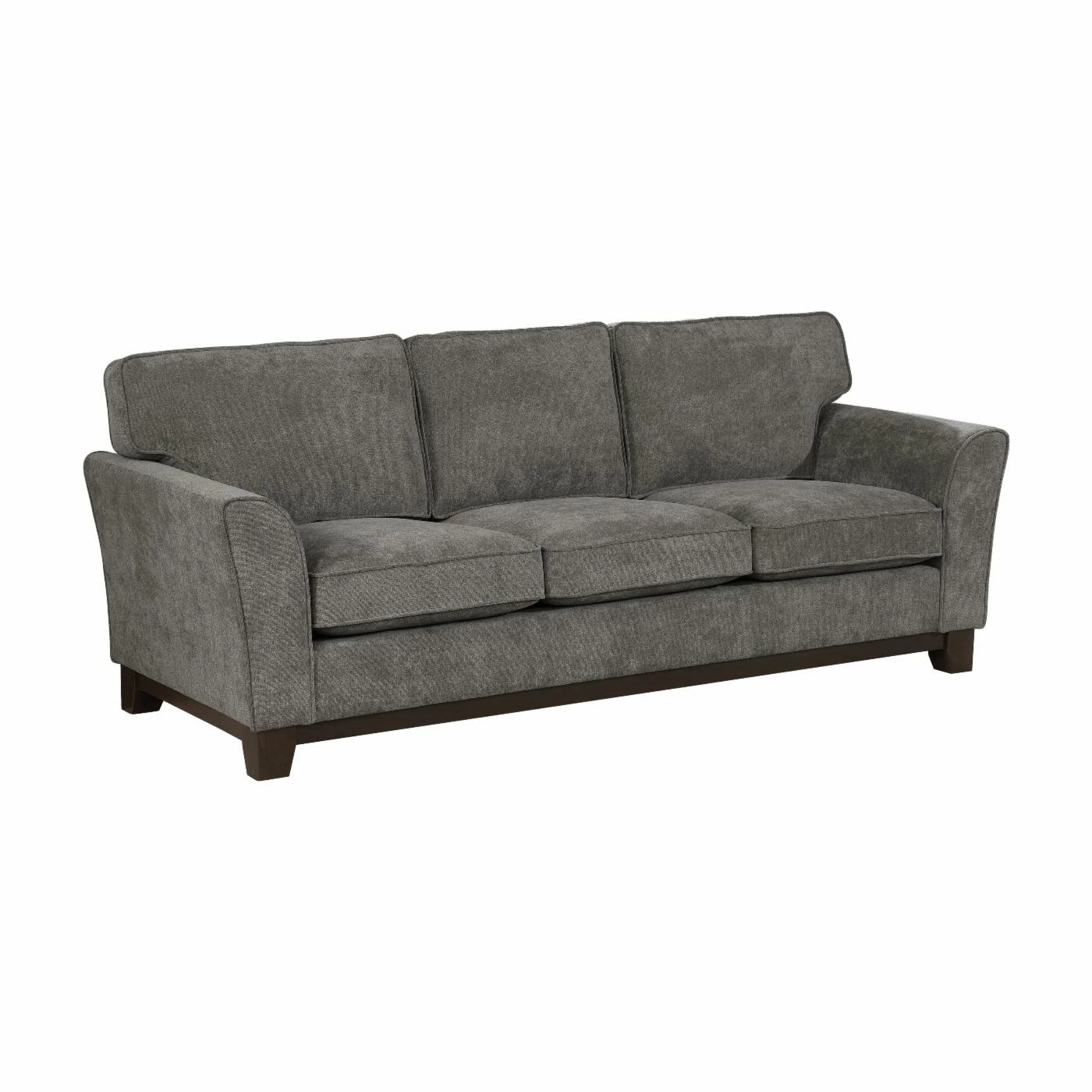 Sink into the padded seat and back cushions on the Furniture of America Zoe Flared Arm Sofa with your close friends. The tapered arms and solid wood frame are padded and upholstered with soft fabric that will have your guests lingering. The solid gray will easily match with your other furniture items. The tapered feet in brown add a sleek touch to the design.