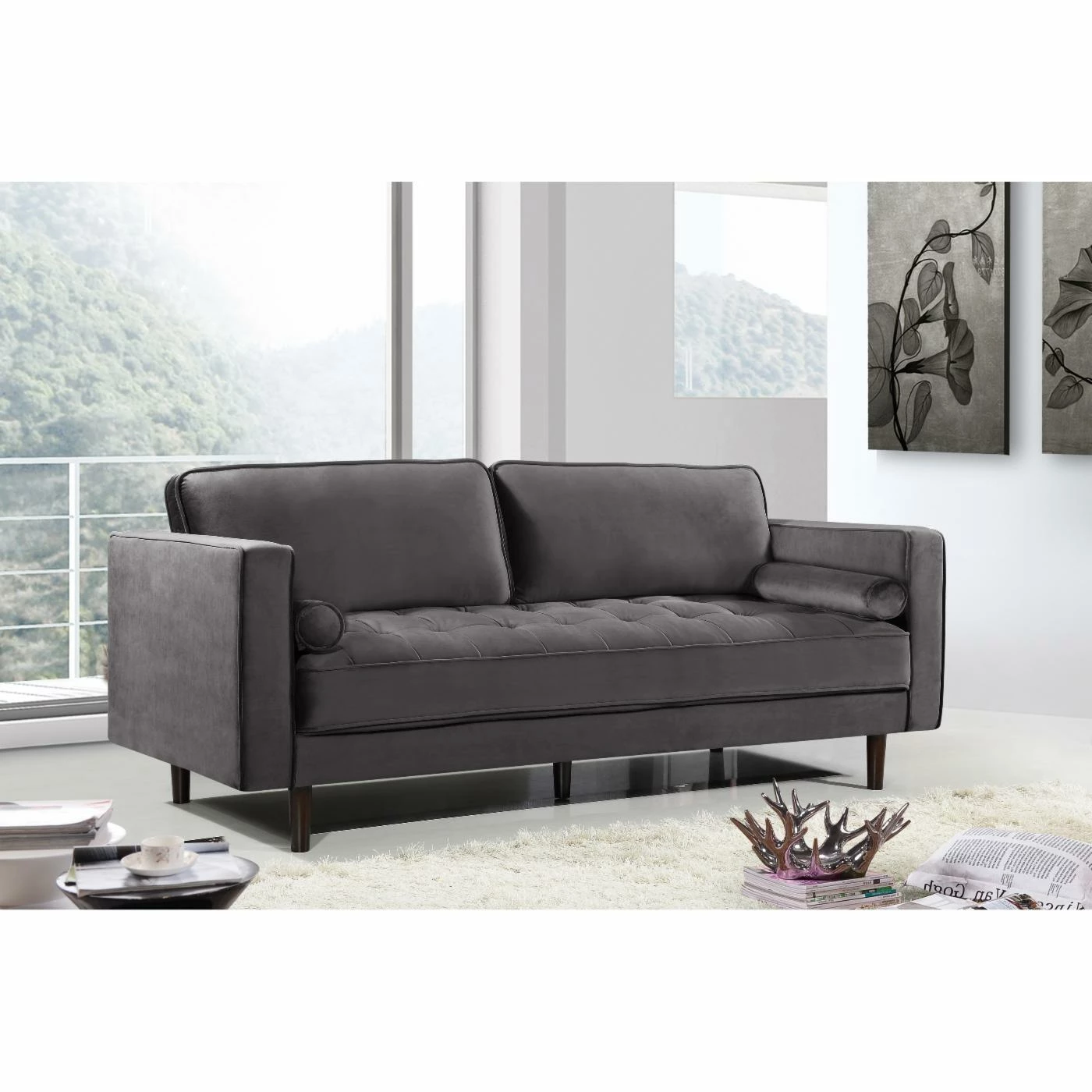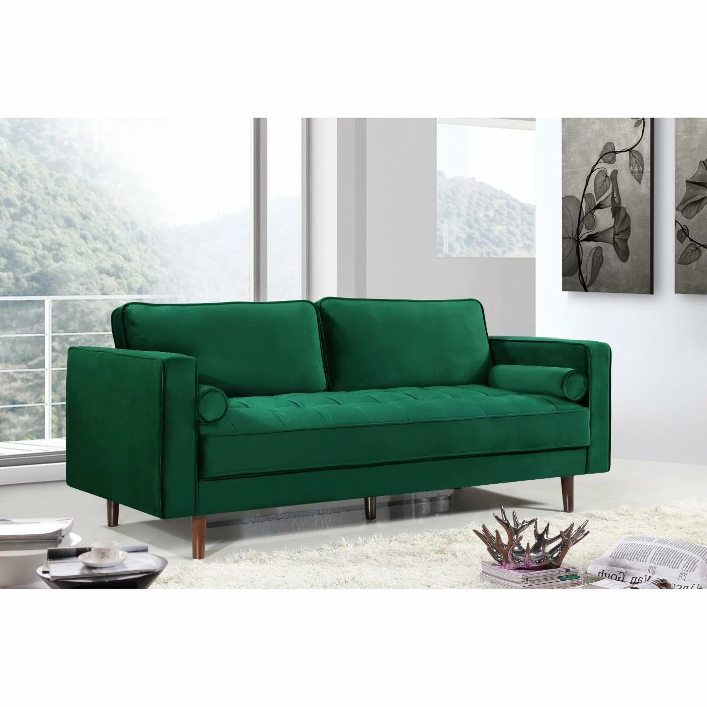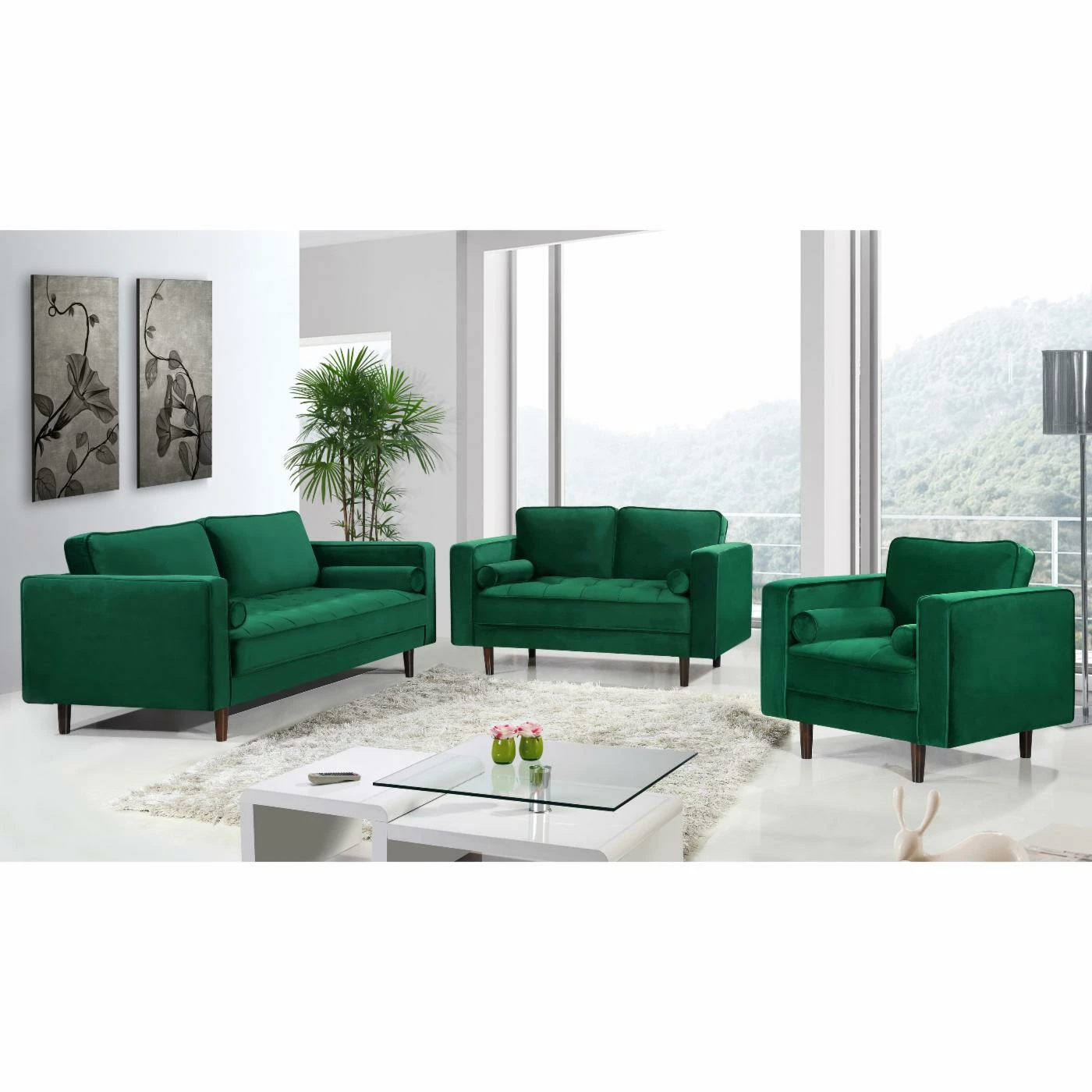 The plush cushions and modern design of the Meridian Furniture Inc Emily Velvet Sofa make it a comfortable and stylish addition to any home. With a durable metal frame designed to withstand the rigors of everyday use, this sofa is made to be used and admired. The velvet upholstery is accented by deep button tufting and wooden legs and comes in your choice of available colors. Two roll-style pillows provide extra back support when needed. Some assembly is required. This item matches other pieces in the Meridian Furniture Inc Emily Collection.