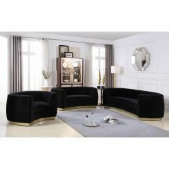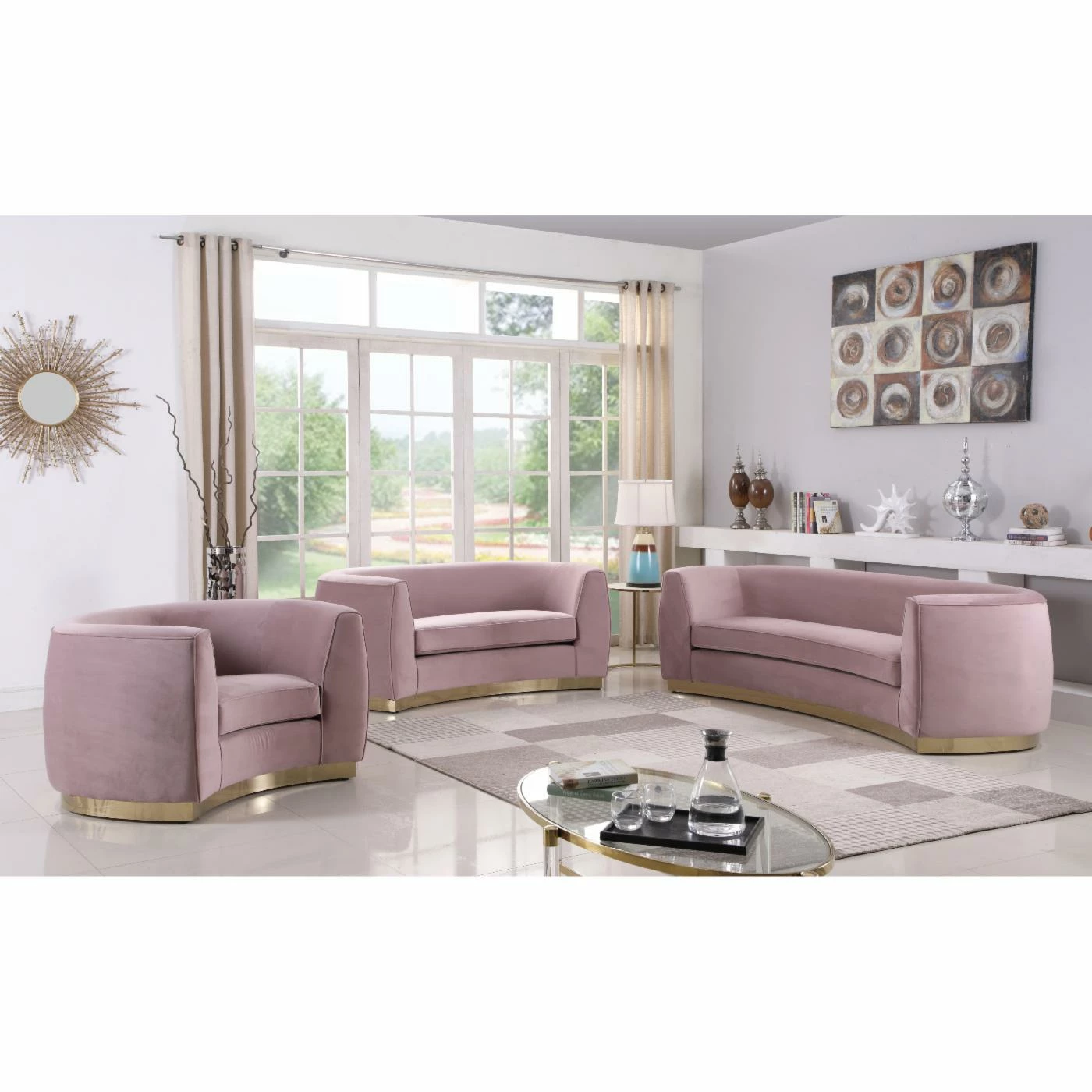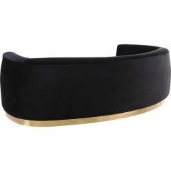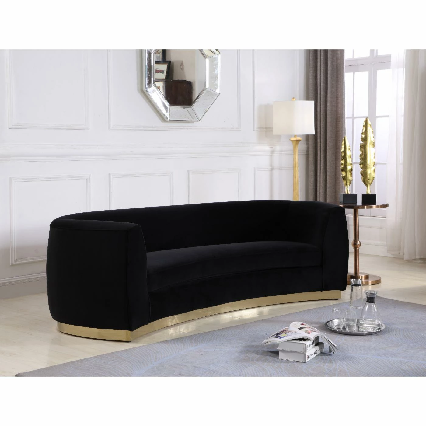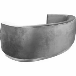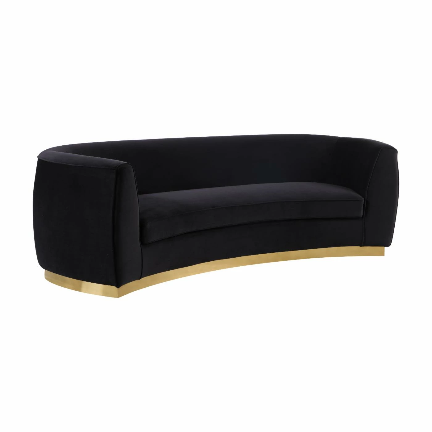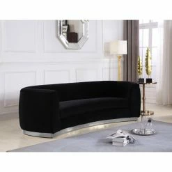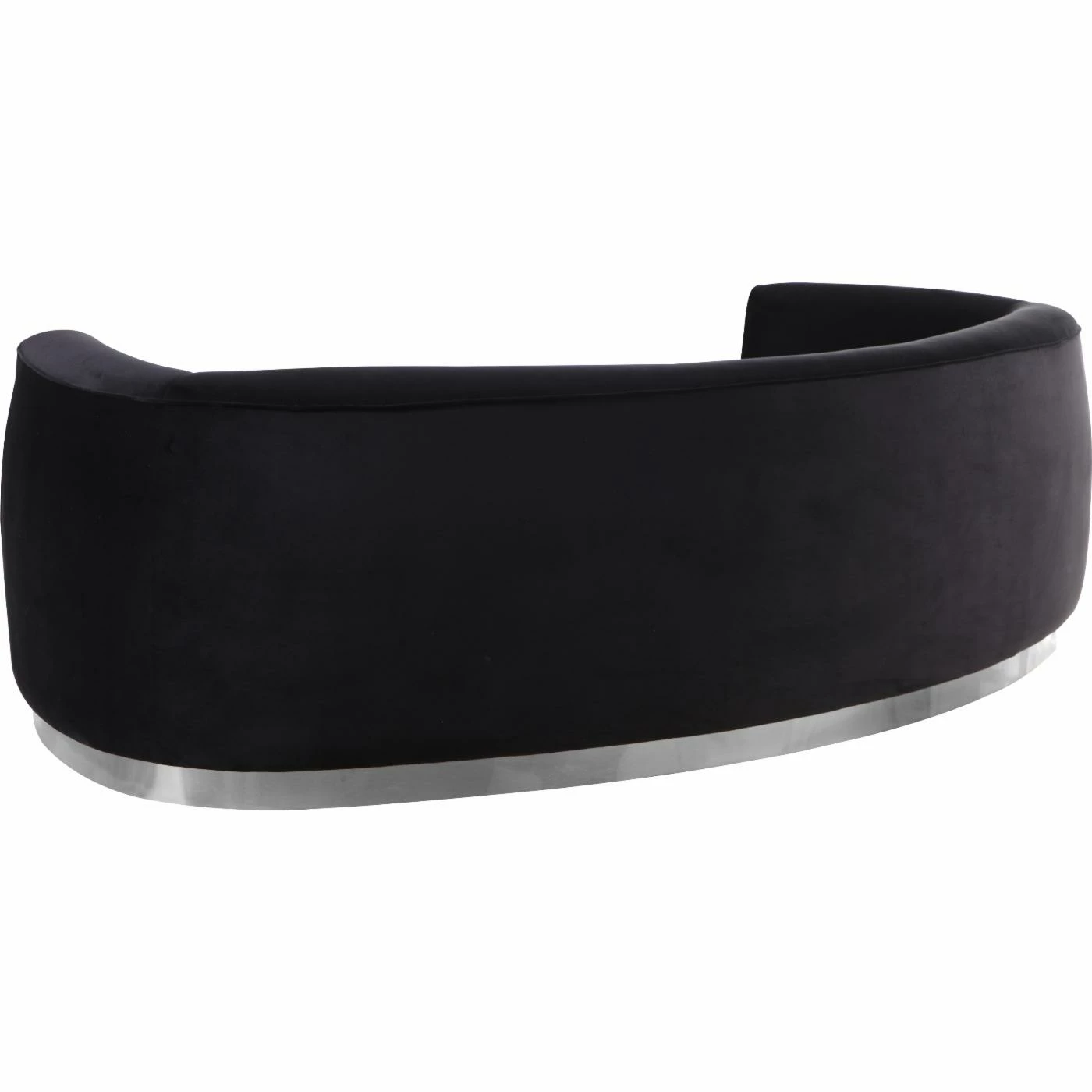 Hollywood Regency comes home in the Meridian Furniture Inc Julian Upholstered Sofa. A wide stainless steel band along the base adds glamour to this smartly curved sofa. The base is finished to match your choice of available velvet upholstery. Smart piping trim accentuates its curves.