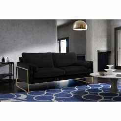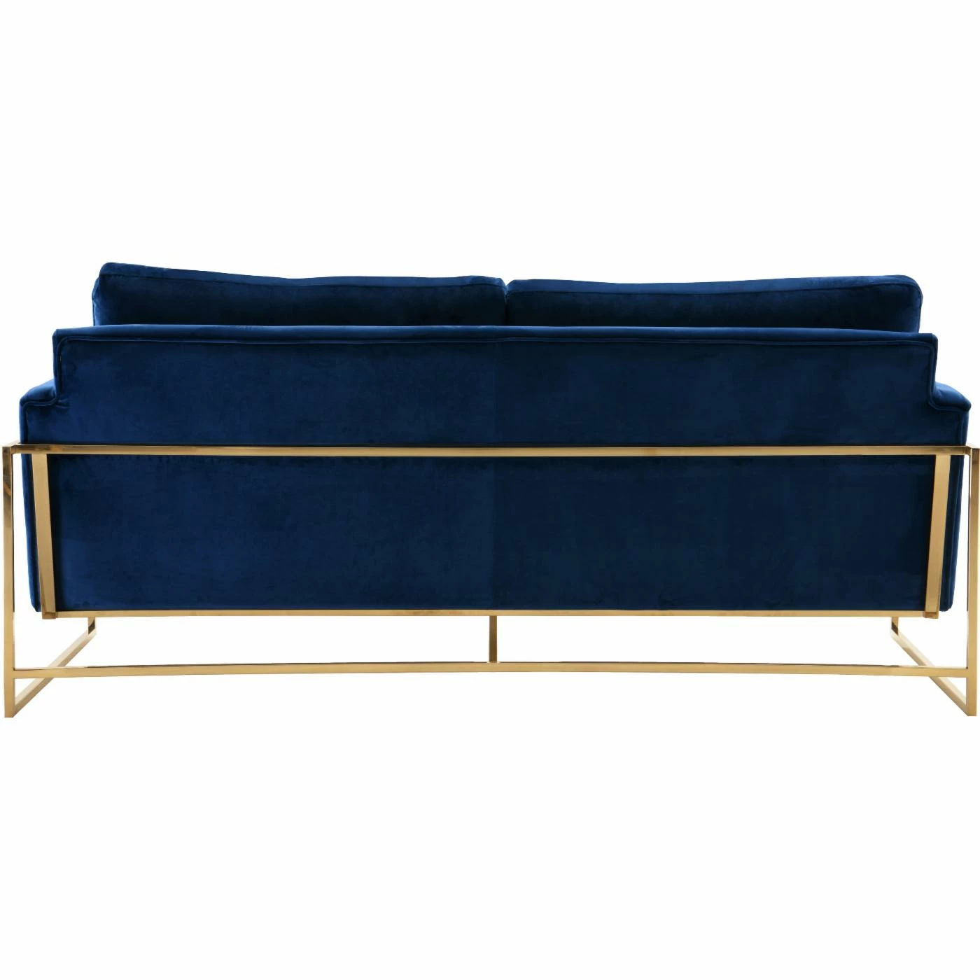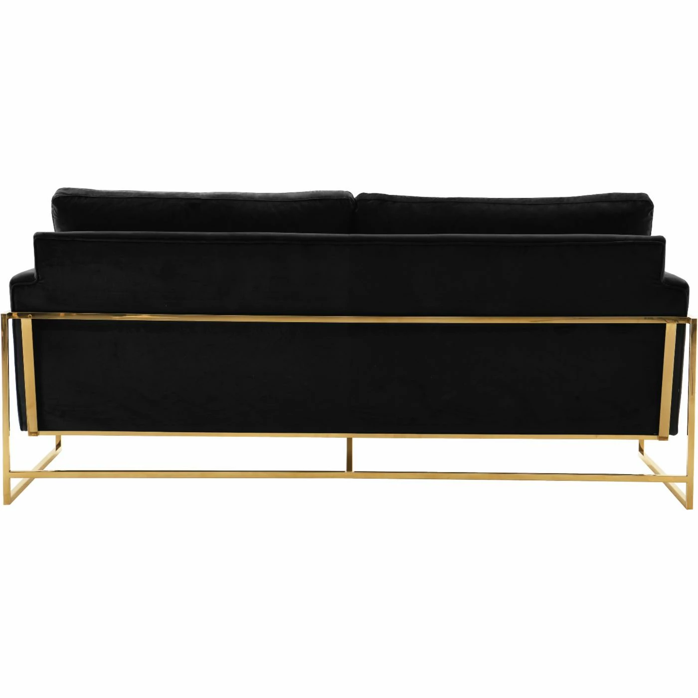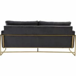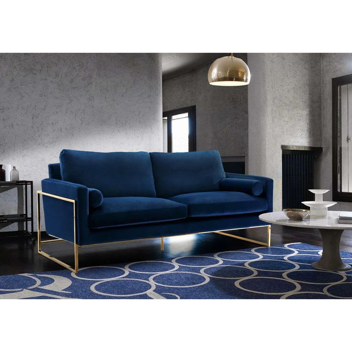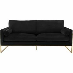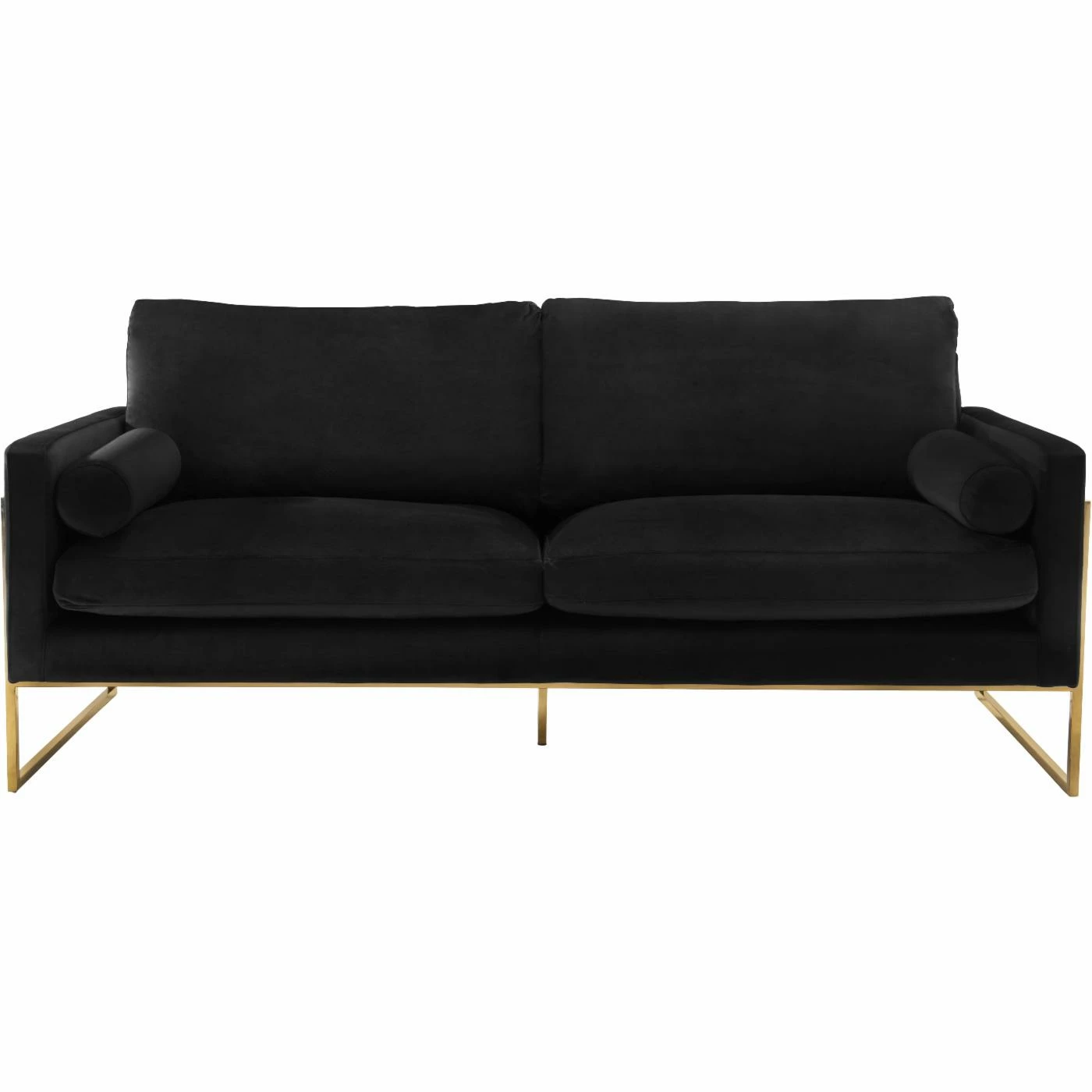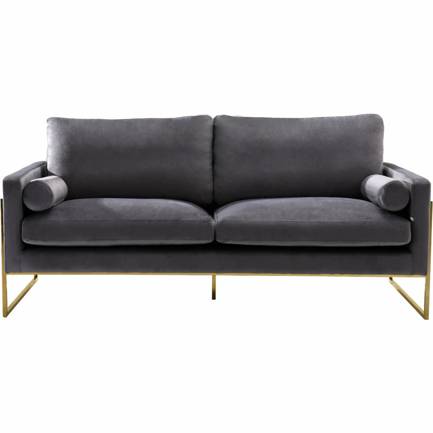 The Meridian Furniture Inc Mila Upholstered Sofa offers a glam take on mid-mod furniture. Delight in its velvet upholstery, which is offered in your choice of available colors. This sofa features an open sled style stainless steel base in a rich polished gold finish. Plush cushions and rolled accent pillow provide elegant finishing touches.