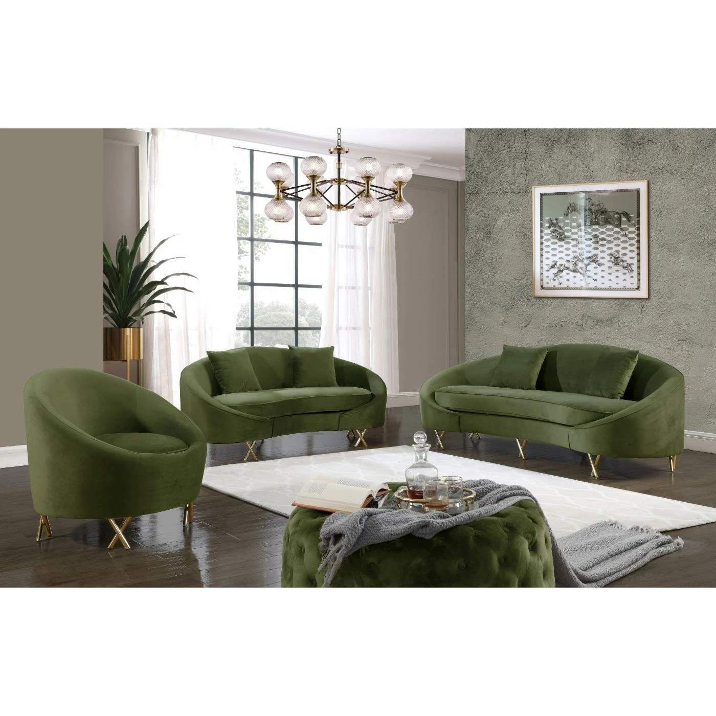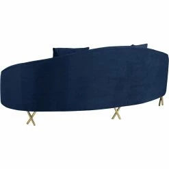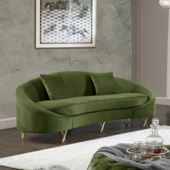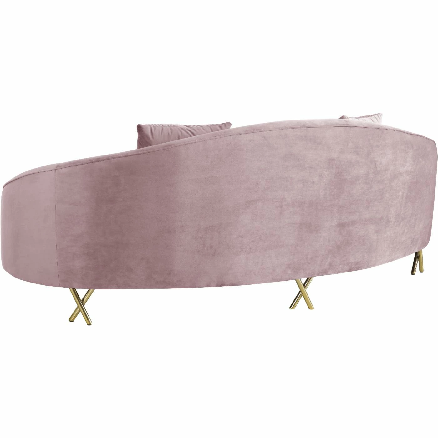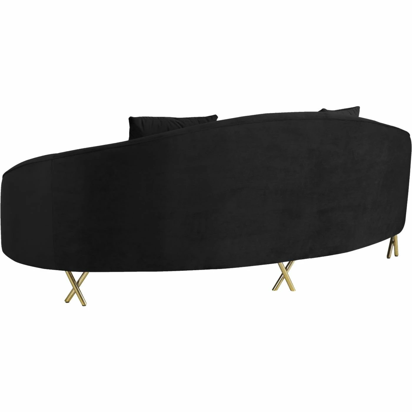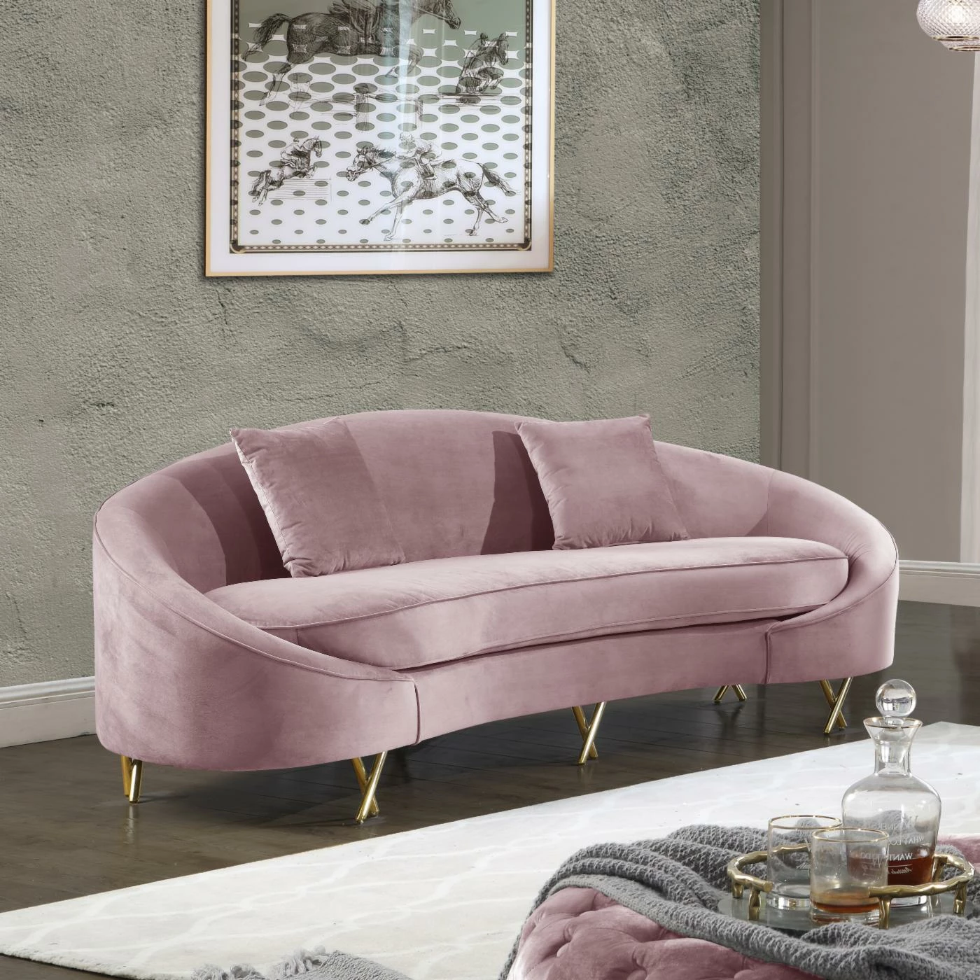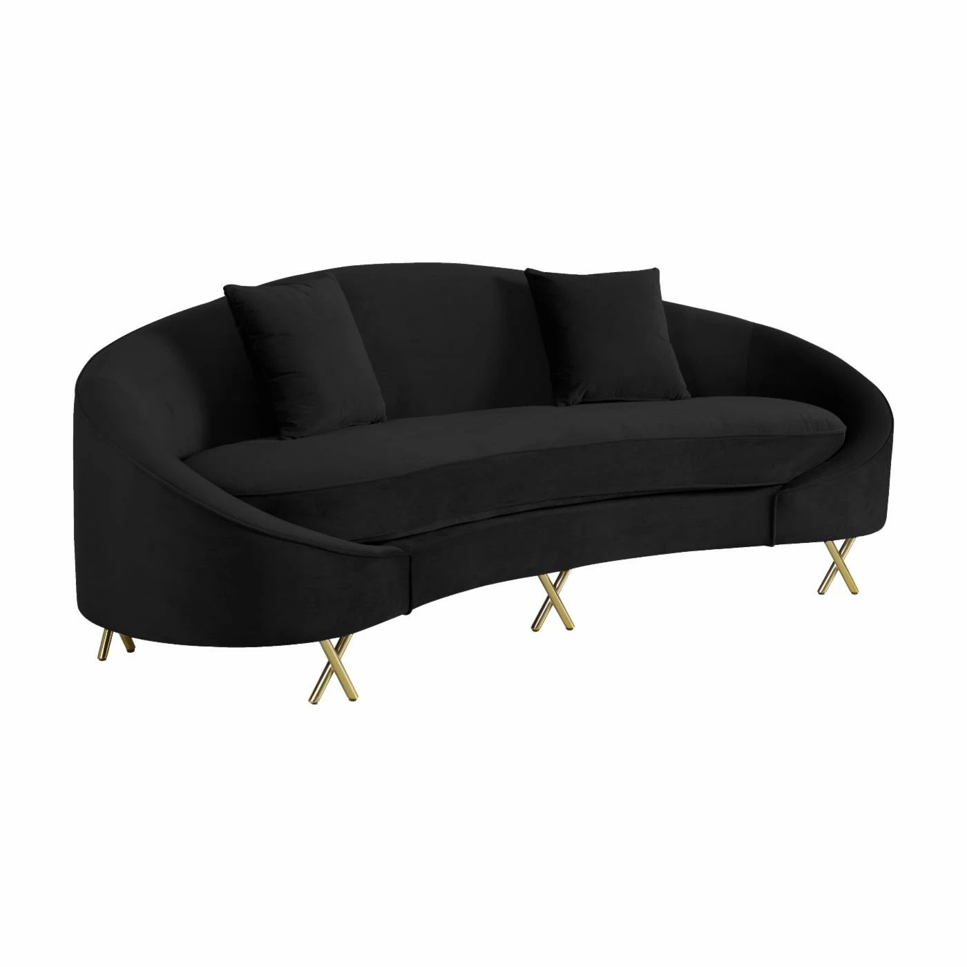 The shapely Meridian Furniture Inc Serpentine Upholstered Sofa has a curvaceous design wrapped in velvet upholstery for a contemporary take on Hollywood Regency style. The sofa sits on crossed steel legs finished in polished gold for an elevated look. Customize your luxury by choosing from available velvet colors. For a polished finishing touch, matching velvet accent pillows are included.