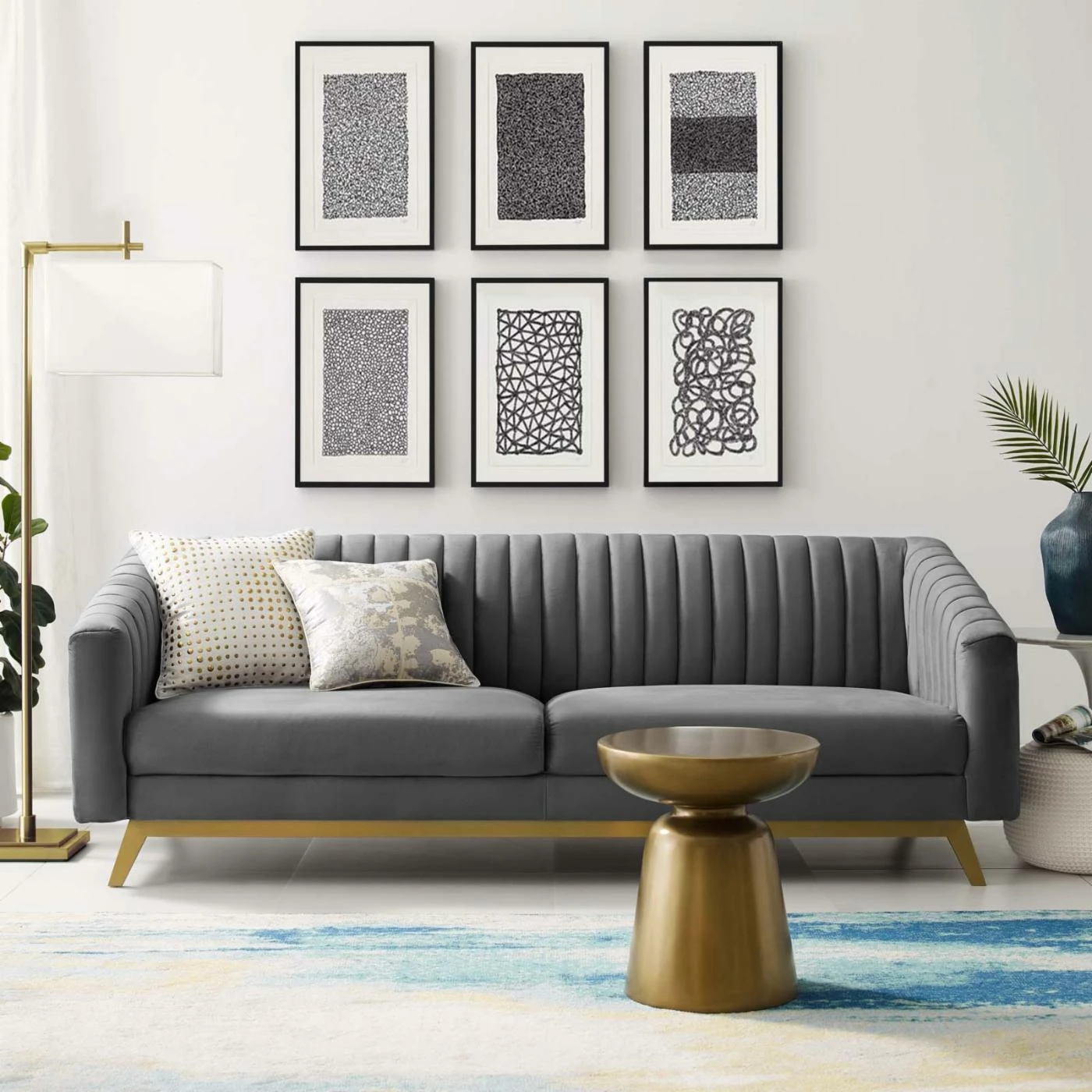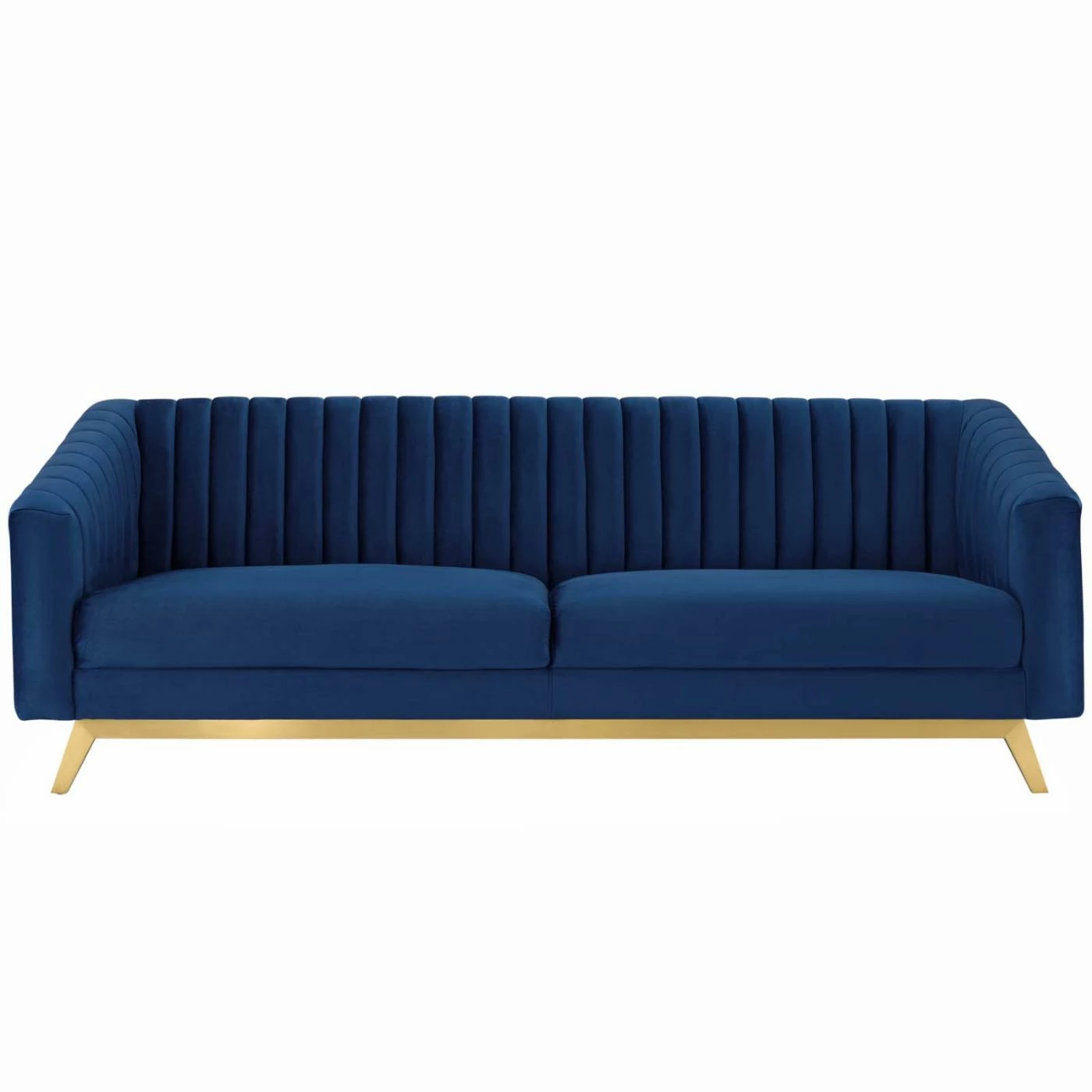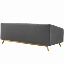 Find appreciation for the haute fashion of decades past with the Modway Valiant Vertical Channel Tufted Performance Velvet Loveseat. This wide sofa features a straight back and sloped arms supported by a wooden frame. The base rests on splayed legs, rendered from steel with a brushed gold finish. Ample layers of foam pad the frame, featuring pocket-coil springs in the seats that balance support and comfort expertly. Stain-resistant polyester velvet upholsters the soda, accented with vertical channel tufting and your choice of available color option. Non-marking feet protect your floor from damage.