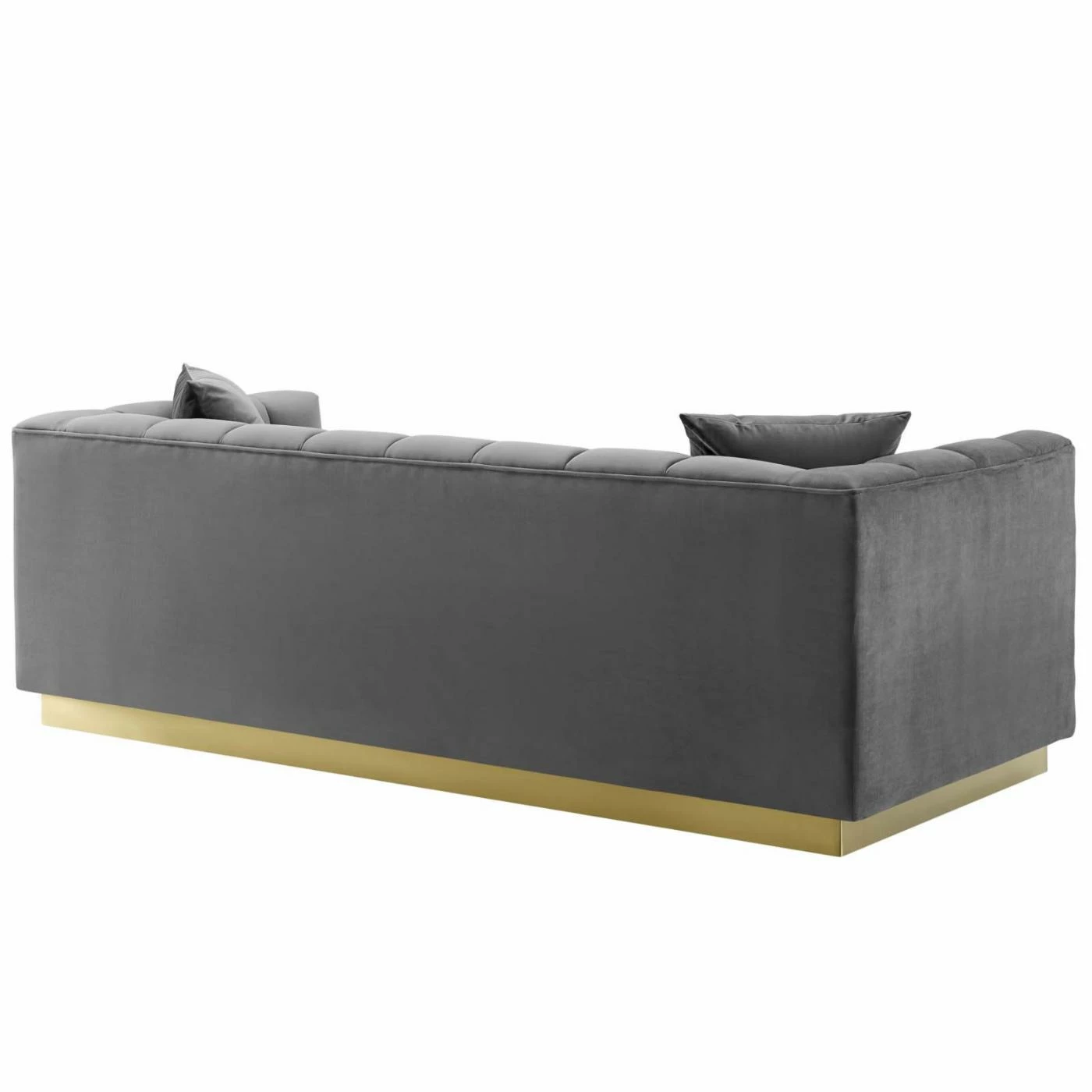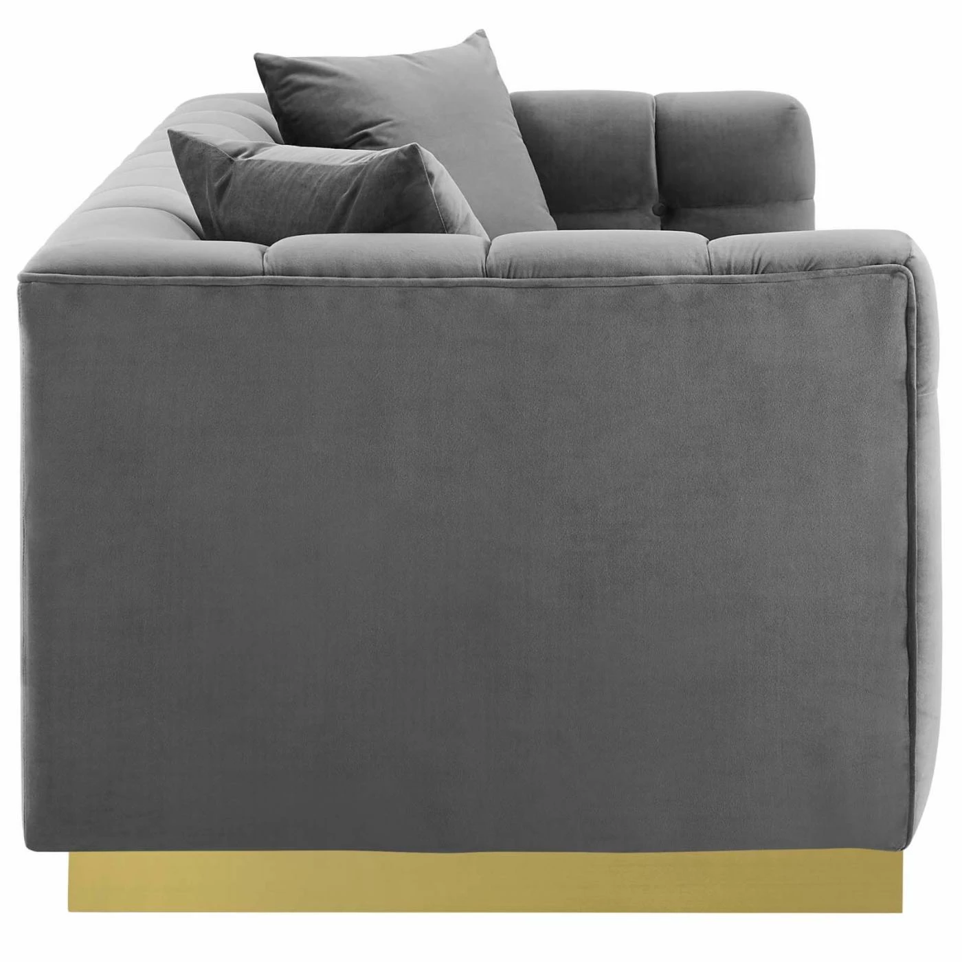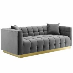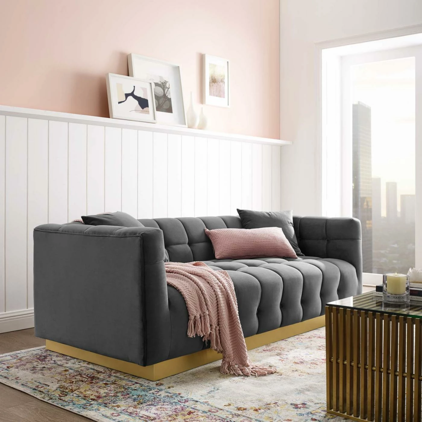 Start planning a new relaxed-yet-refined look to your living room with the Modway Vivacious Biscuit Tufted Performance Velvet Sofa. Taking inspiration from glam mid-century pieces, the sofa has a tuxedo-style seat made from wood and supported by a block steel base. High-density foam pads the piece, upholstered in durable, soft, and stain-resistant performance velvet. Deep biscuit-tufting accents the fabric’s surface. A polished gold finish tops the base. The seat cushions feature superior support and comfort thanks to pocket-coil springs. Choose among the available fabric color options to perfectly match your dΓ©cor.