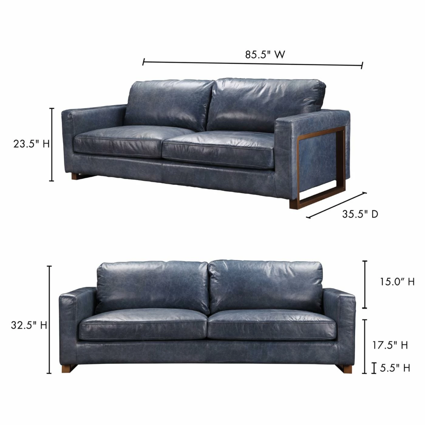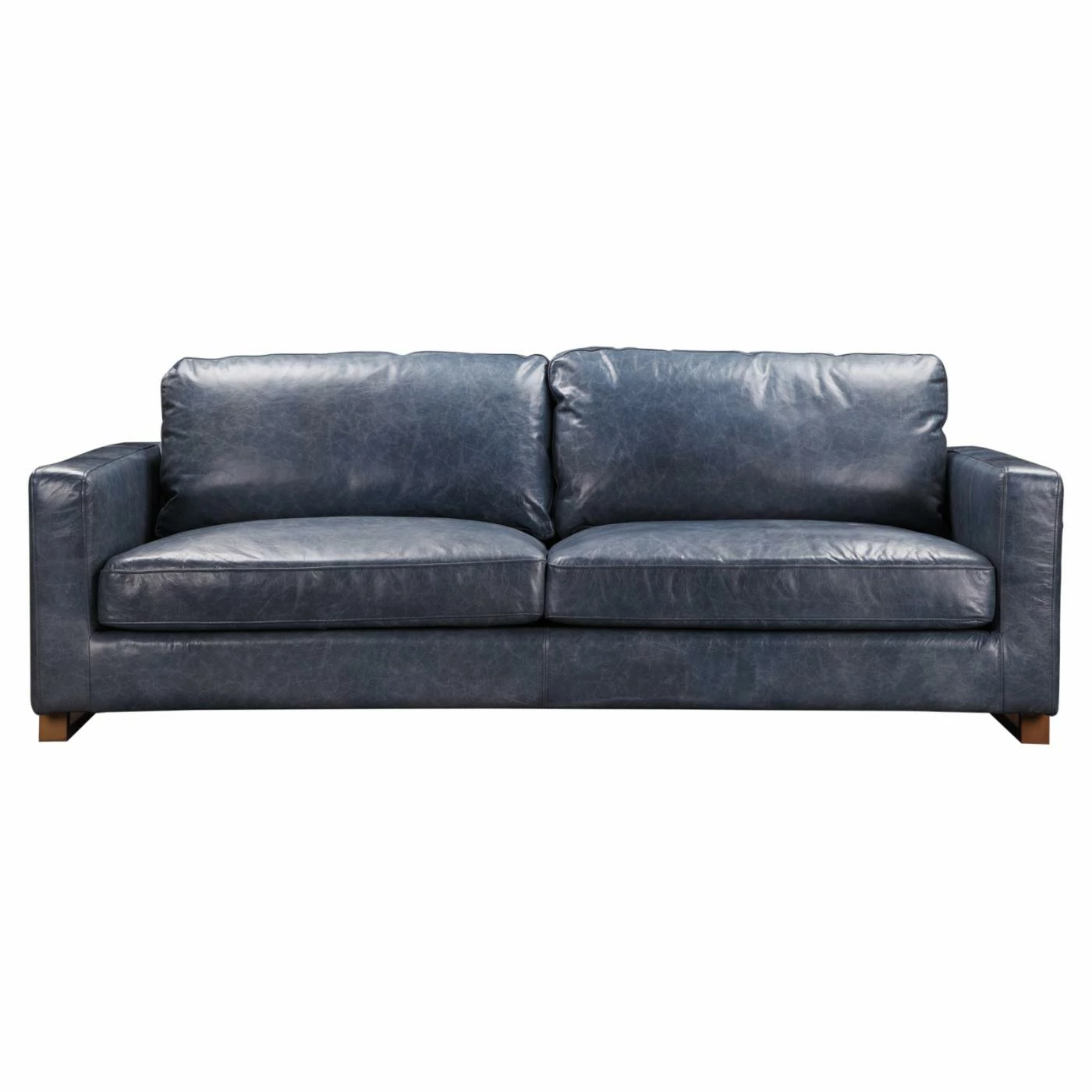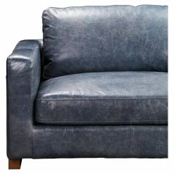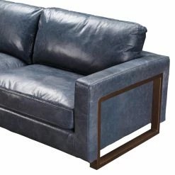 Contemporary design can also feel comfortable, and the Moes Home Collection Nikoly Sofa proves it. This sofa features a durable birch wood frame that’s upholstered with navy blue top-grain leather. Split-style seat and back cushions are padded with foam. It’s supported by iron sled legs in an antique brass finish. The natural leather is protected by a waxed finish to prevent spills from staining.