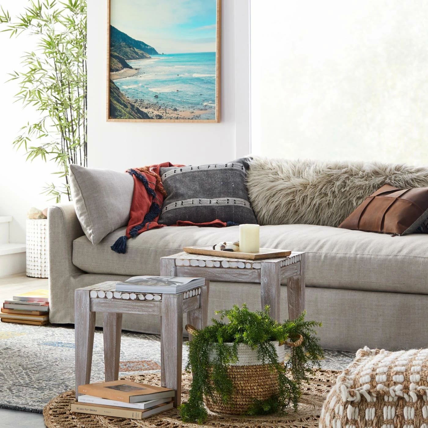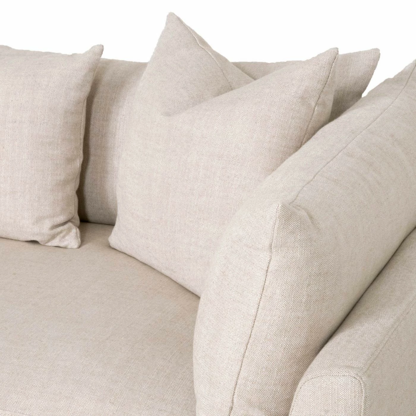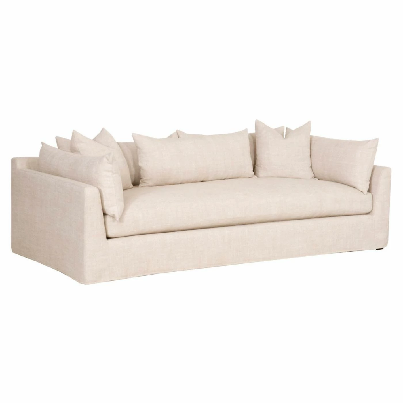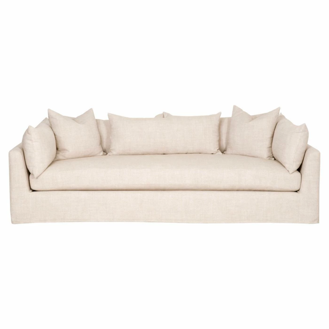 Minimal lines allow the Orient Express Furniture Haven Lounge Slipcover Sofaβs softness to take center stage. And plenty of it piles into the lean, high-armed frame thatβs crafted with wood and fully upholstered in light beige fabric. The single long, reversible seat cushion gets loft from a down and plump polyester fill; the cushion also has ties to ensure secure positioning. Seven plush back pillows filled with 100% down are included. Plus, the sofa arrives fully assembled and with a one-year limited manufacturerβs warranty.